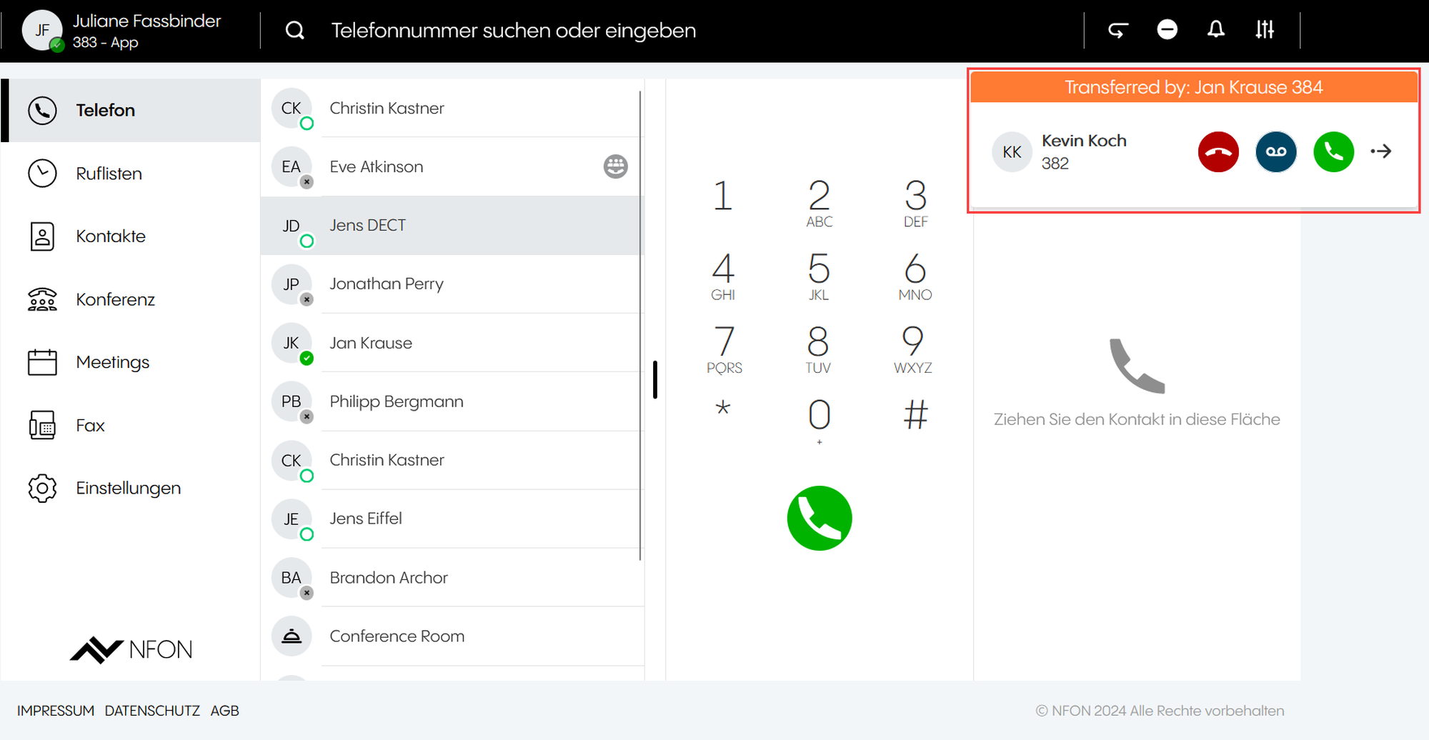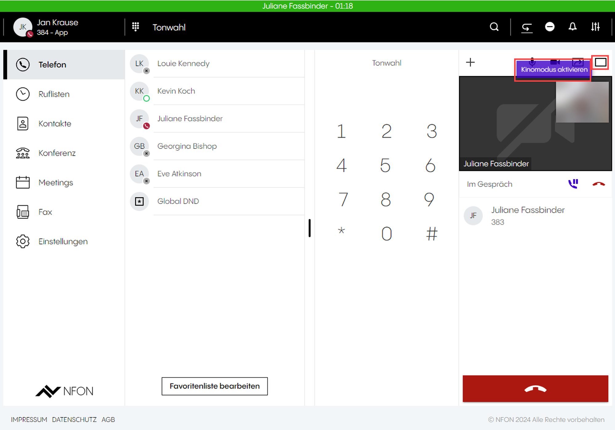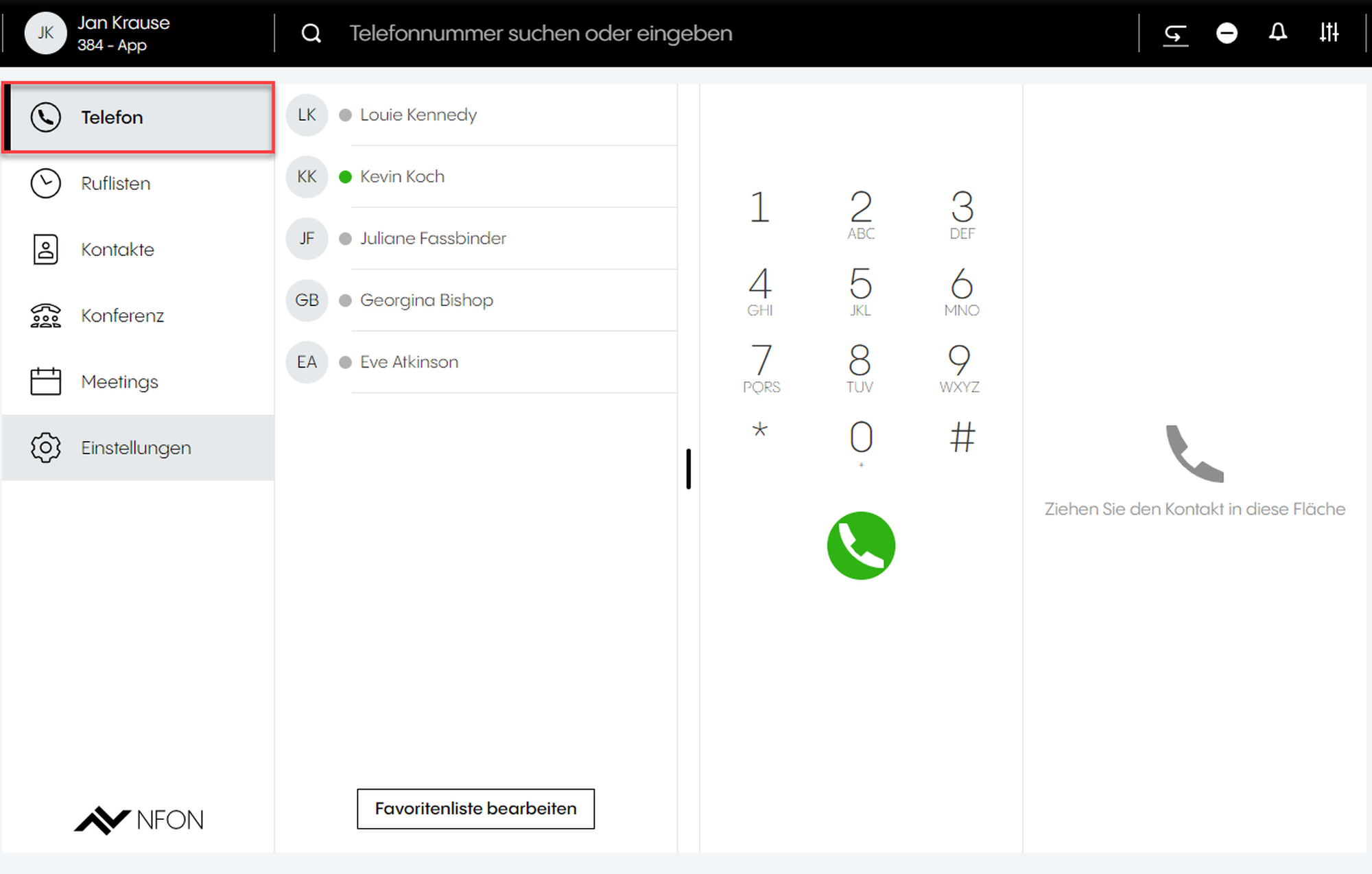 Ist das App-Menü eingeklappt, sehen Sie oben links Ihren Namen und das ausgewählte Endgerät, mit dem Sie telefonieren.