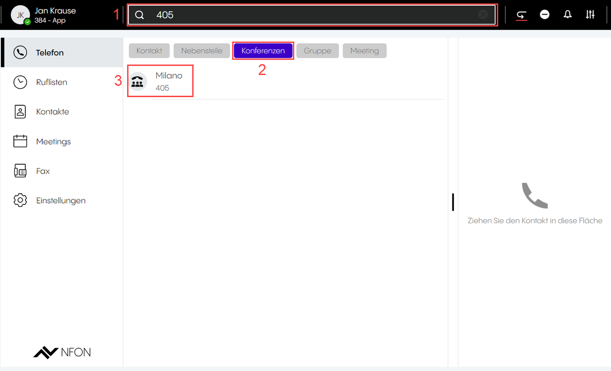 Über die Suchleiste können Sie Kontakte, Nebenstellen, Konferenzen, Meetings und Gruppen durchsuchen. Die Suchergebnisse werden nach diesen Kategorien geclustered dargestellt.