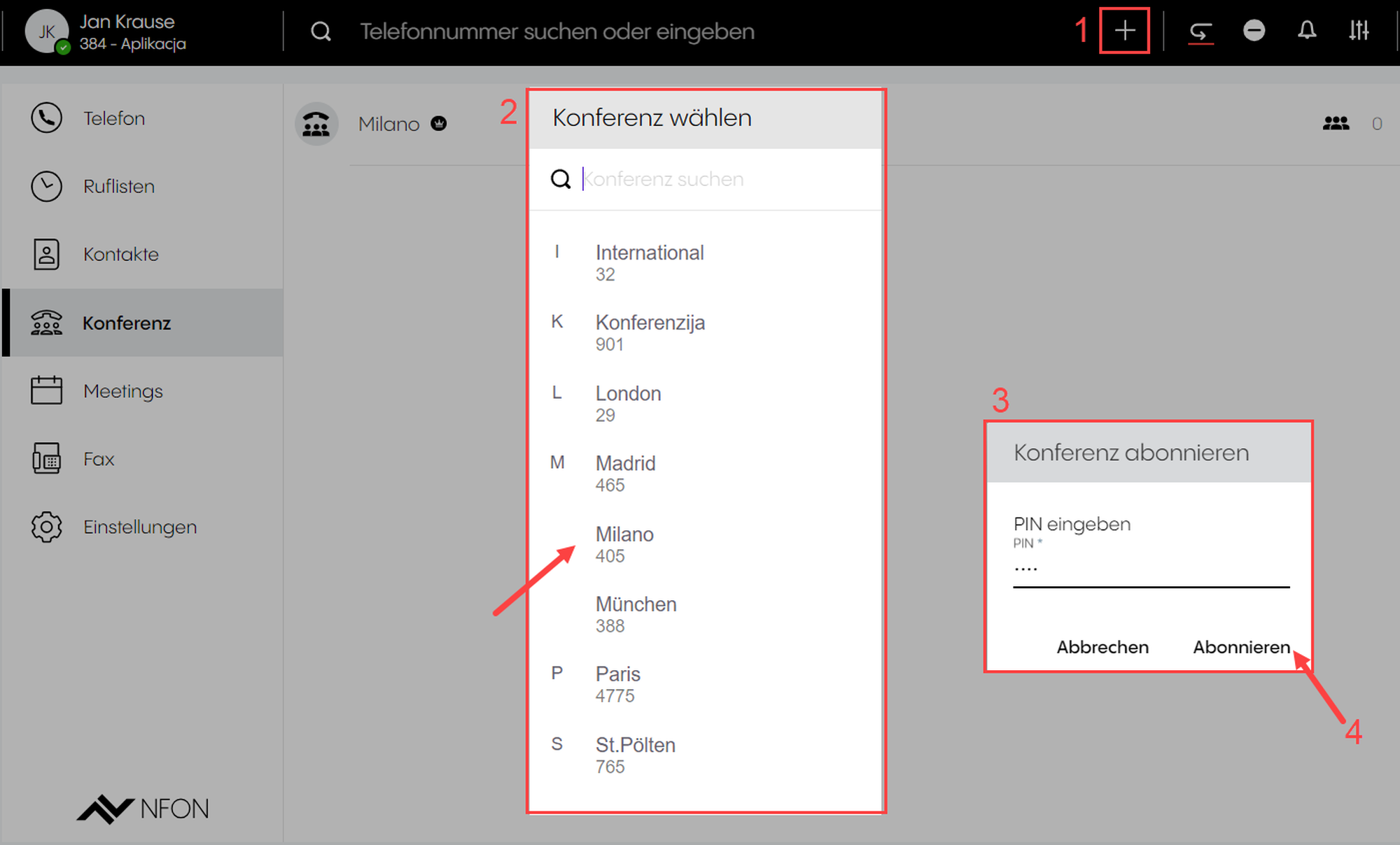 oder verbunden mit einem Teilnehmer, der der Besprechung bereits beigetreten ist. In diesem Fall werden ZWEI Clients mit dem Nutzer verbunden. Dies kann für Konferenzräume mit Audiokonferenzgeräten verwendet werden.