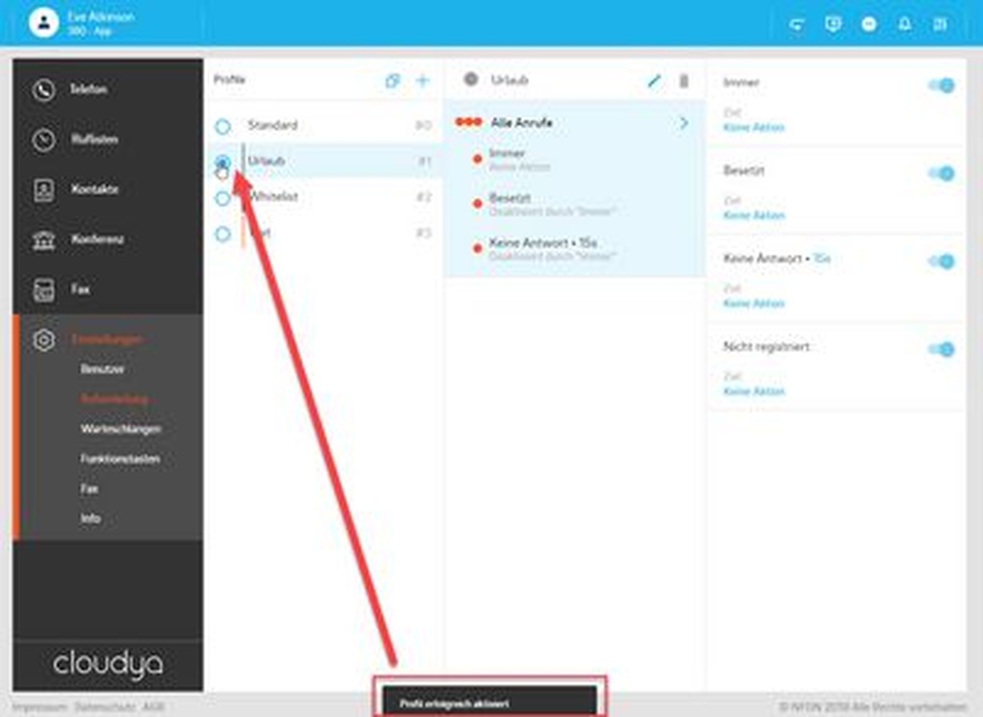 | Rufumleitung: Wählen Sie das Rufumleitungsprofil, das Sie aktivieren möchten. | |