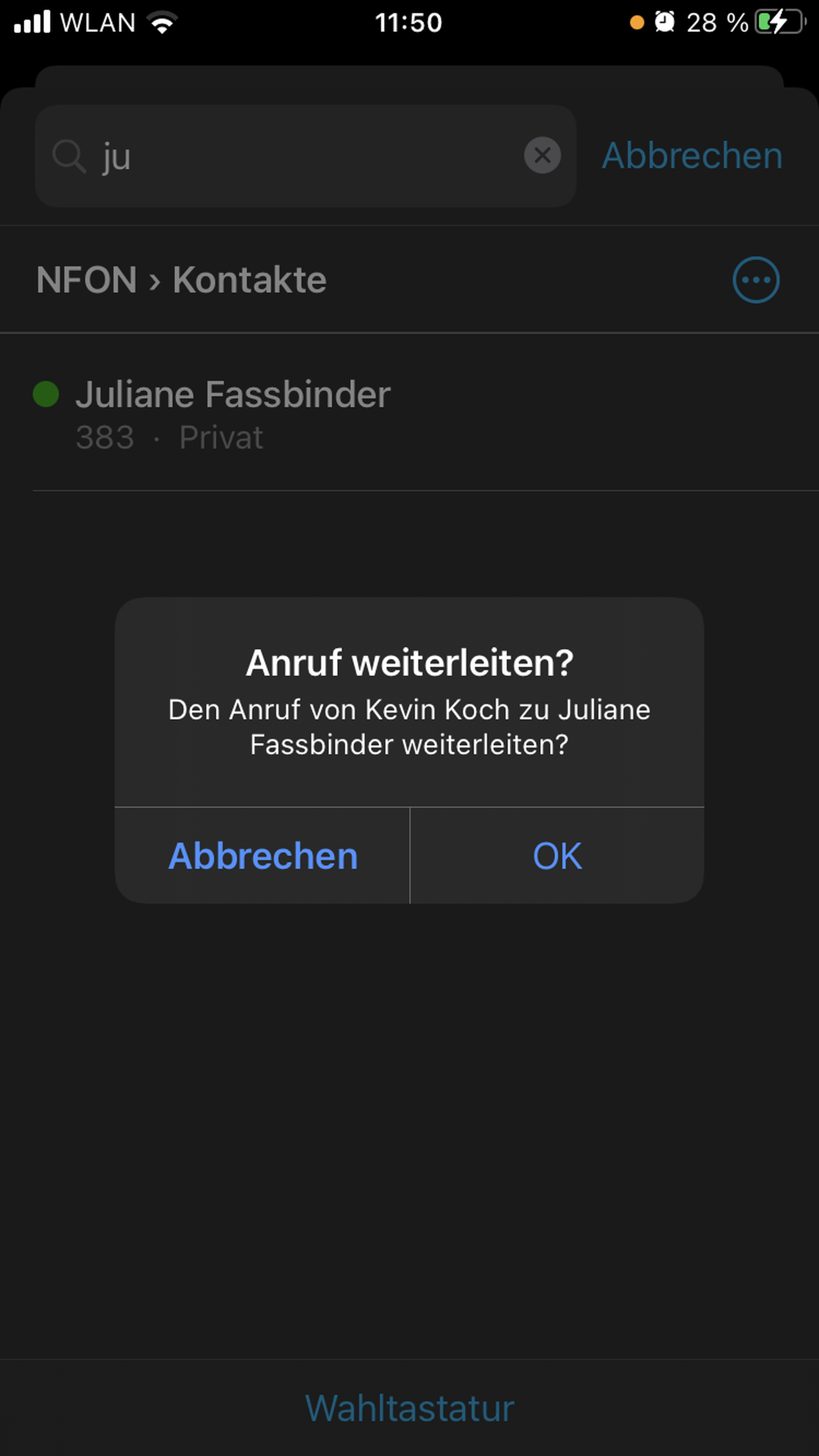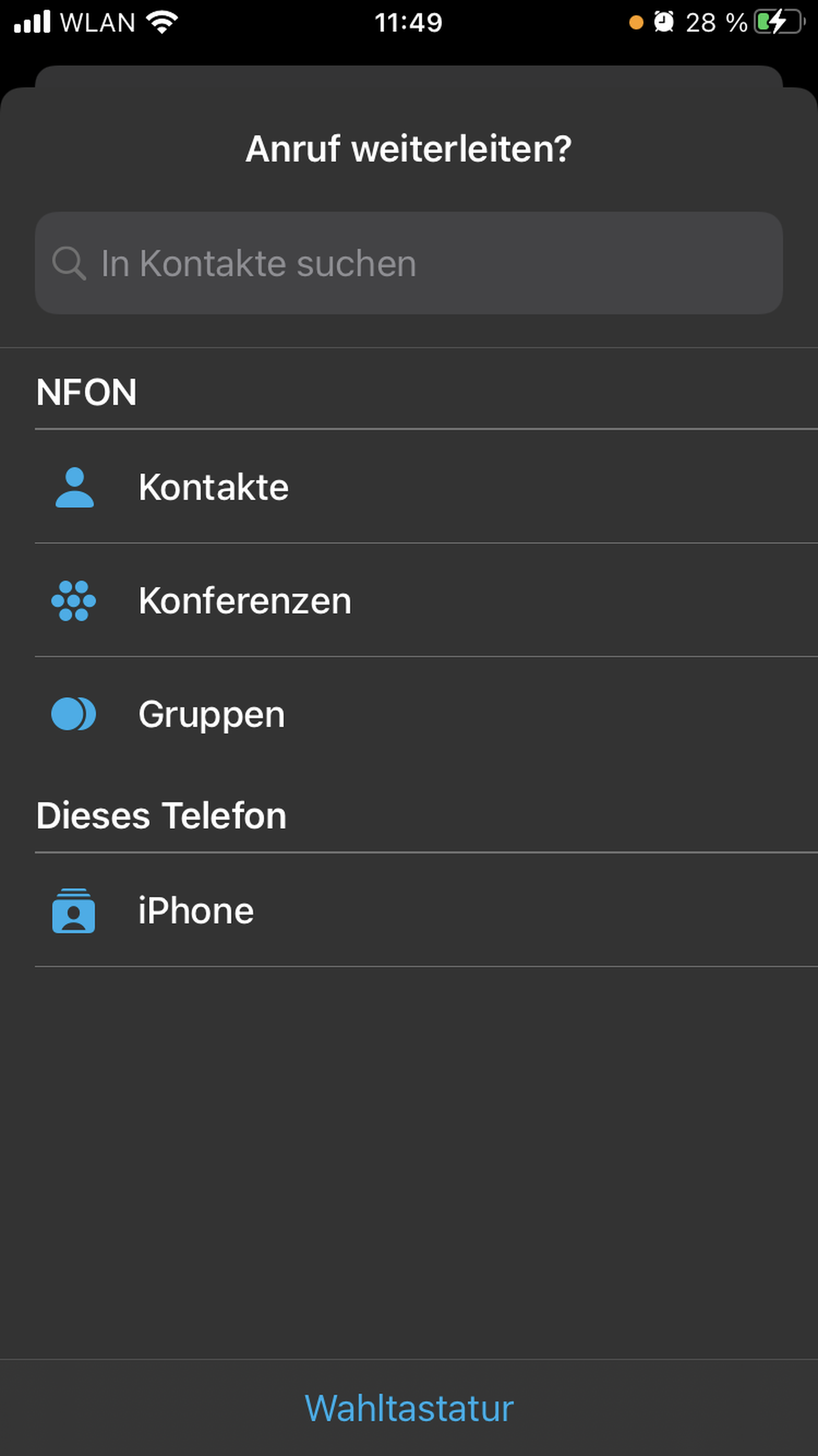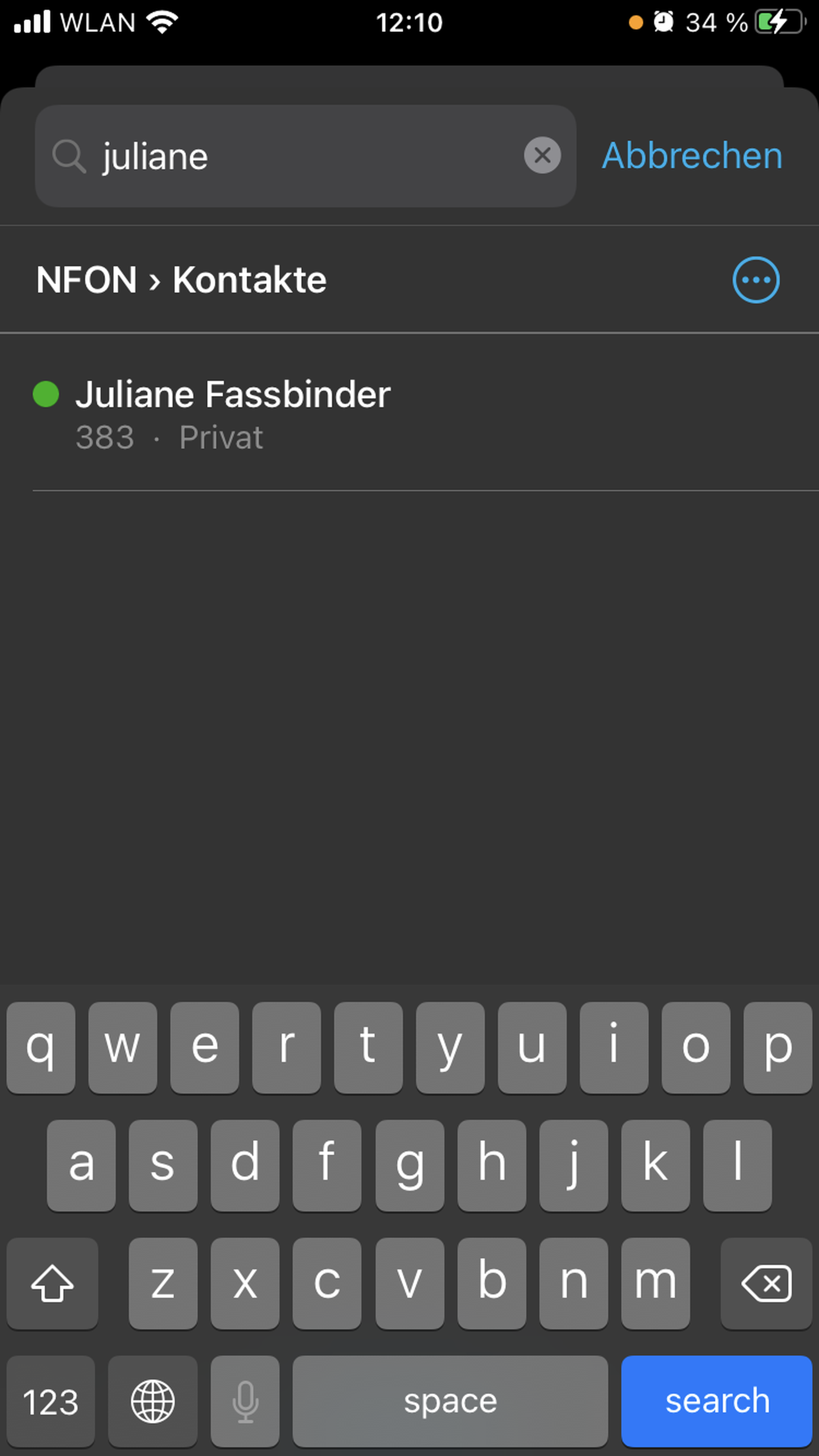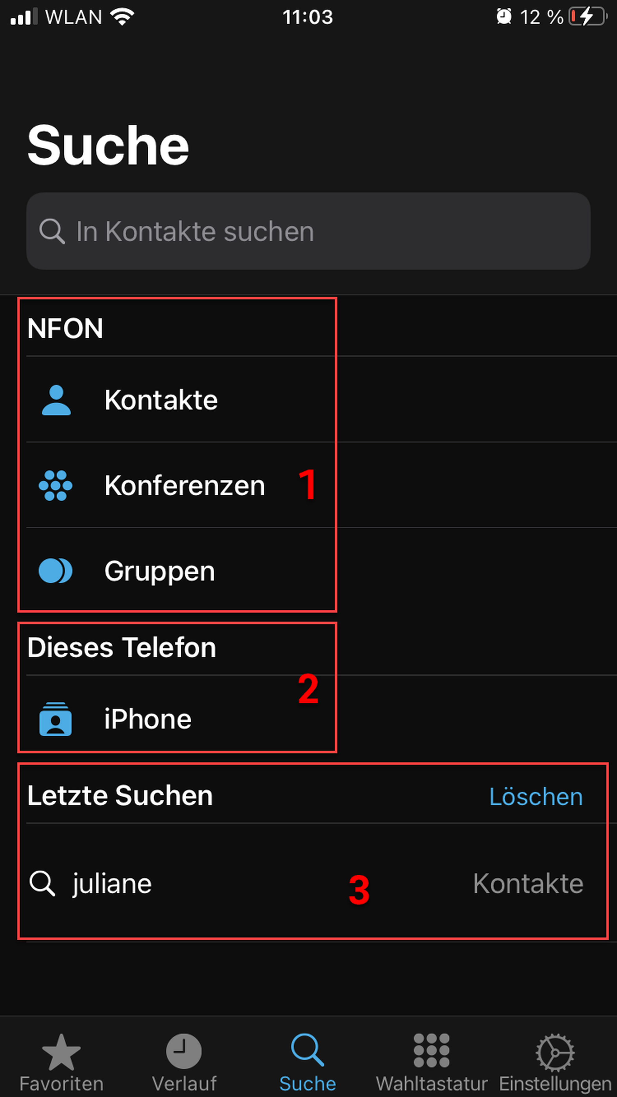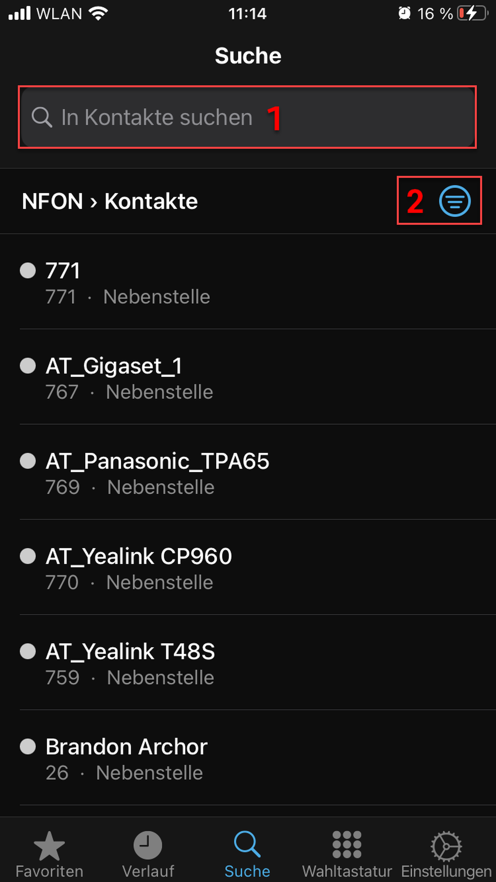 In der Registerkarte Suche können Sie sowohl nach Kontakten der Telefonanlage als auch nach Kontakten in Ihrem Mobiltelefon suchen.