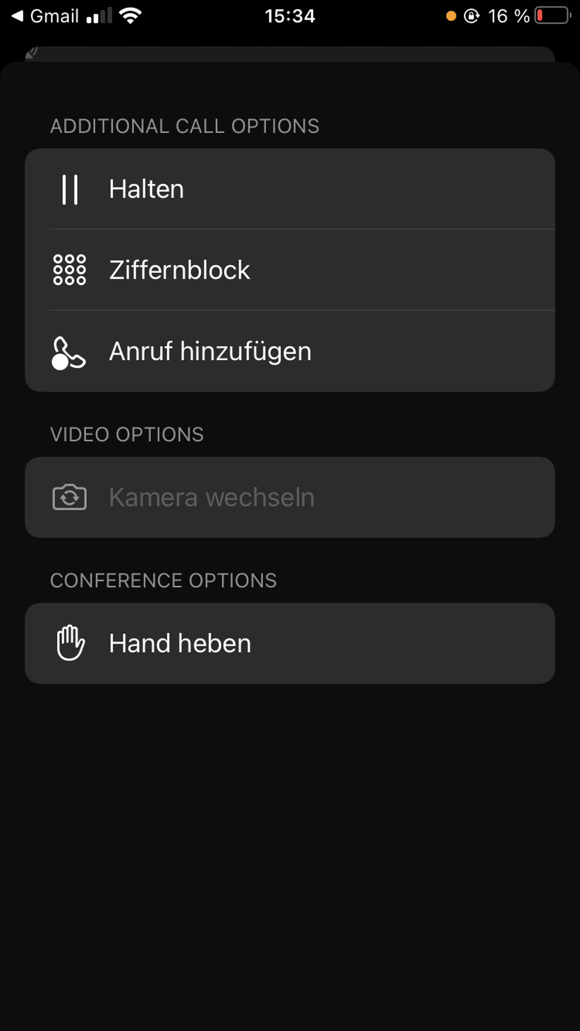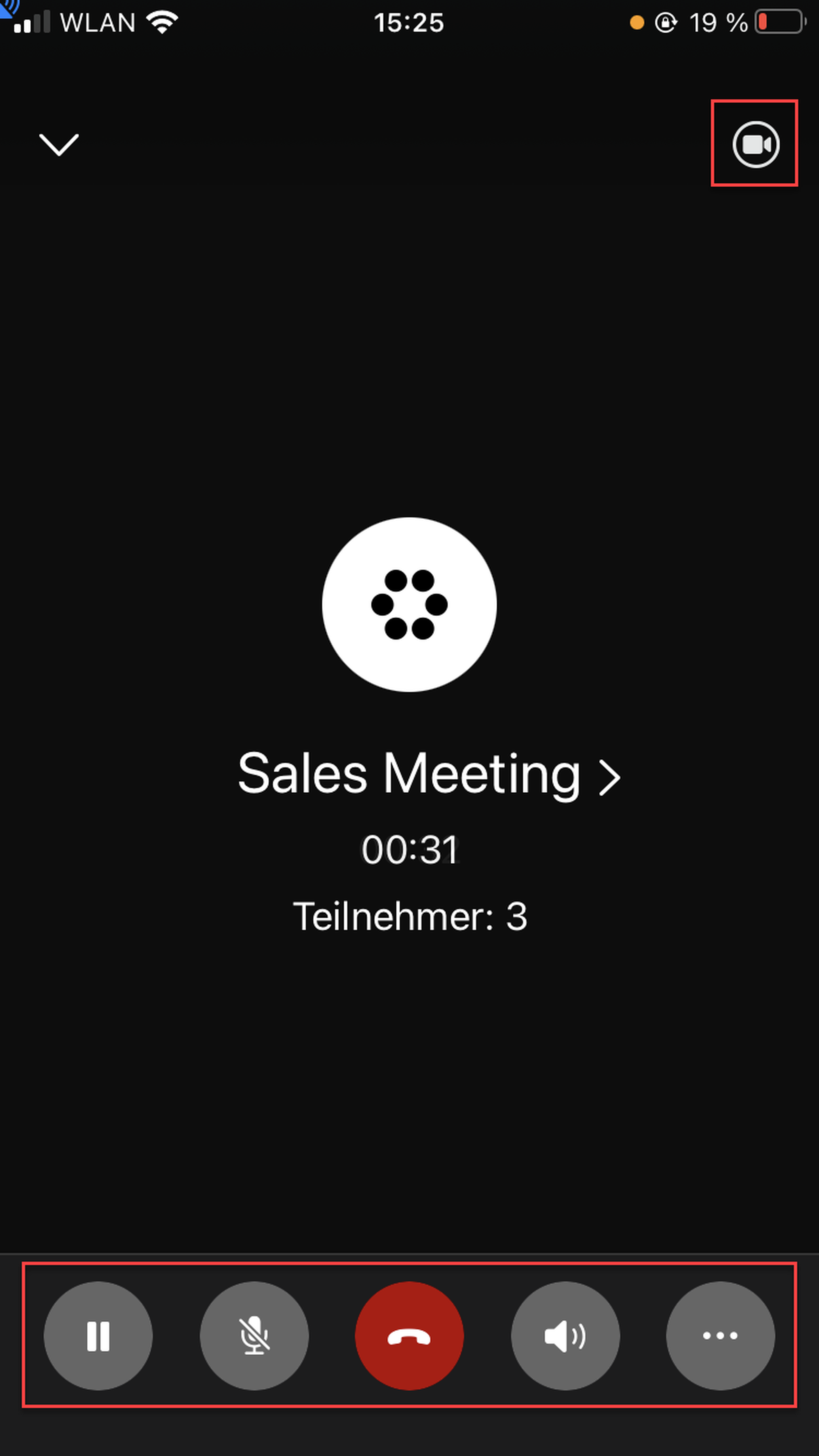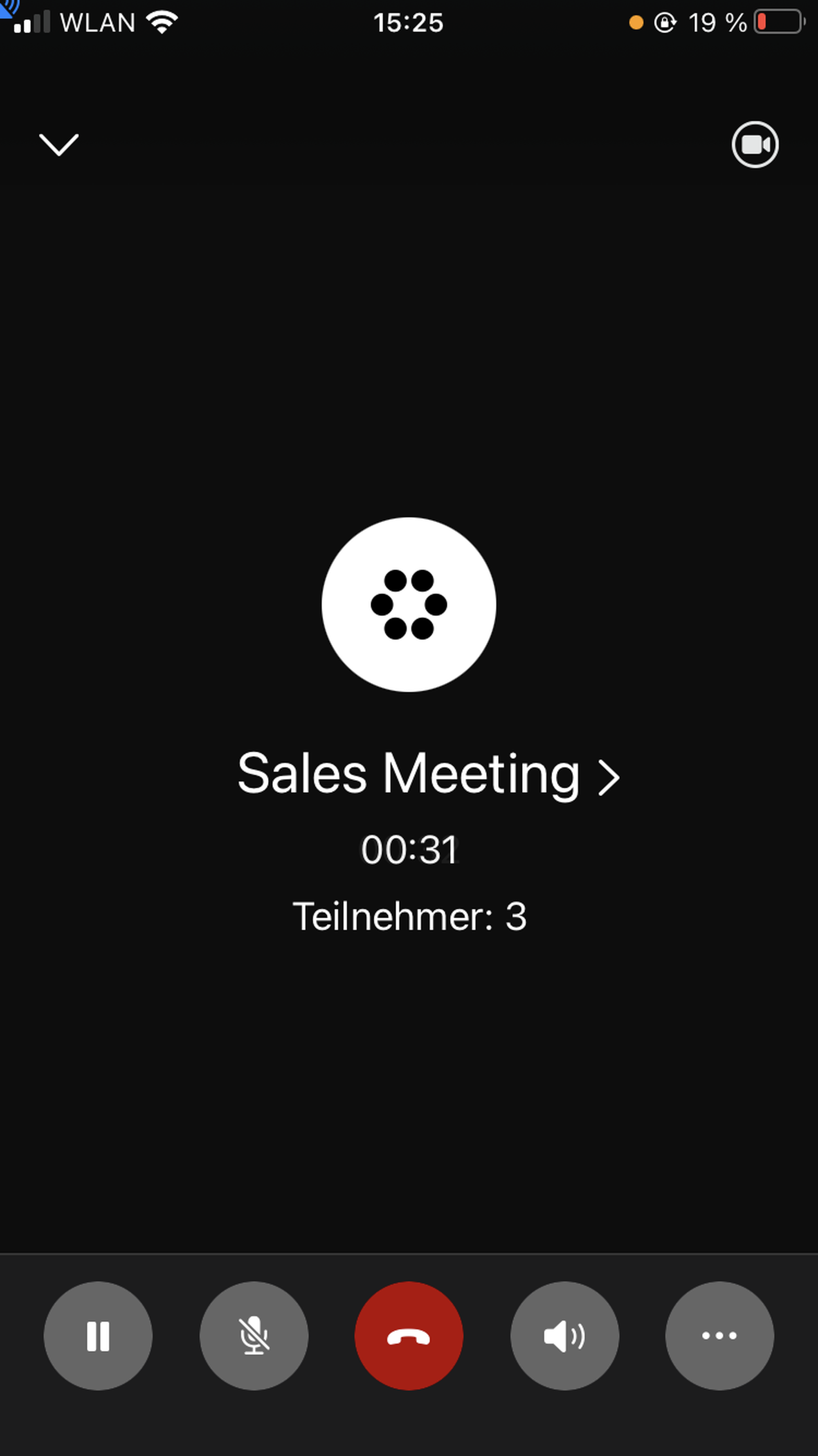Konferenz auf Halten setzen (die Kameras werden automatisch ausgeschaltet und die Konferenz wechselt in den Audiomodus; drücken Sie auf Halten aufheben, um die Konferenz fortzusetzen; um wieder in den Videomodus zu wechseln, tippen Sie auf die Kamera oben rechts und dann auf die Kamera in der unteren Leiste)