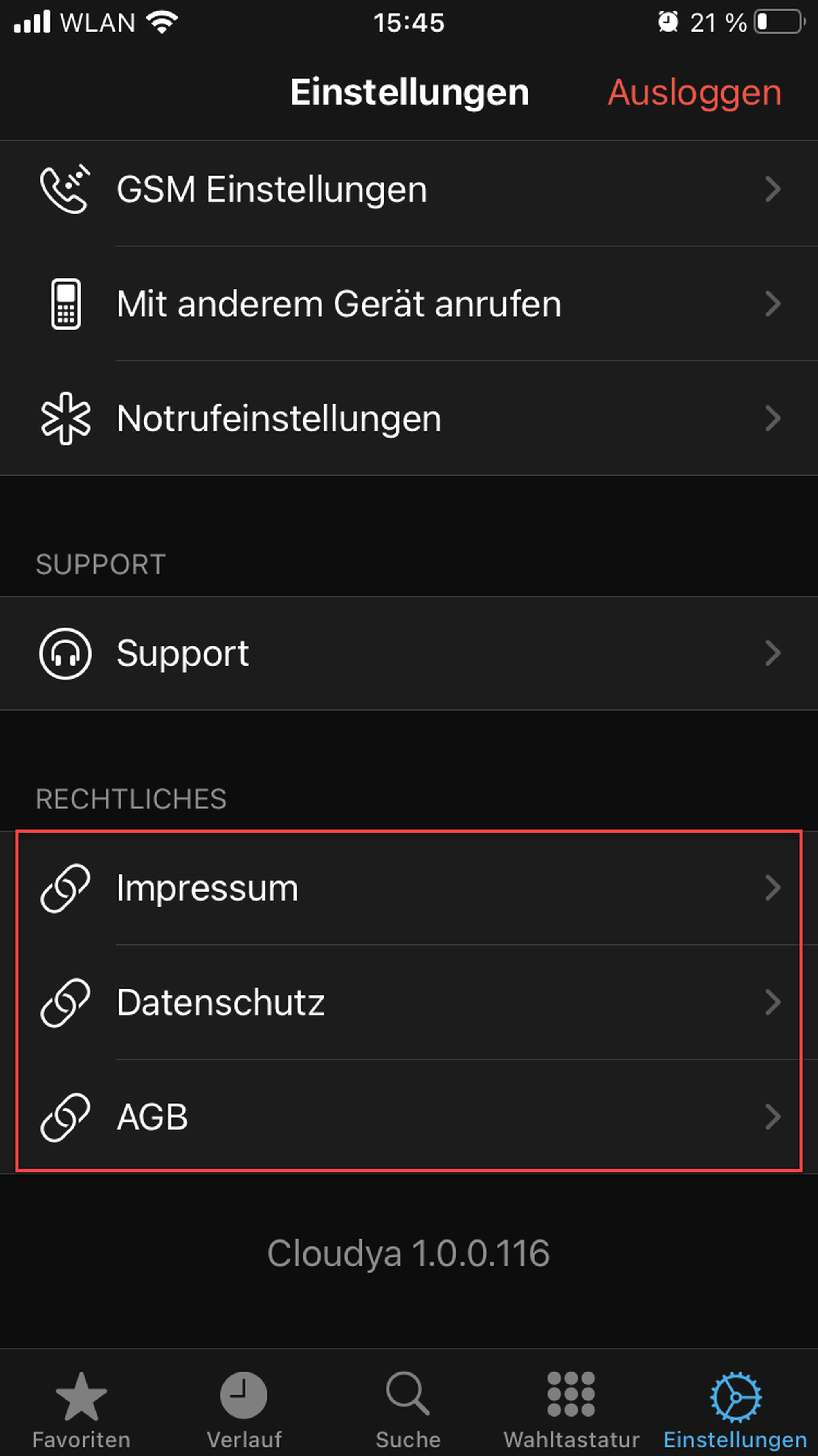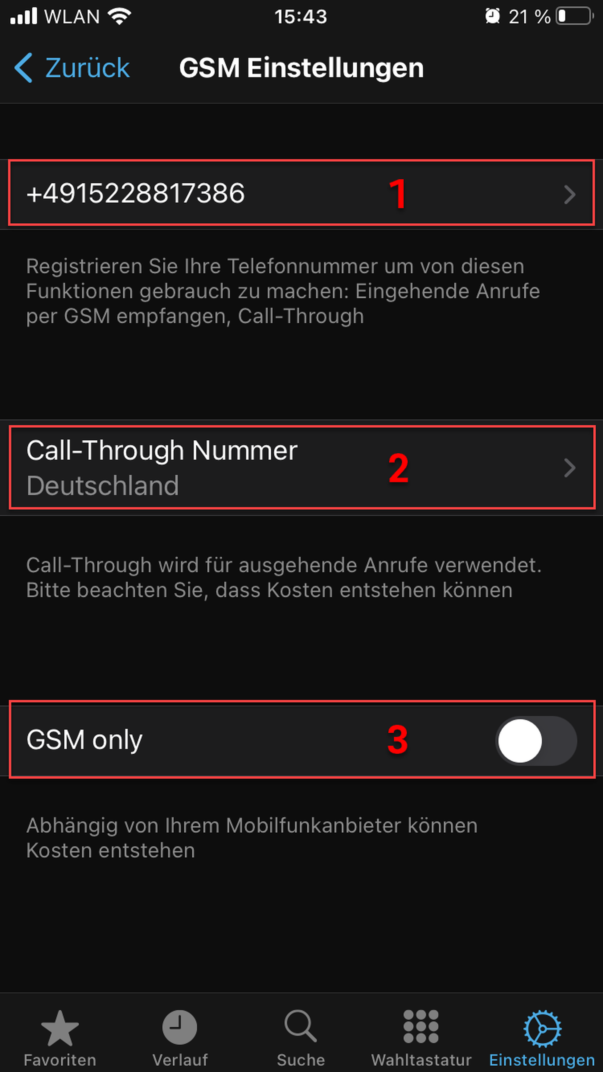 Bitte beachten Sie, dass die automatische Voreinstellung für den Call-Through Deutschland ist. Wenn Sie sich in einem anderen Land befinden, stellen Sie sicher, dass Sie es auf das Land ändern, in dem Sie sich befinden.