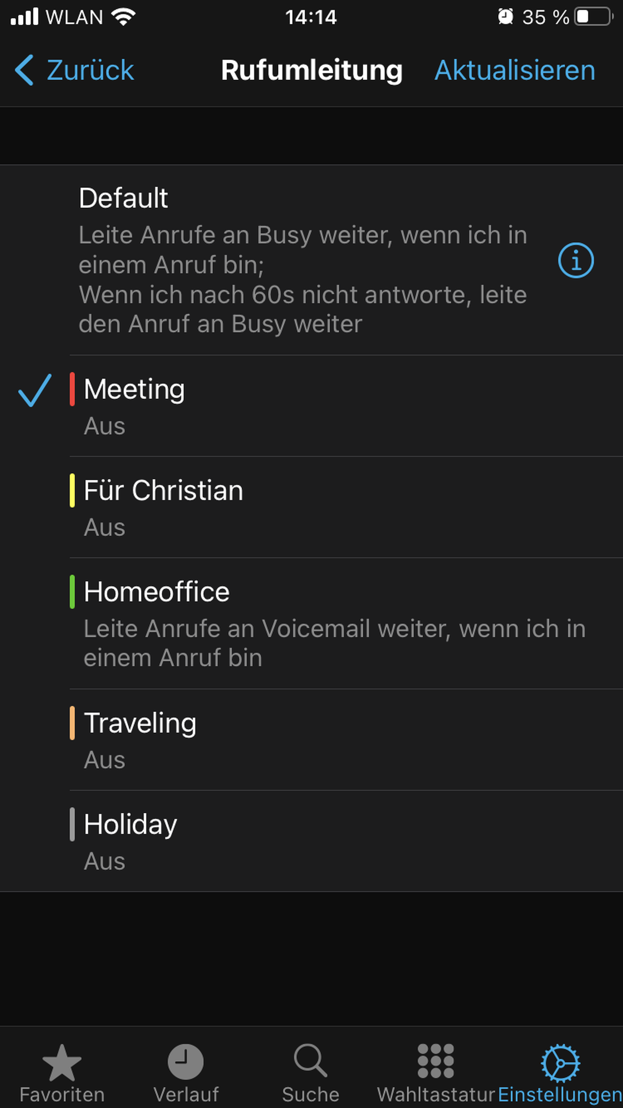 Sie können nur das Standard-Rufumleitungsprofil in der App bearbeiten. Tippen Sie auf den Info-Button, um das Profil zu bearbeiten.