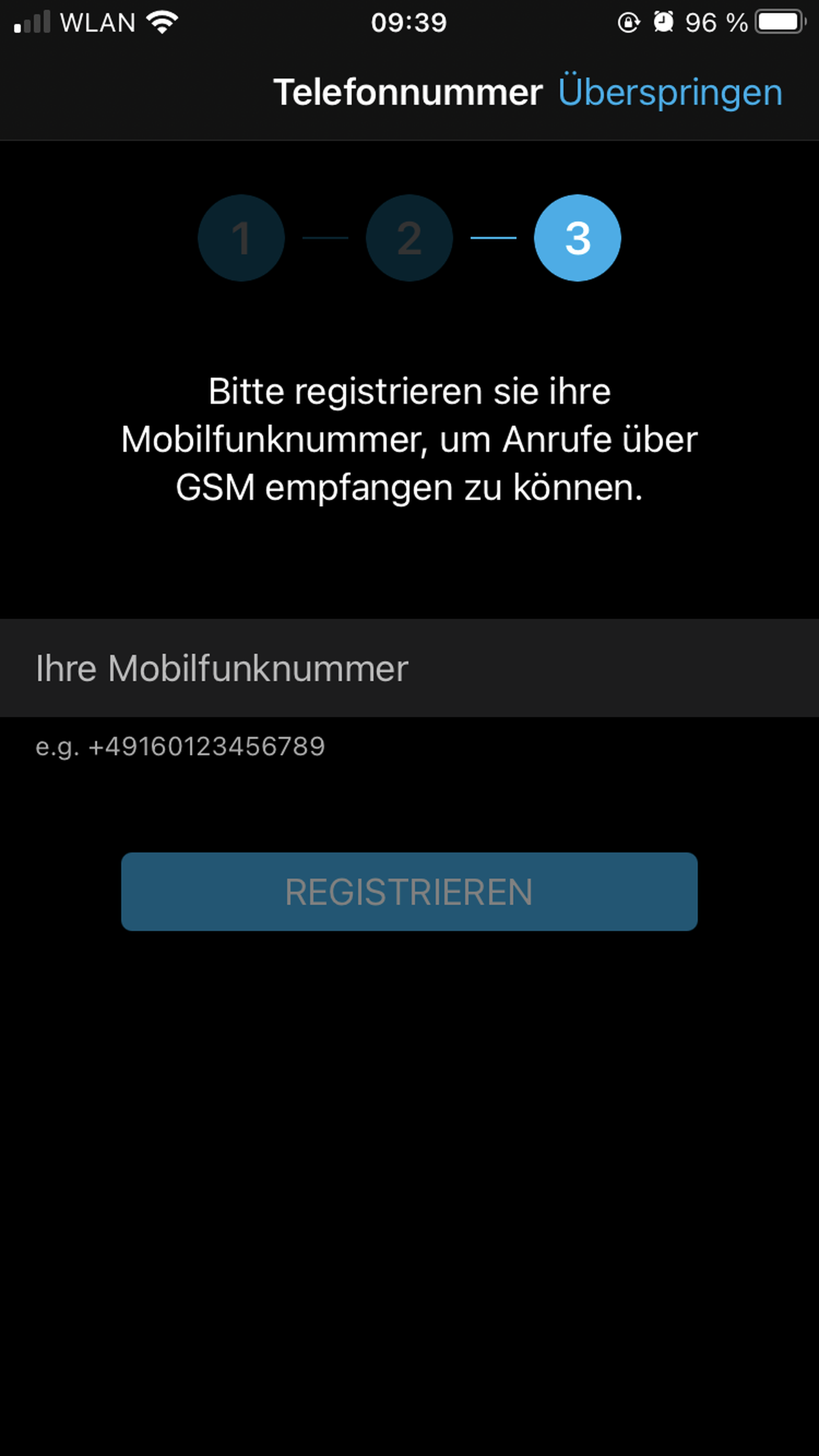 Ihre Mobiltelefonnummer registrieren. Bitte beachten Sie, dass dies nur möglich ist, wenn in Ihrem Gerät eine SIM-Karte eingelegt ist.