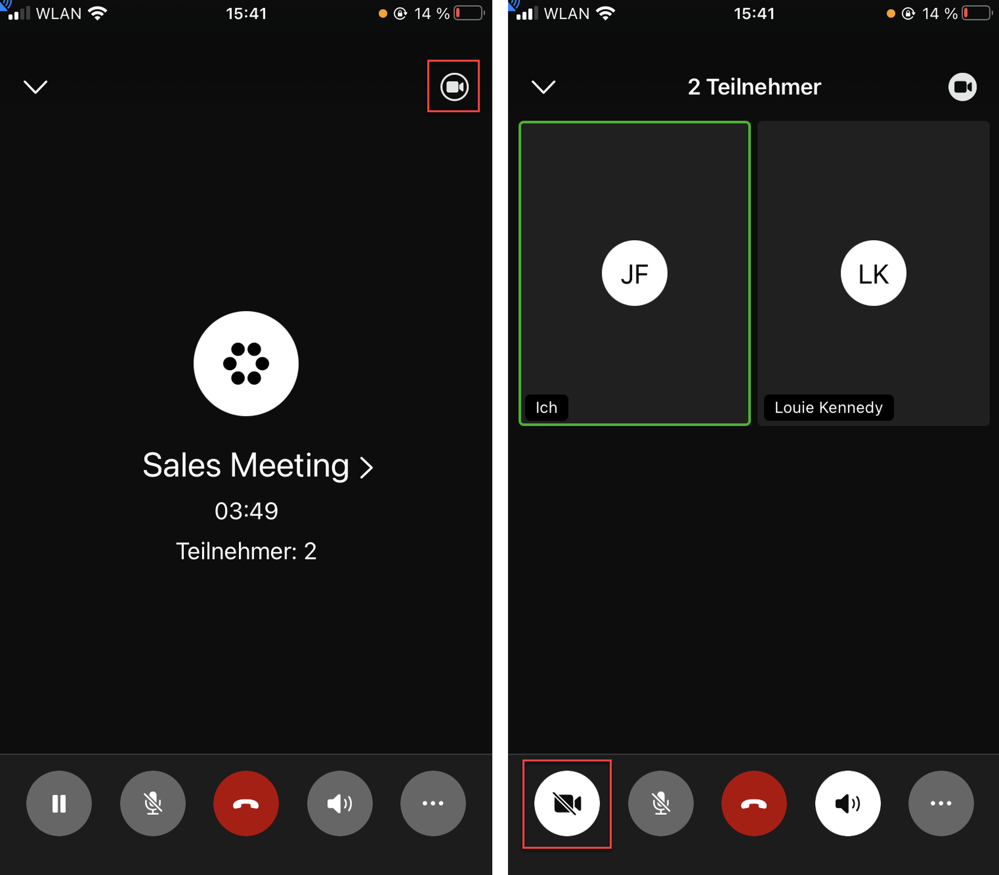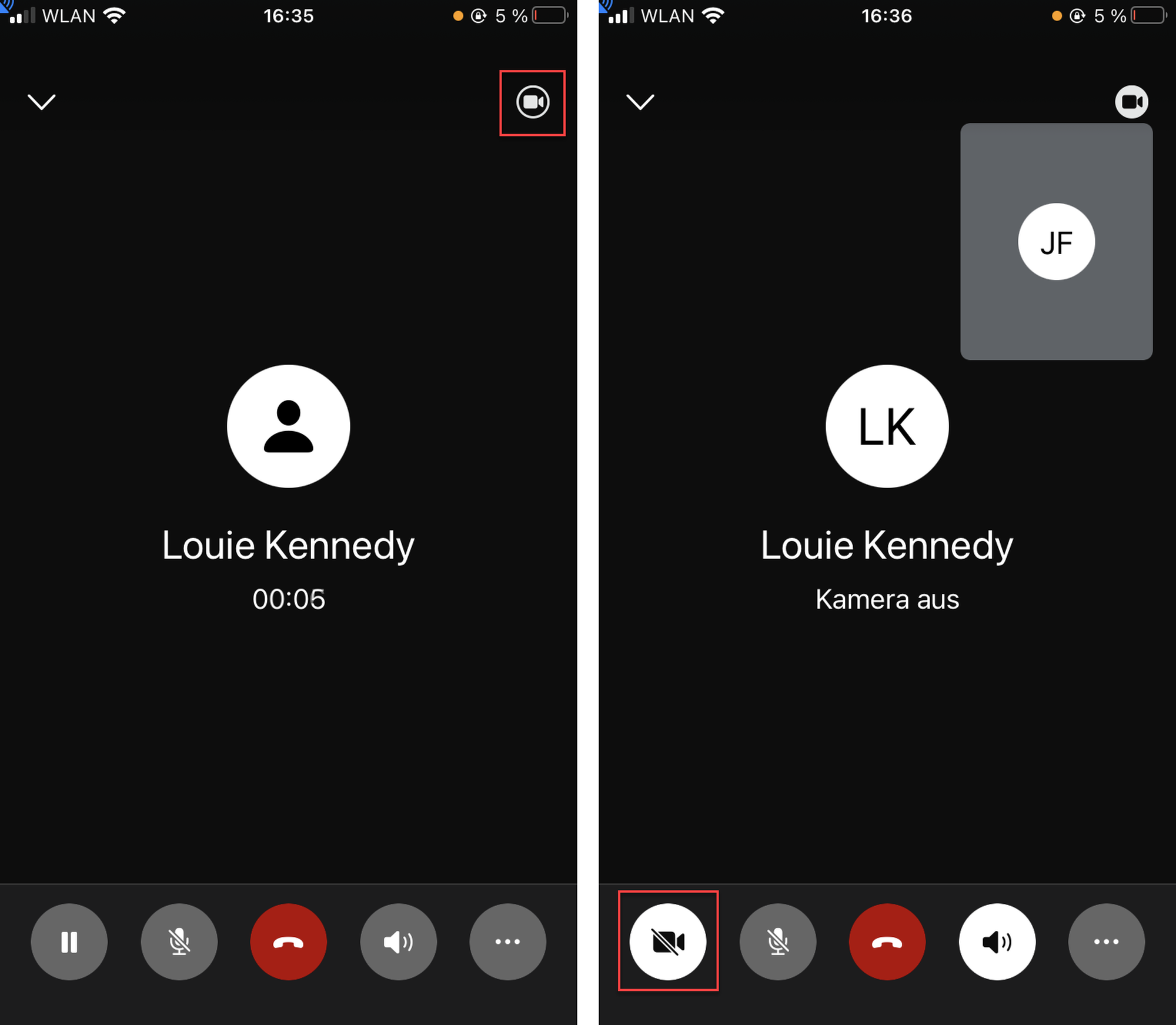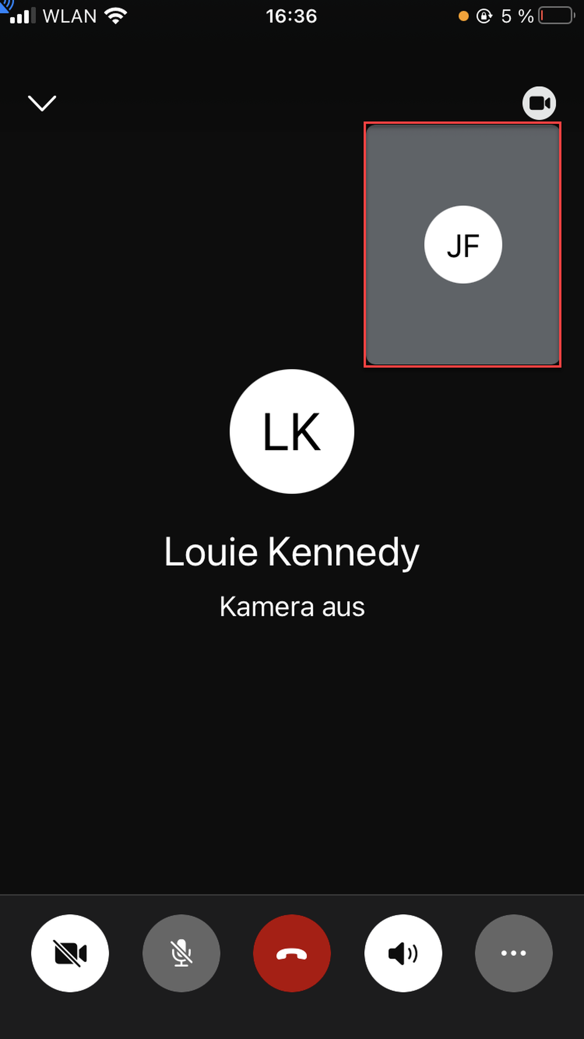Ihr eigenes Video wird als kleines Bild in der oberen rechten Ecke angezeigt, das Video des anderen Teilnehmers wird in voller Größe angezeigt. Tippen Sie auf das kleine Bild, um die Videos zu tauschen.