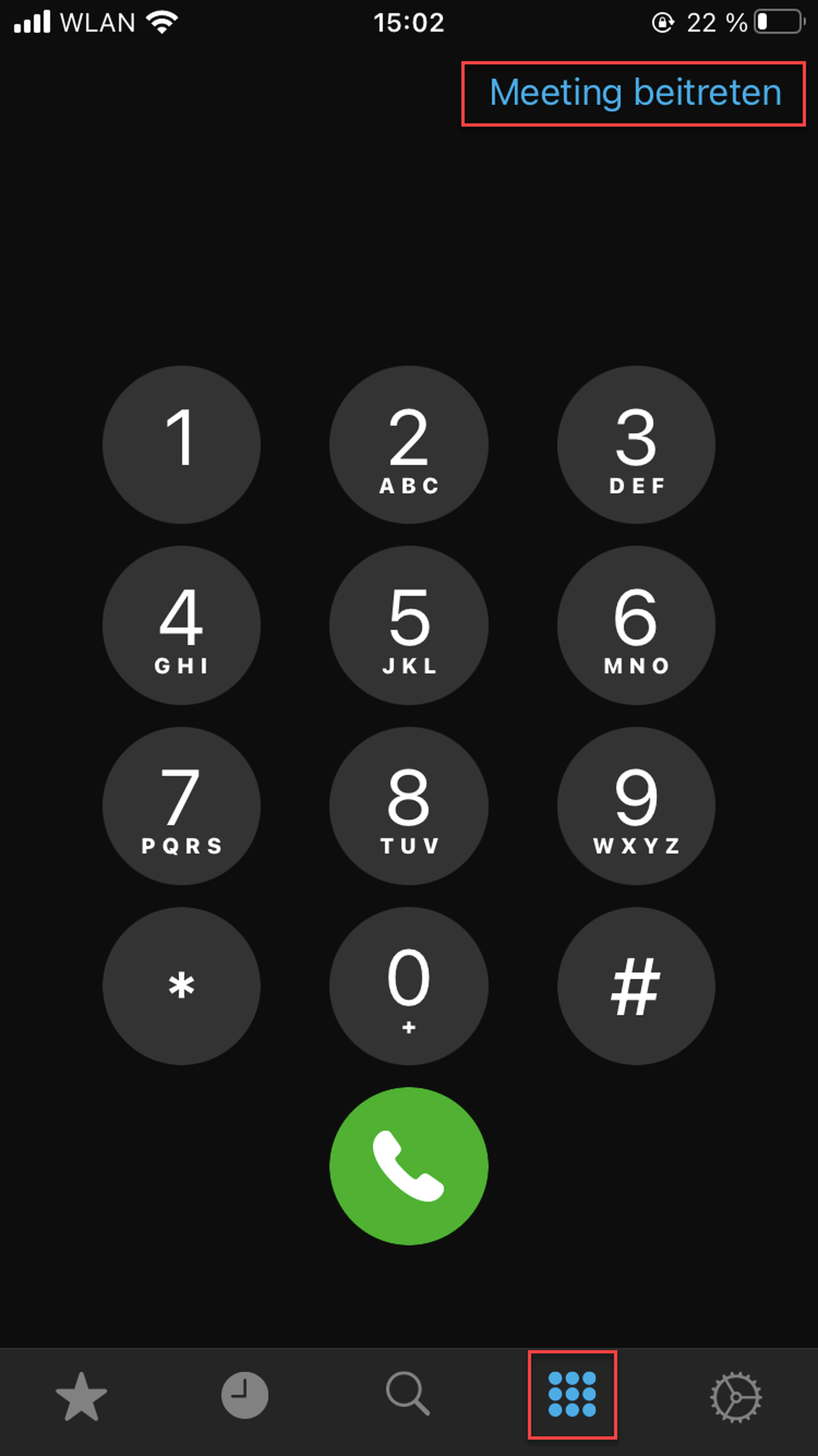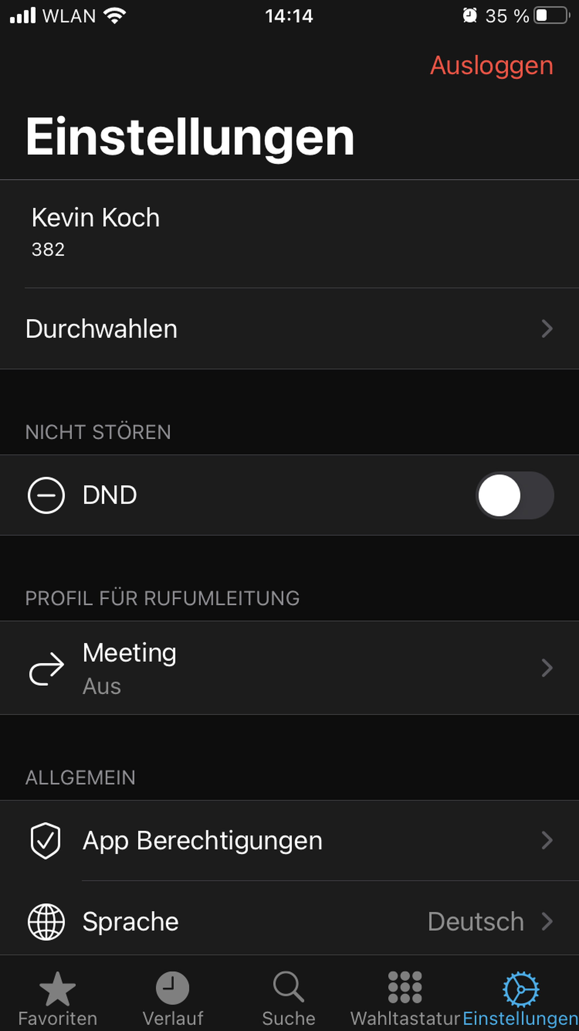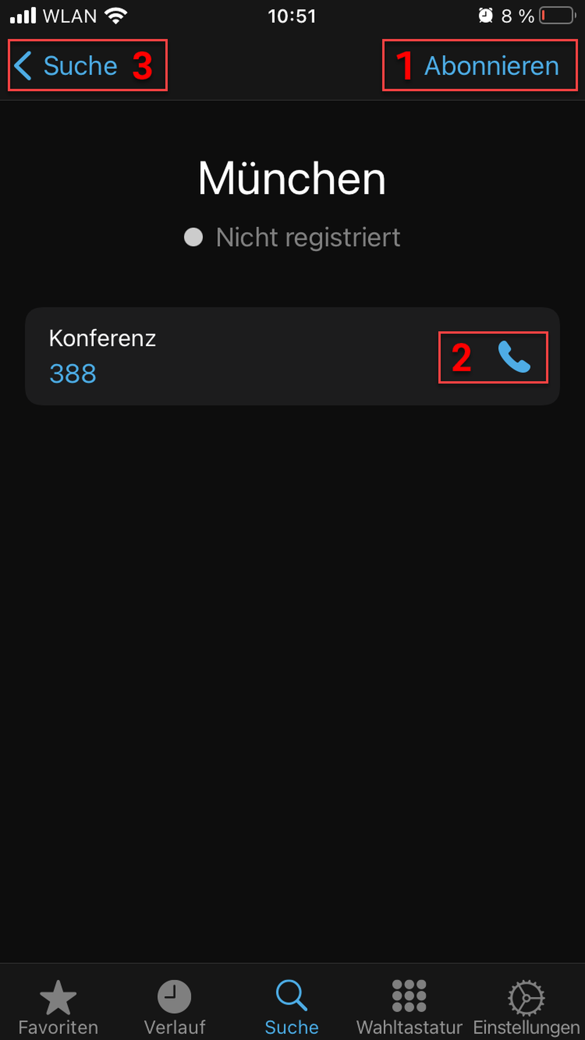 Zu den Registerkarten Favoriten, Suche, Wahltastatur oder Einstellungen wechseln