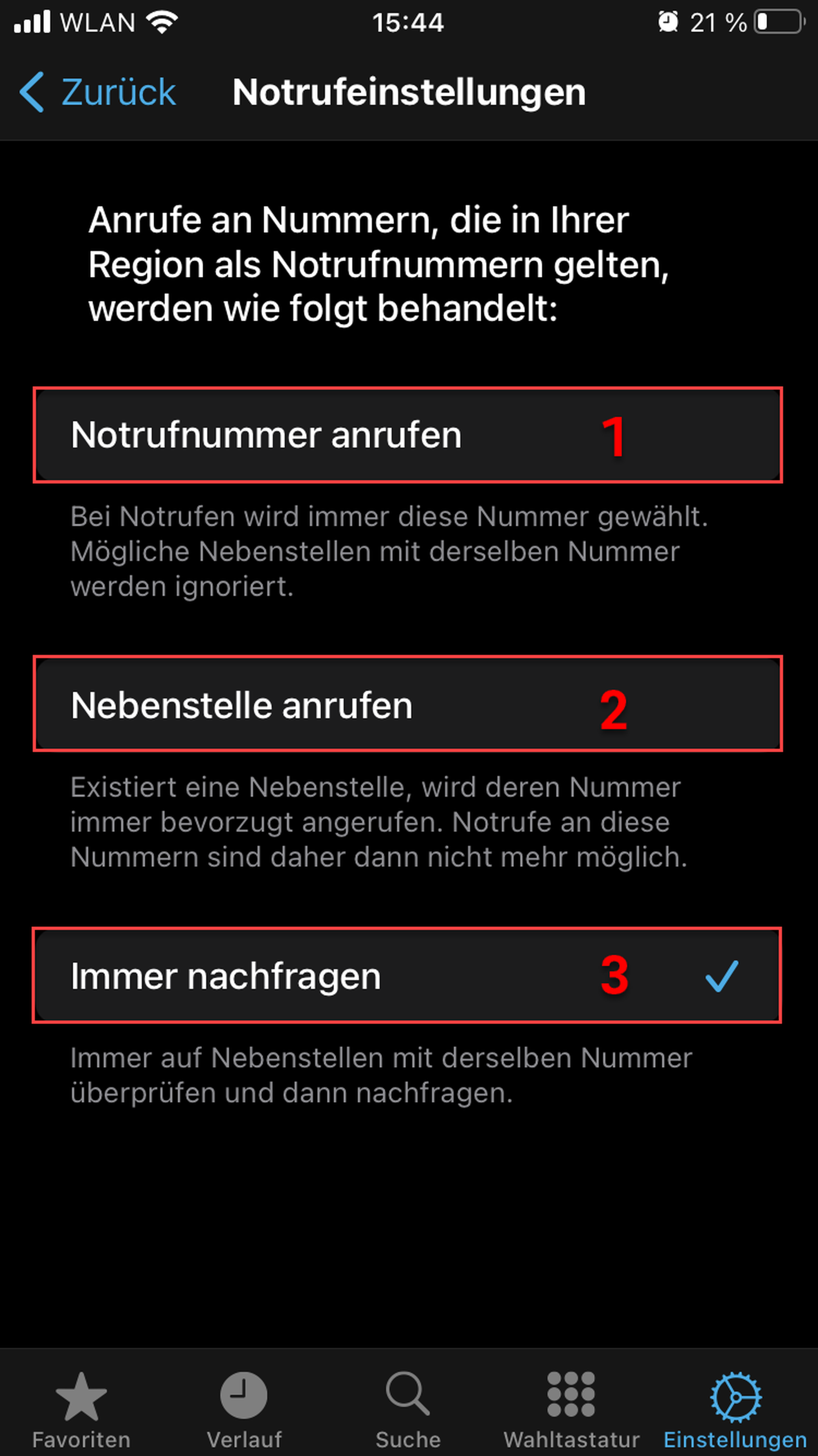 Wenn eine Nebenstellennummer mit der Notrufnummer identisch ist, müssen Sie auswählen, was angerufen werden soll.