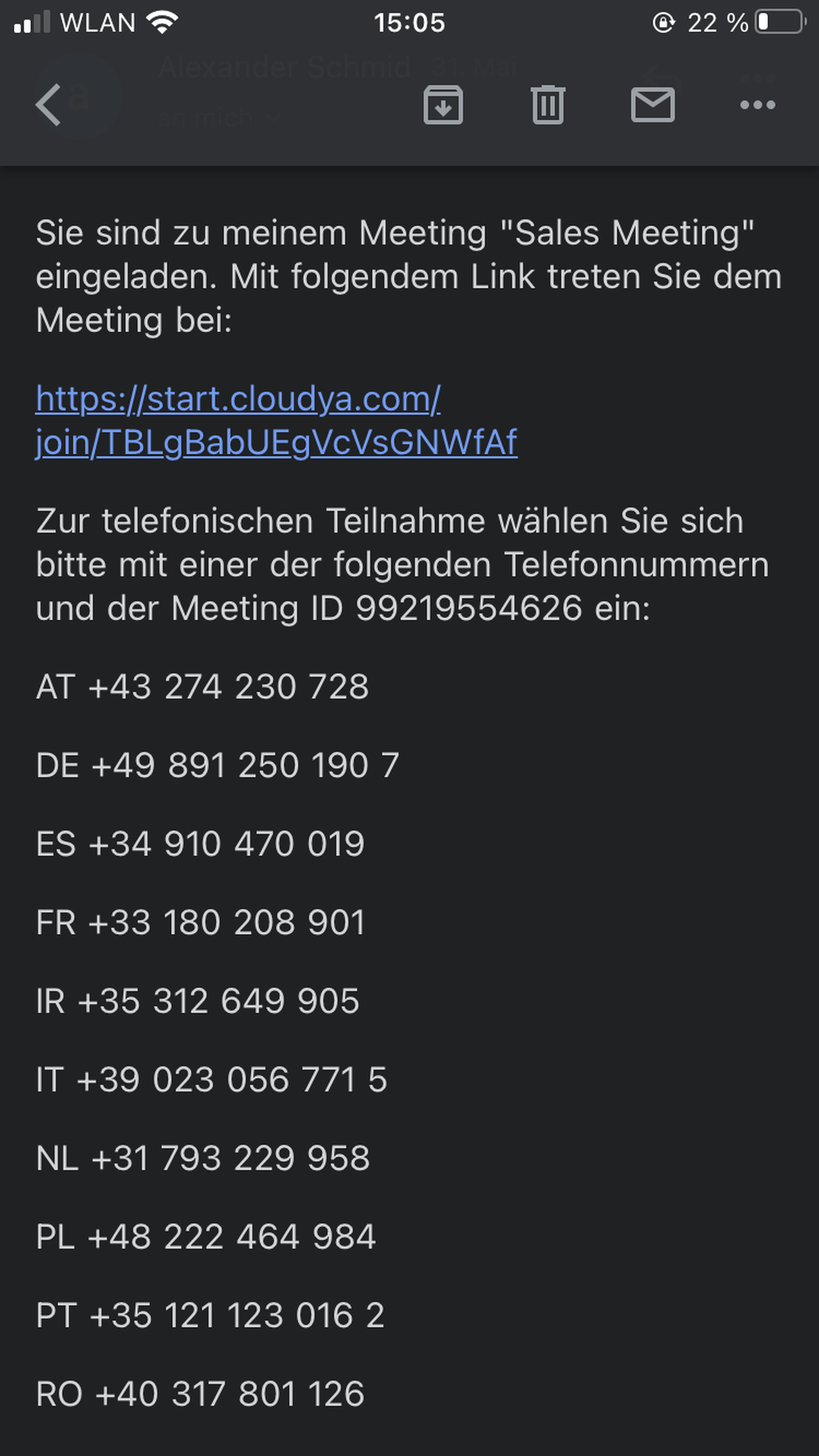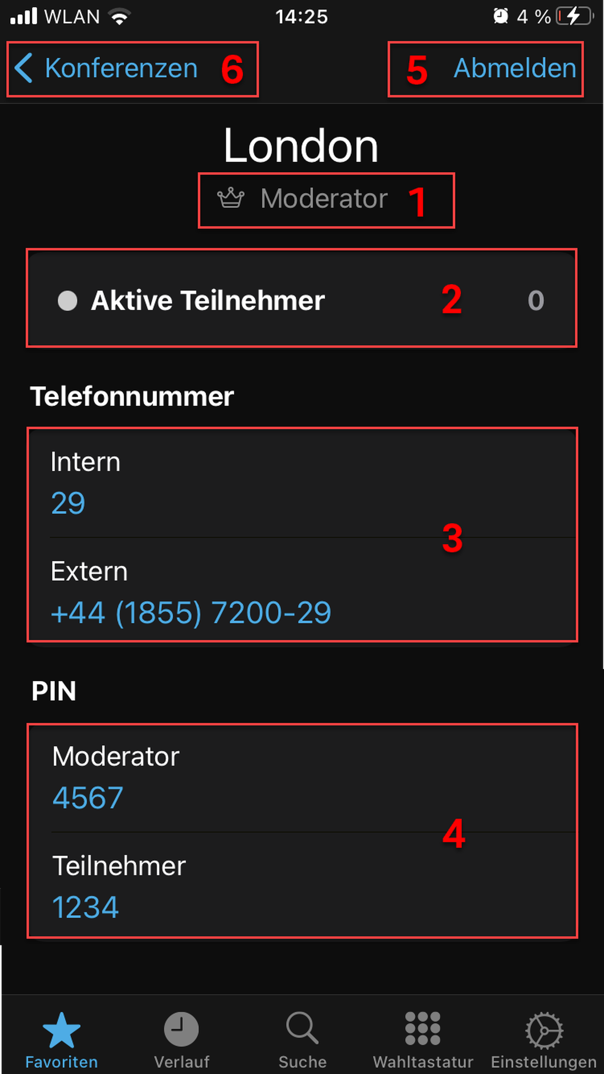 die internen und externen Nummern zum Einwählen in die Konferenz sehen