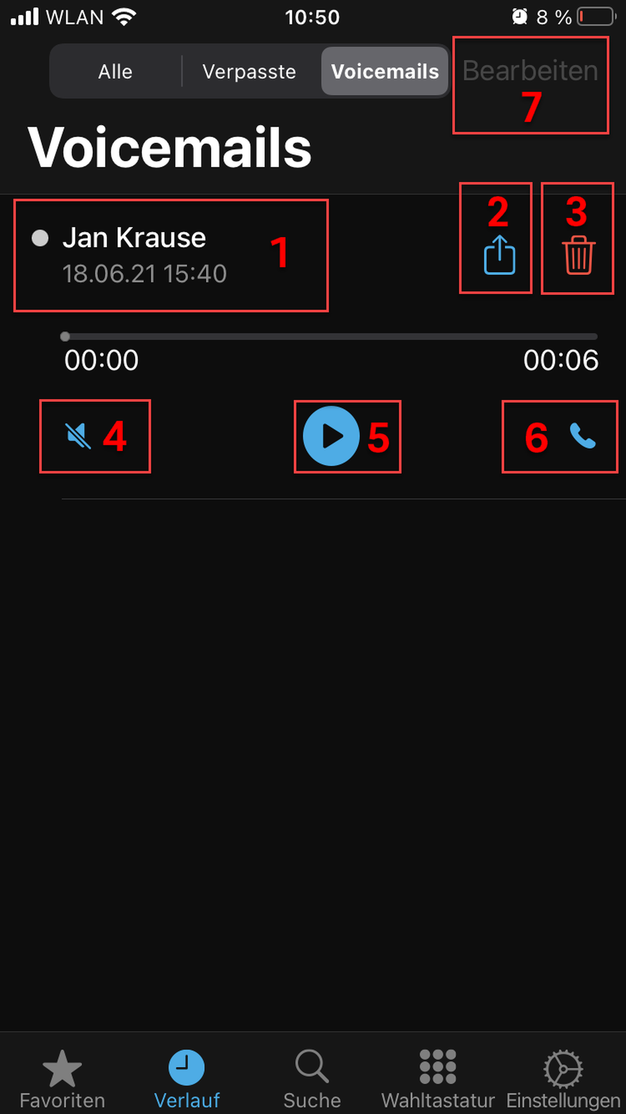In der Registerkarte Voicemails sehen Sie die Liste der Voicemails.