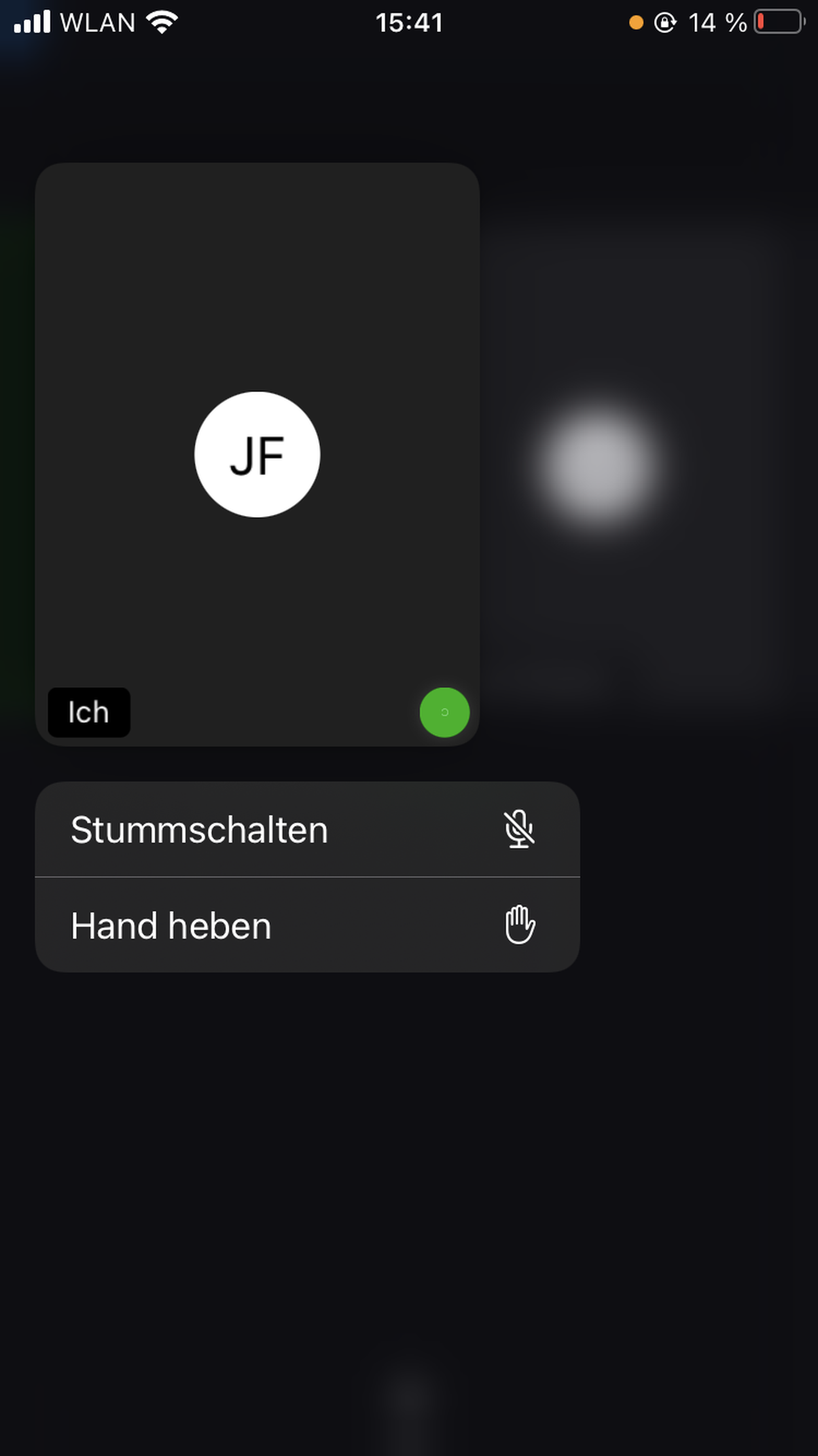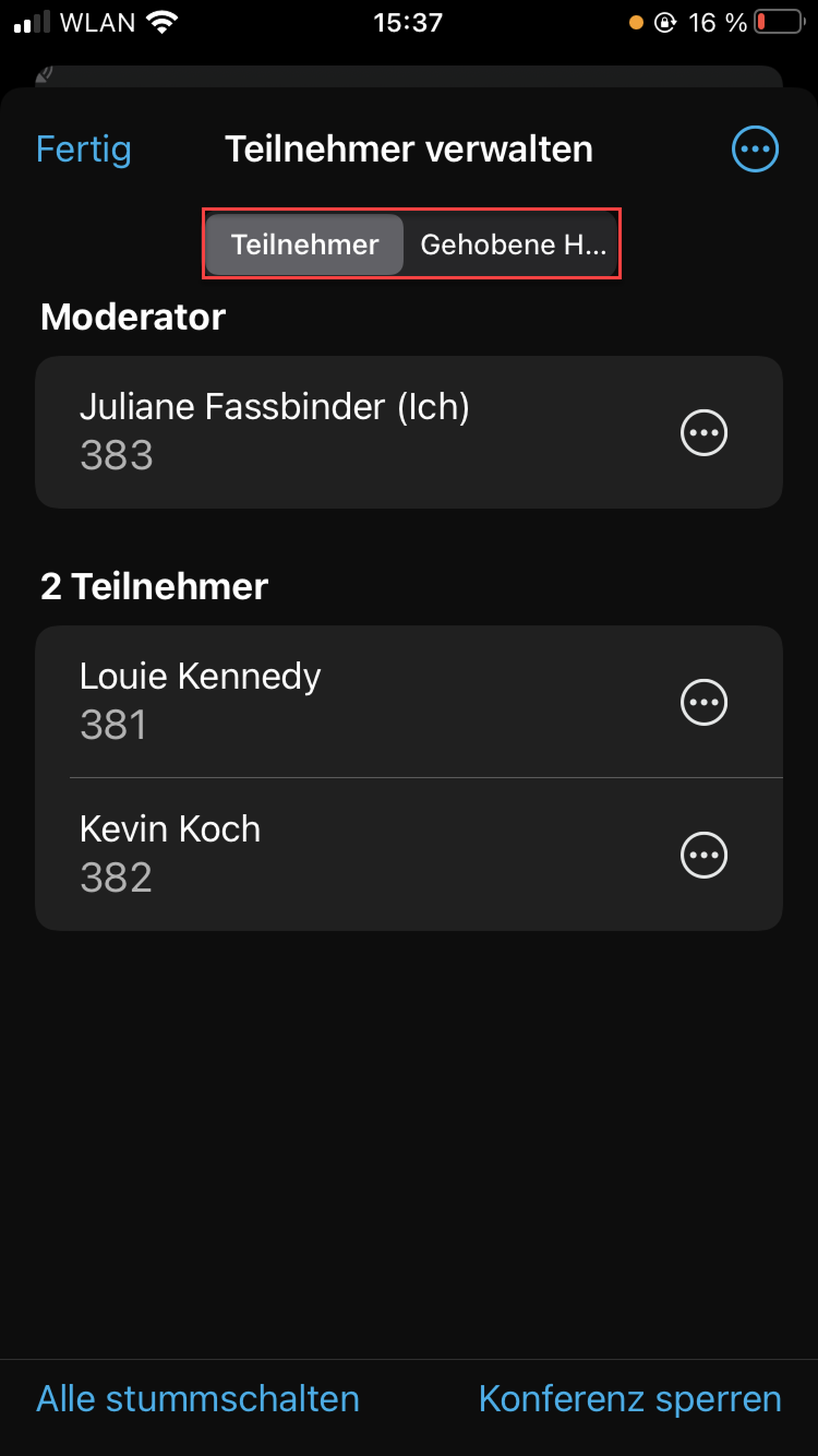 Wenn Sie sich im Audiomodus befinden, tippen Sie in die Mitte des Bildschirms. Sie sehen zwei Registerkarten: Teilnehmer und Gehobene Hände.