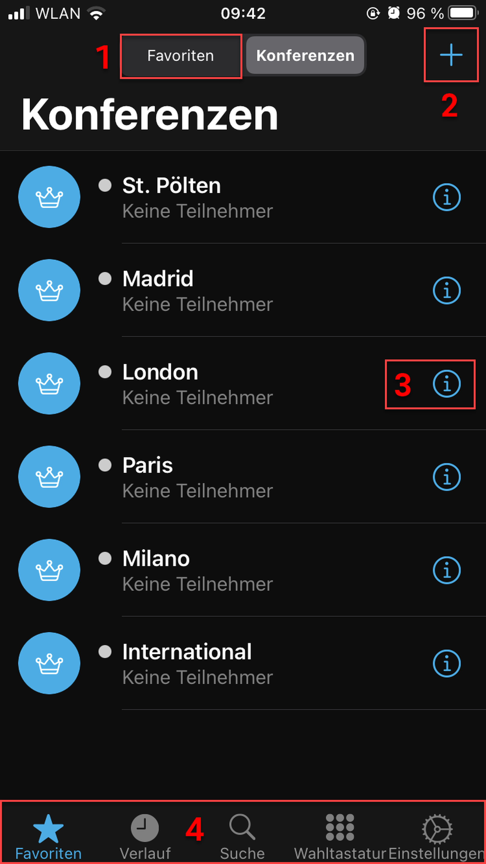 Wenn Sie auf das Info-Symbol neben dem Konferenznamen klicken, können Sie detaillierte Informationen zu einer Konferenz anzeigen.