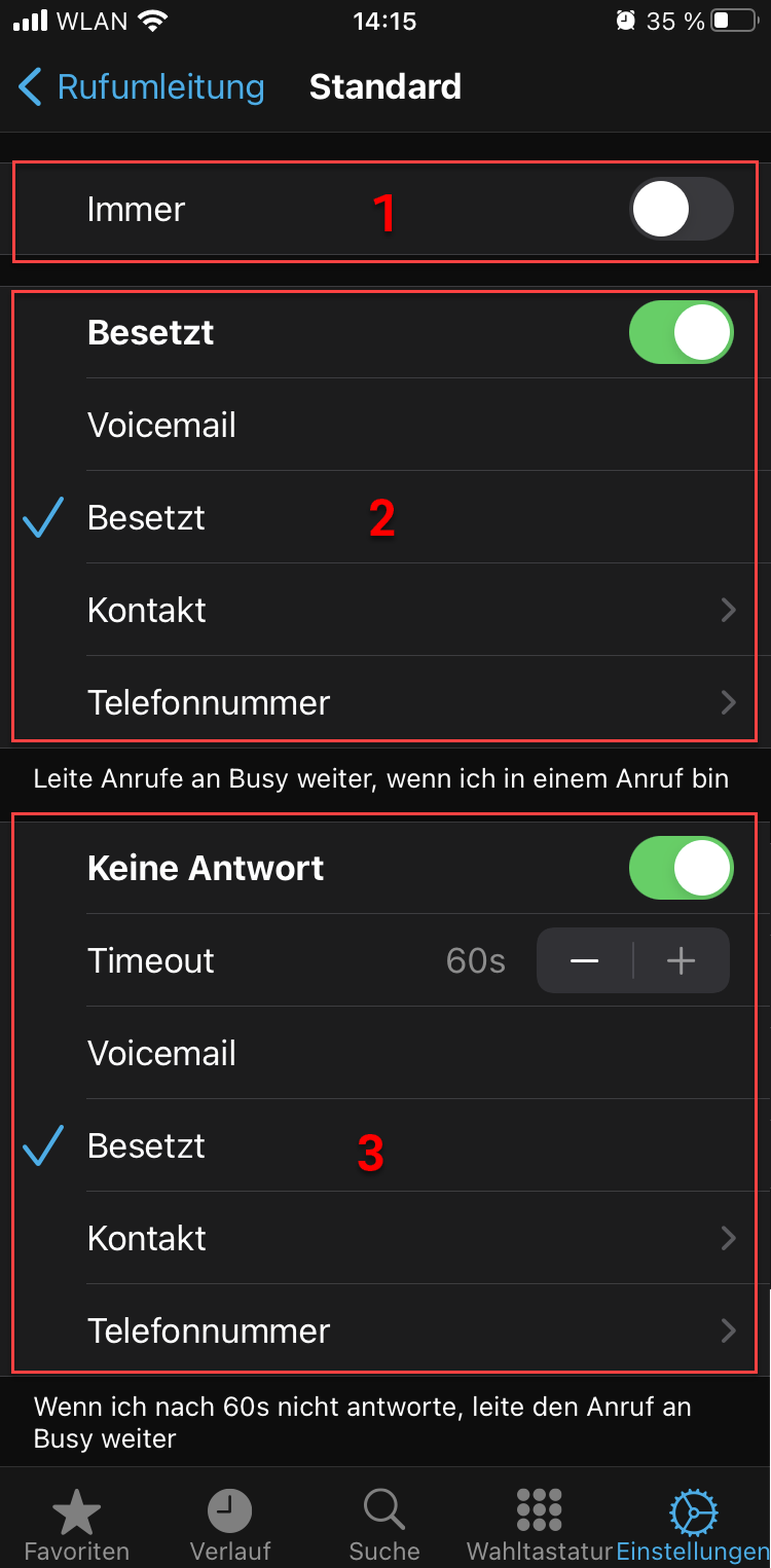 Keine Antwort. Hier können Sie das Profil aktivieren/deaktivieren, den Timeout zwischen 5 und 60 Sekunden einstellen, Anrufe an die Voicemail, bei Besetzt, an einen Kontakt oder an eine Telefonnummer umleiten.