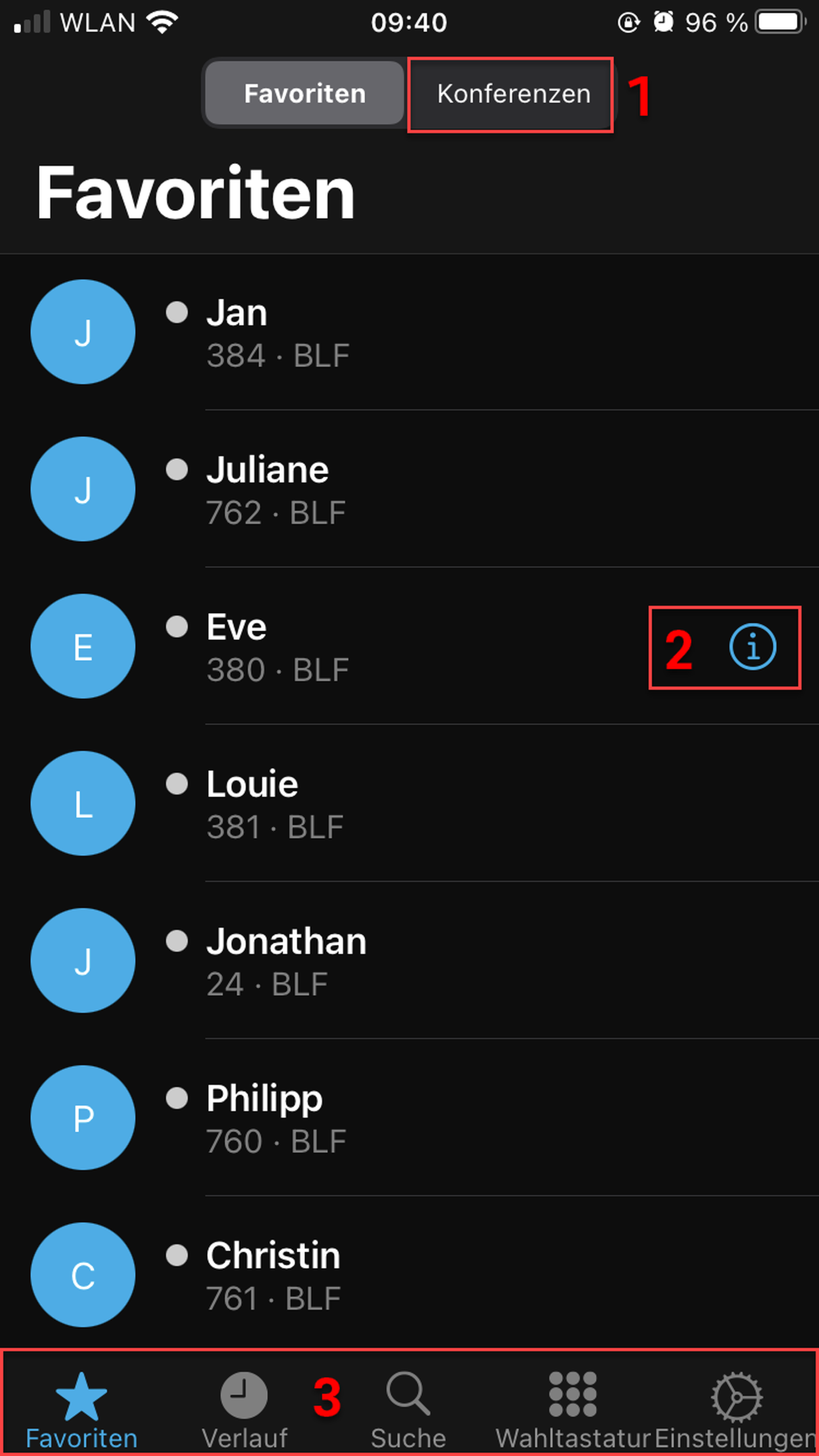 Wenn Sie sich angemeldet haben, ist das erste Ansicht Favoriten, die den Funktionstasten Ihrer Nebenstelle entsprechen.