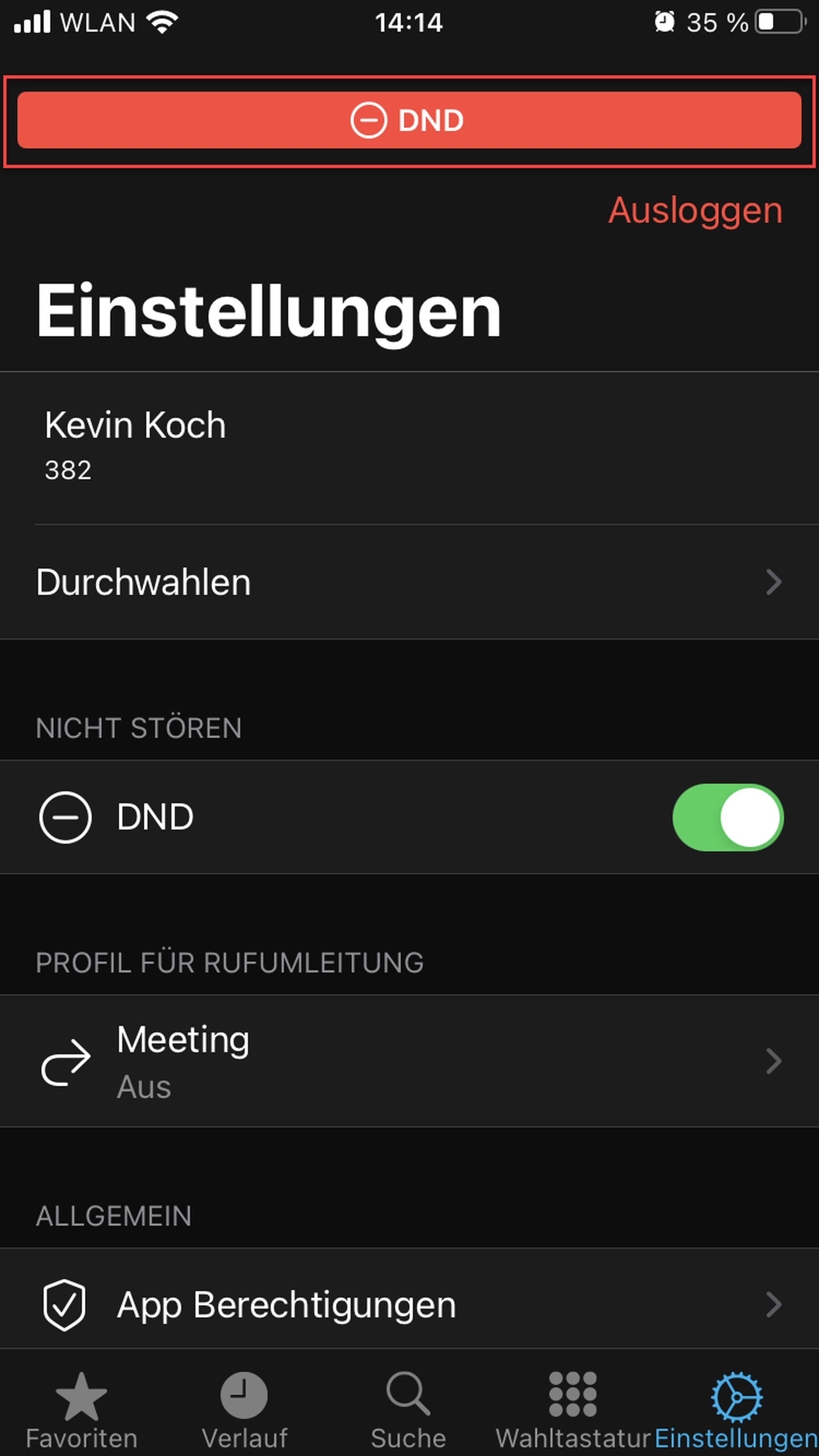 Wenn Sie DND aktivieren, erscheint das rote Banner am oberen Rand der App-Oberfläche