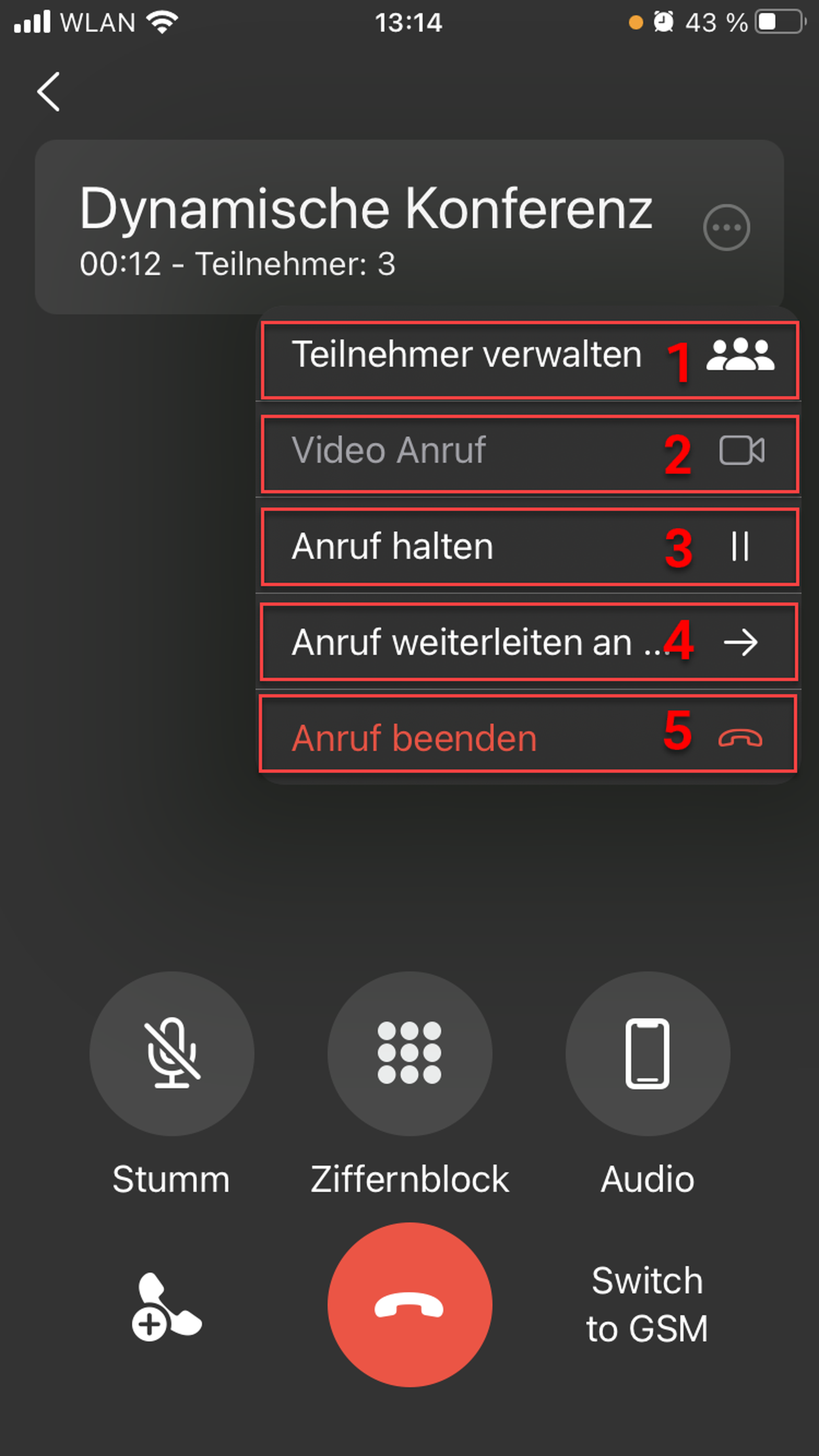Wenn Sie sich in einer dynamischen Audiokonferenz befinden, können Sie zu einer Videokonferenz wechseln (siehe Kapitel C.3, um zu erfahren, wie Sie eine dynamische Konferenz erstellen).