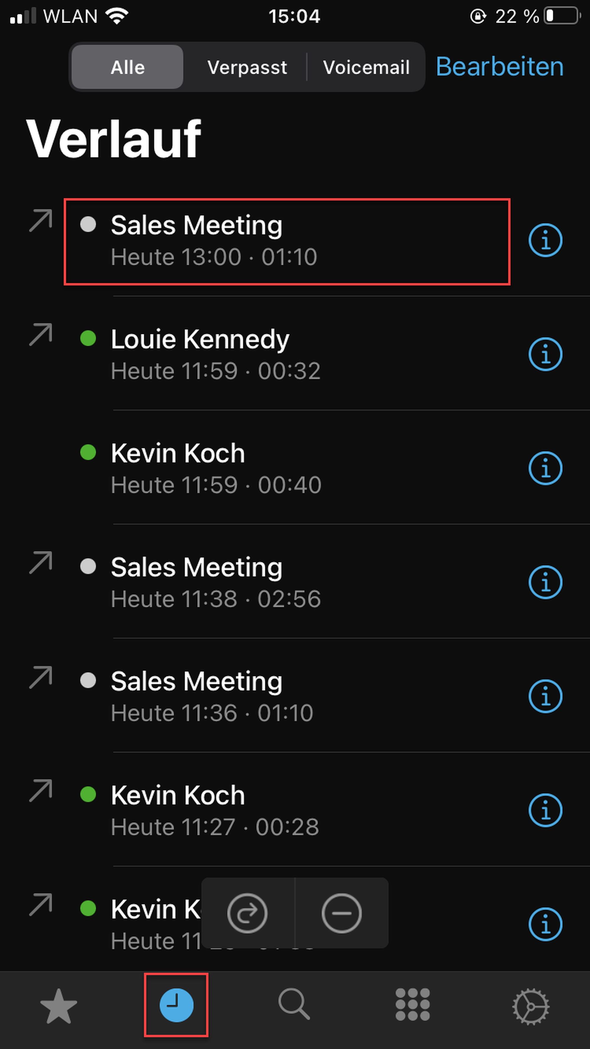 Die Registerkarte Verlauf zeigt eine Liste der letzten Aufrufe. Diese Ansicht kann auf "Voicemails" umgeschaltet werden, um eine Ansicht der letzten Voicemails zu erhalten.