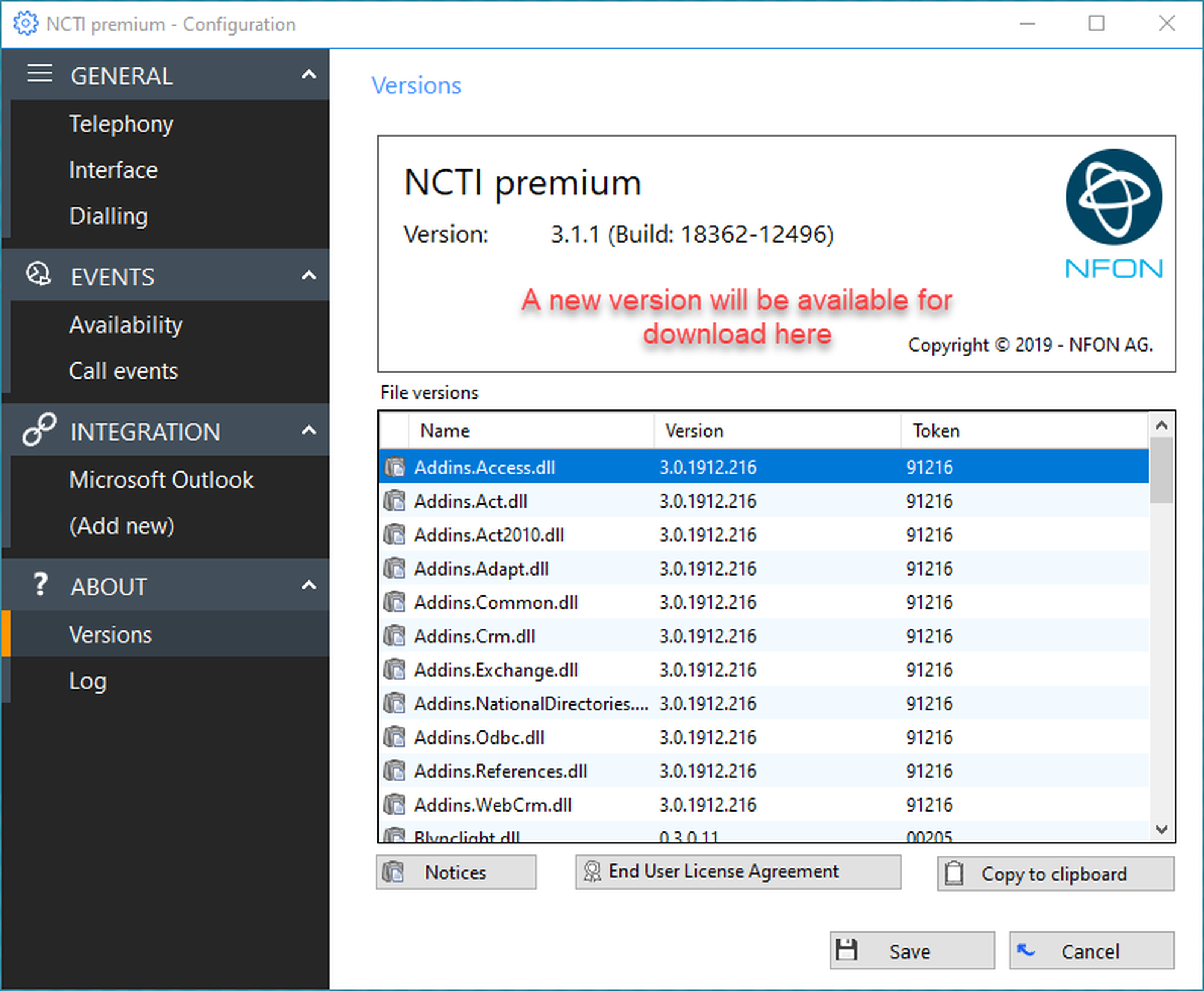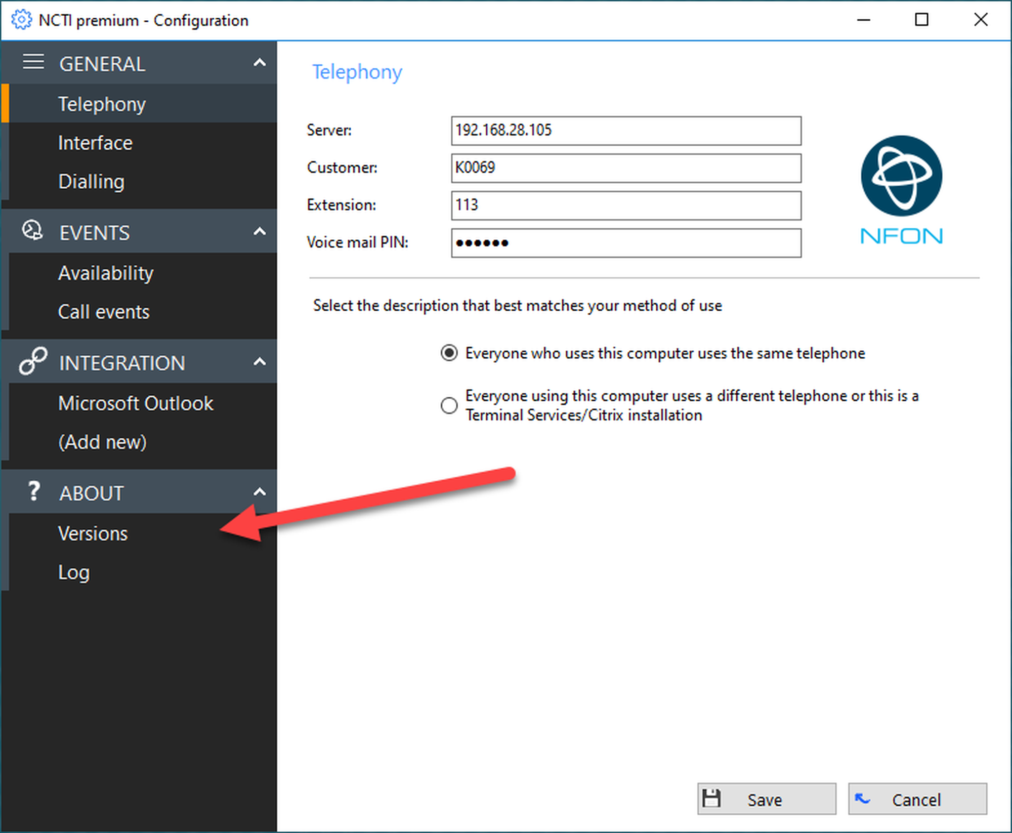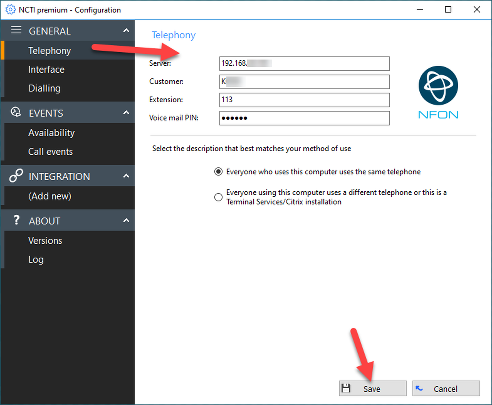 Um den NCTI premium/CRM-Client nutzen zu können, ist eine Serverinstallation beim Kunden erforderlich. Dieser Server wird von der NFON AG gestellt jedoch nicht gehosted. Die Serverinstallation und die Konfiguration werden von der NFON AG durchgeführt.