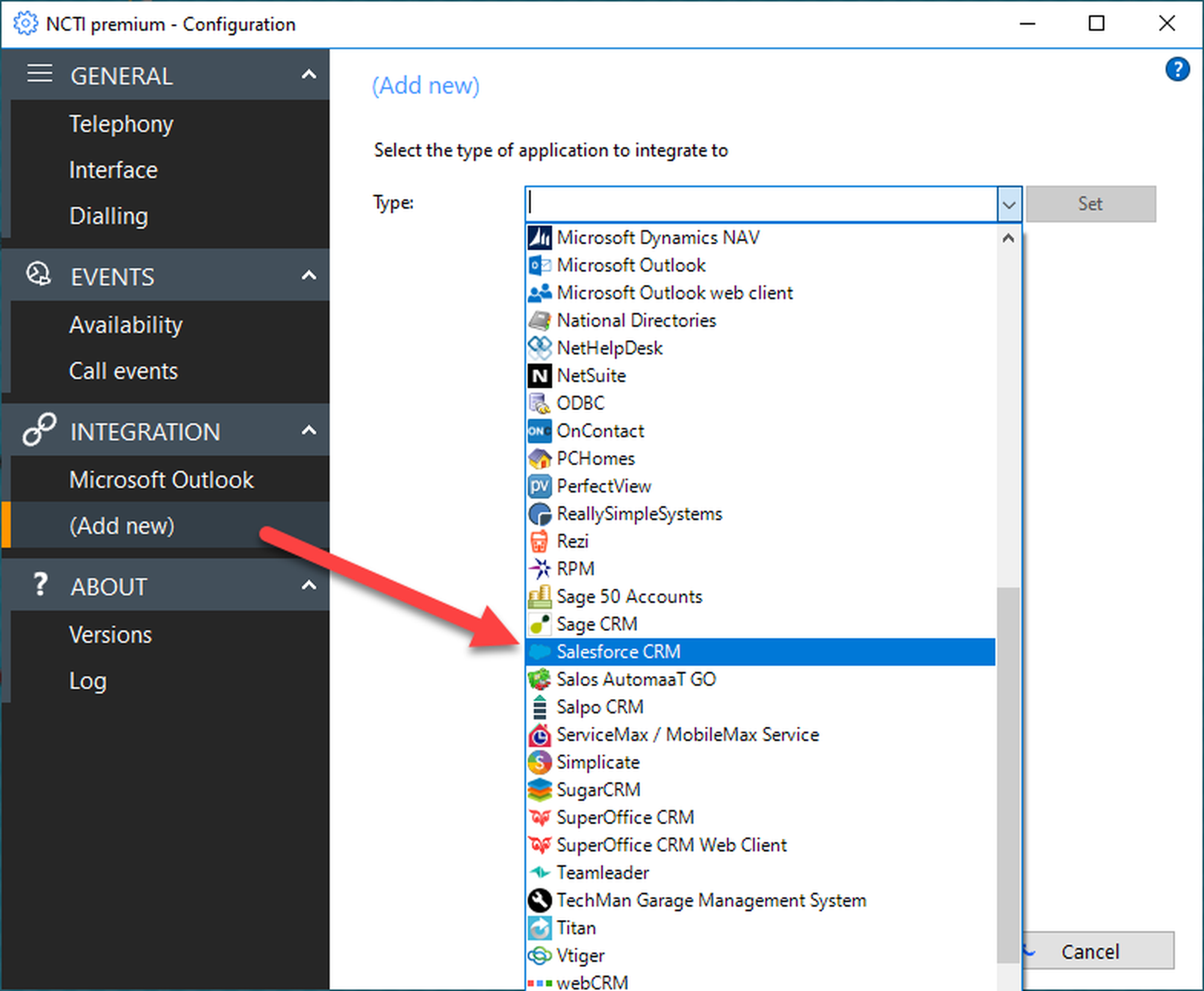 Um Salesforce zu aktivieren, gehen Sie unter Integration auf Hinzufügen und wählen Sie Salesforce CRM aus der Liste aus.