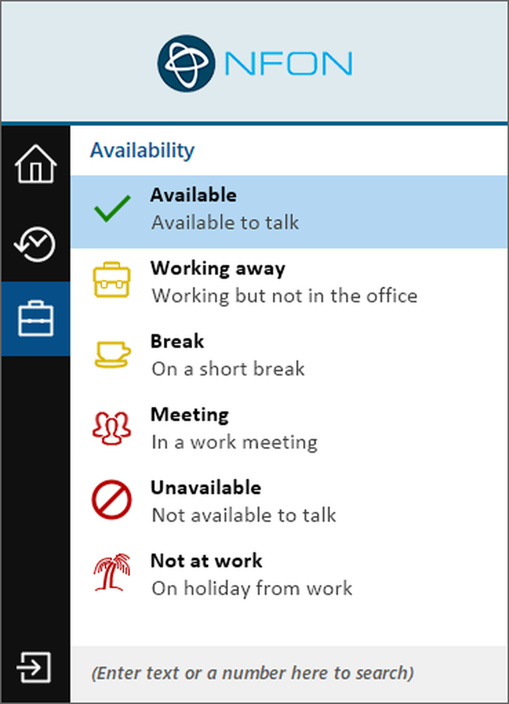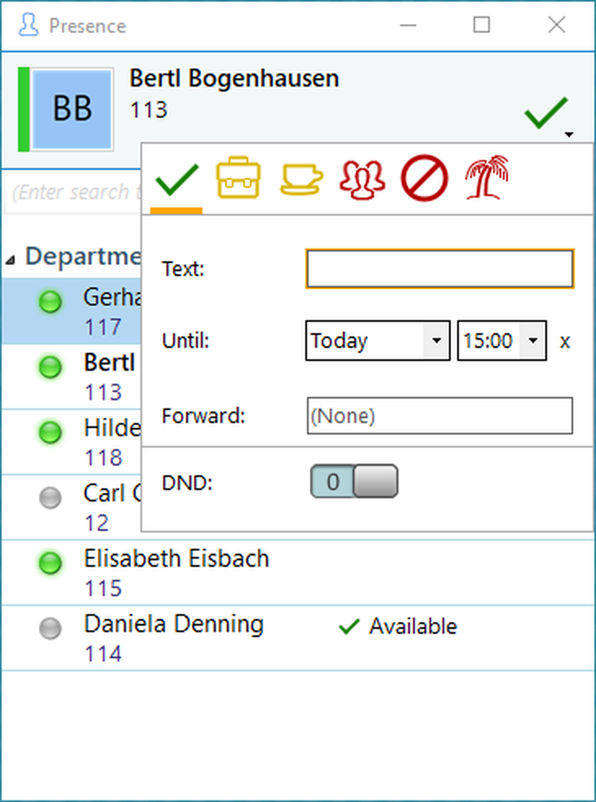 Sie haben die Möglichkeit die Verfügbarkeit, welche Ihren Kollegen angezeigt wird individuell anzupassen. Dies ist z. B. von Nutzen wenn Sie sich in einem Meeting befinden und keine internen Anrufe bekommen möchten.