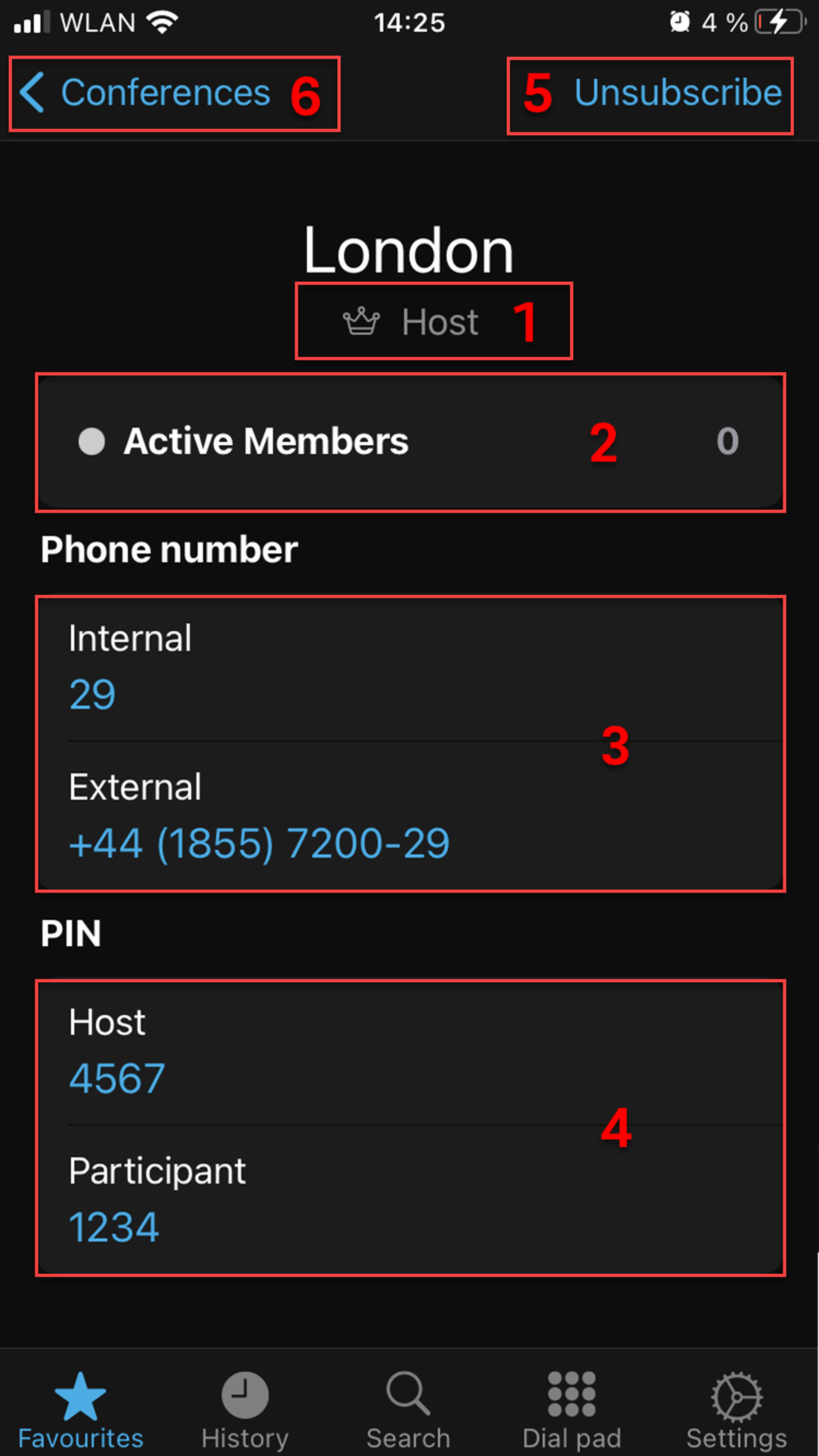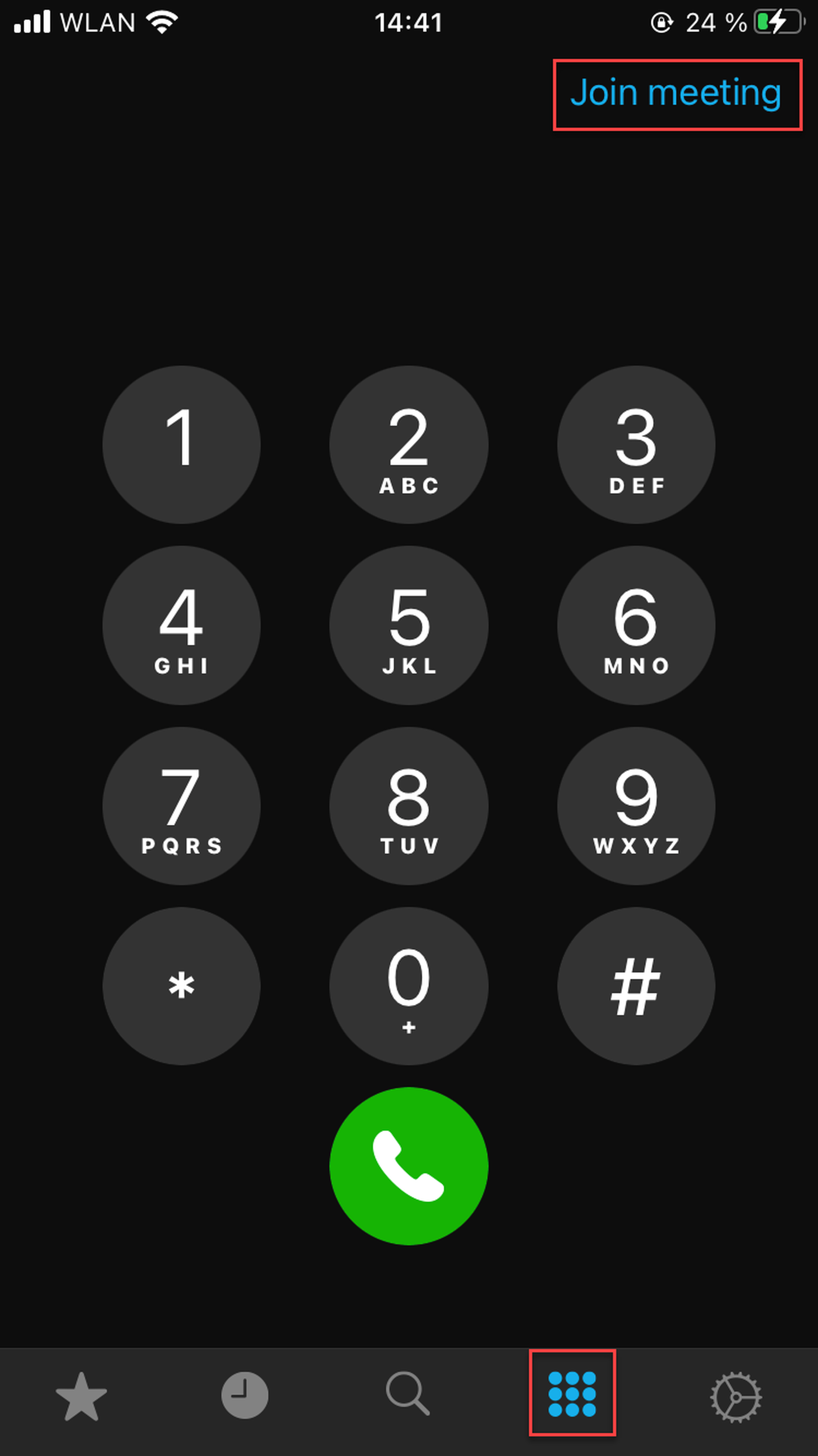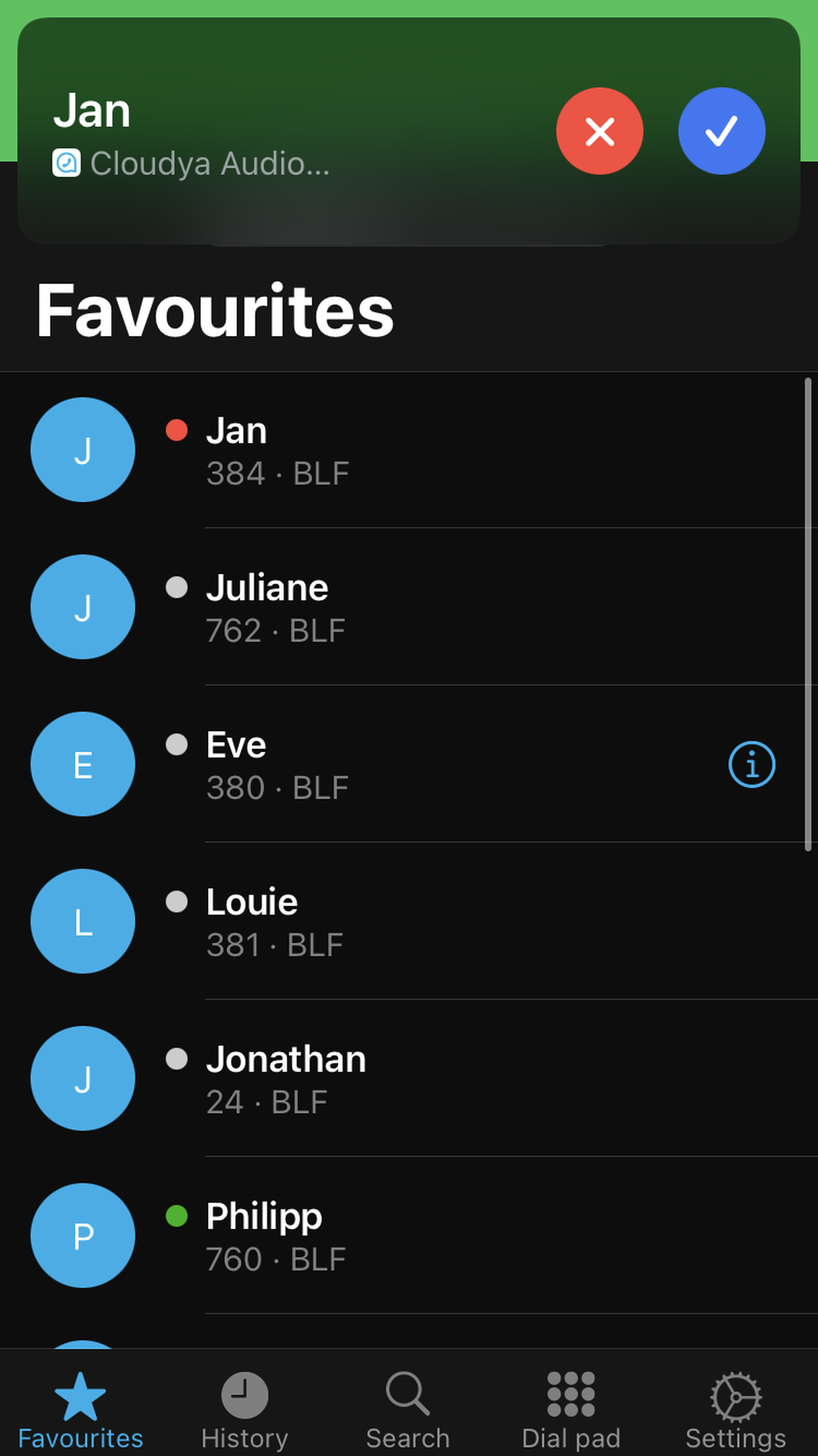 Switch to Favourites, Search, Dial pad or Settings tabs