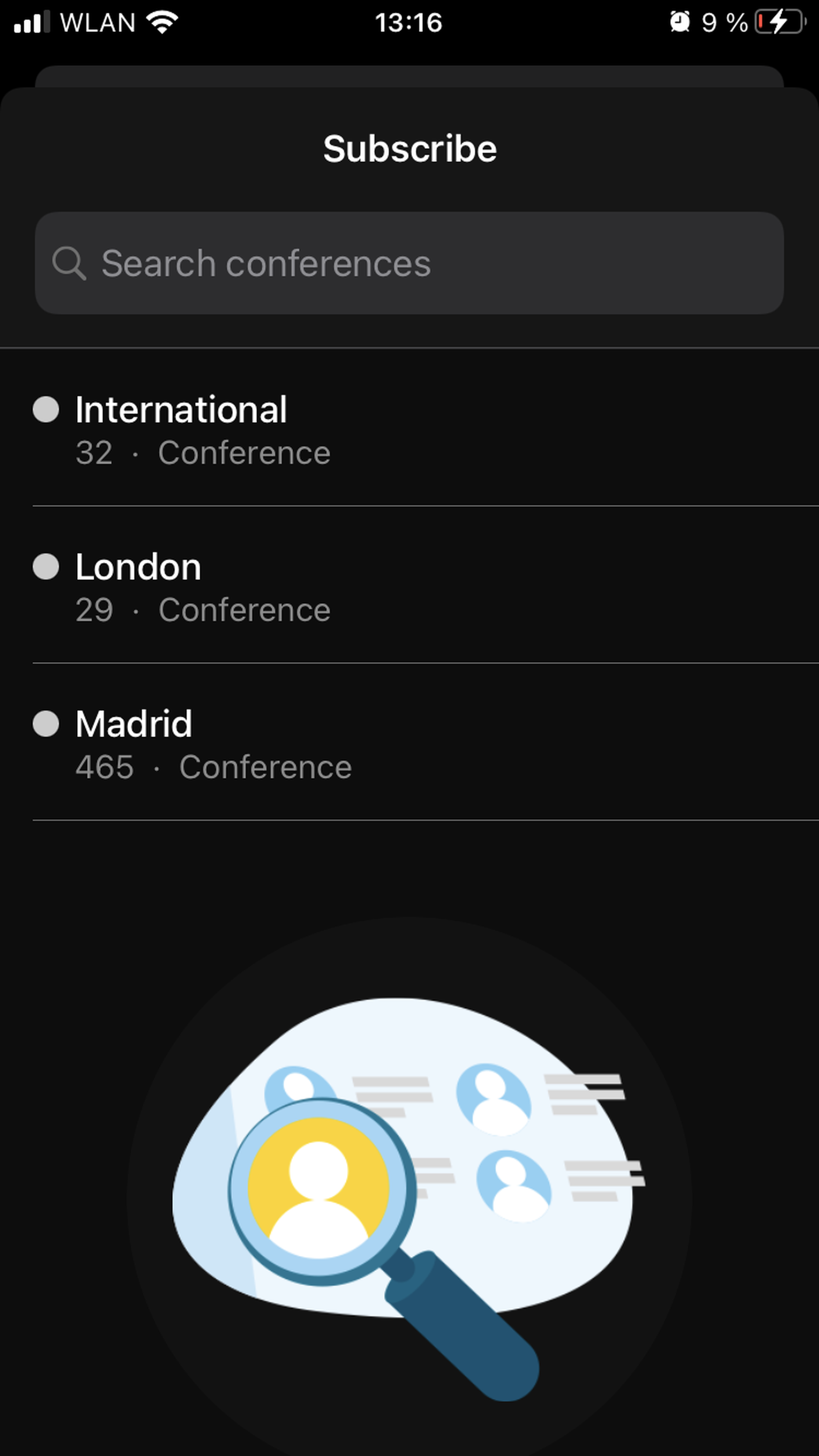 If you click on the info button next to a conference name, you can see detailed information about a conference.