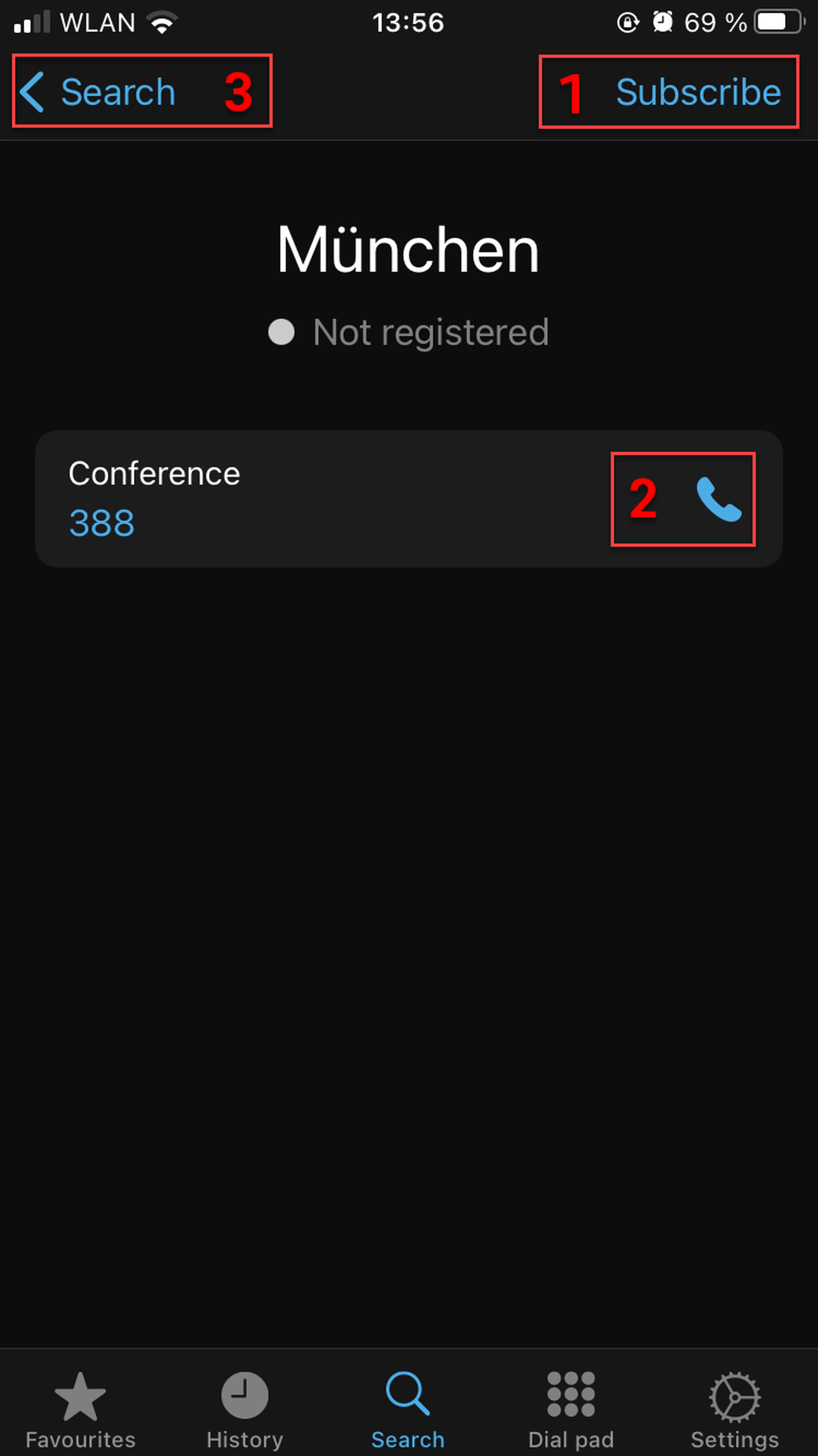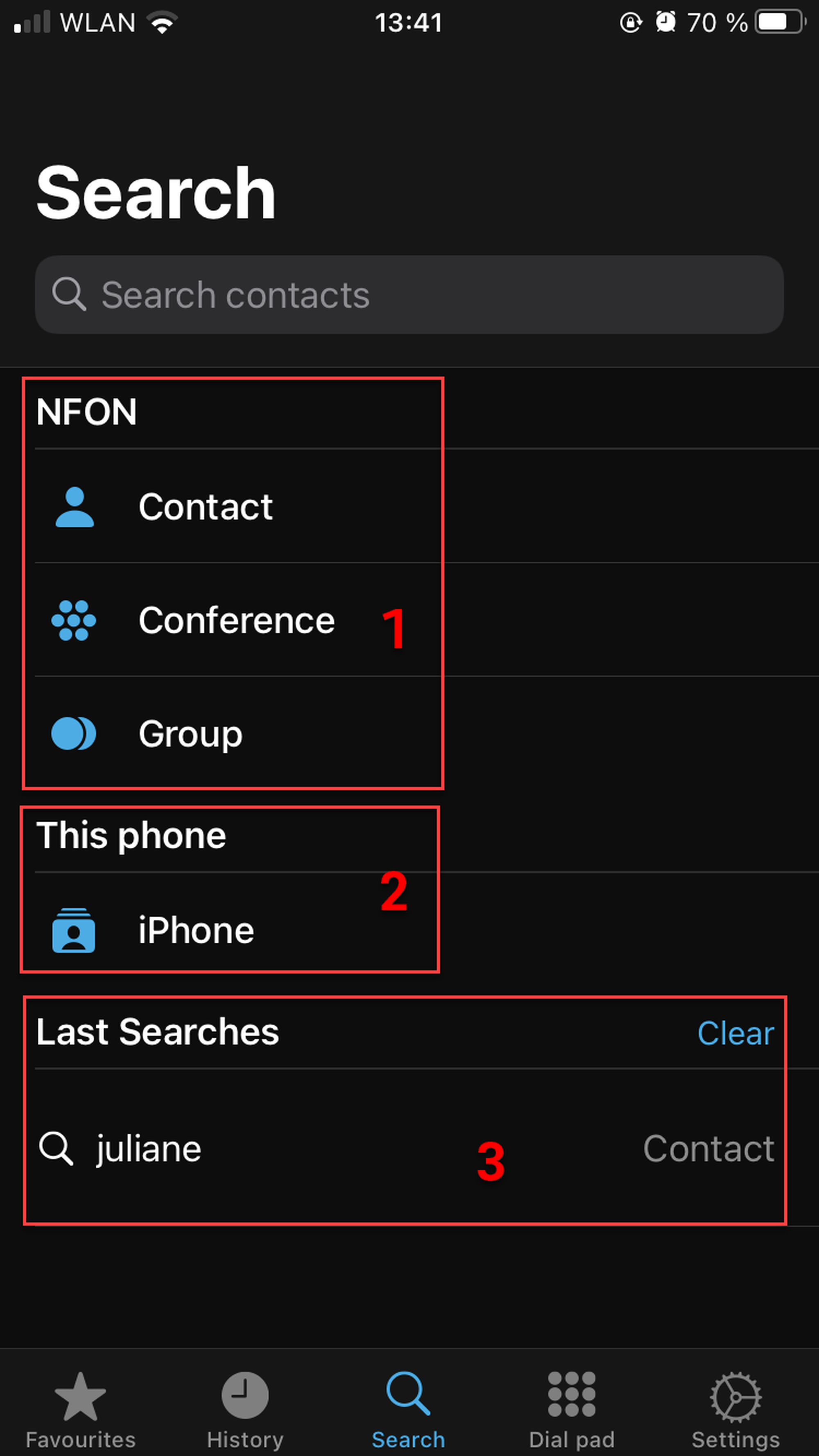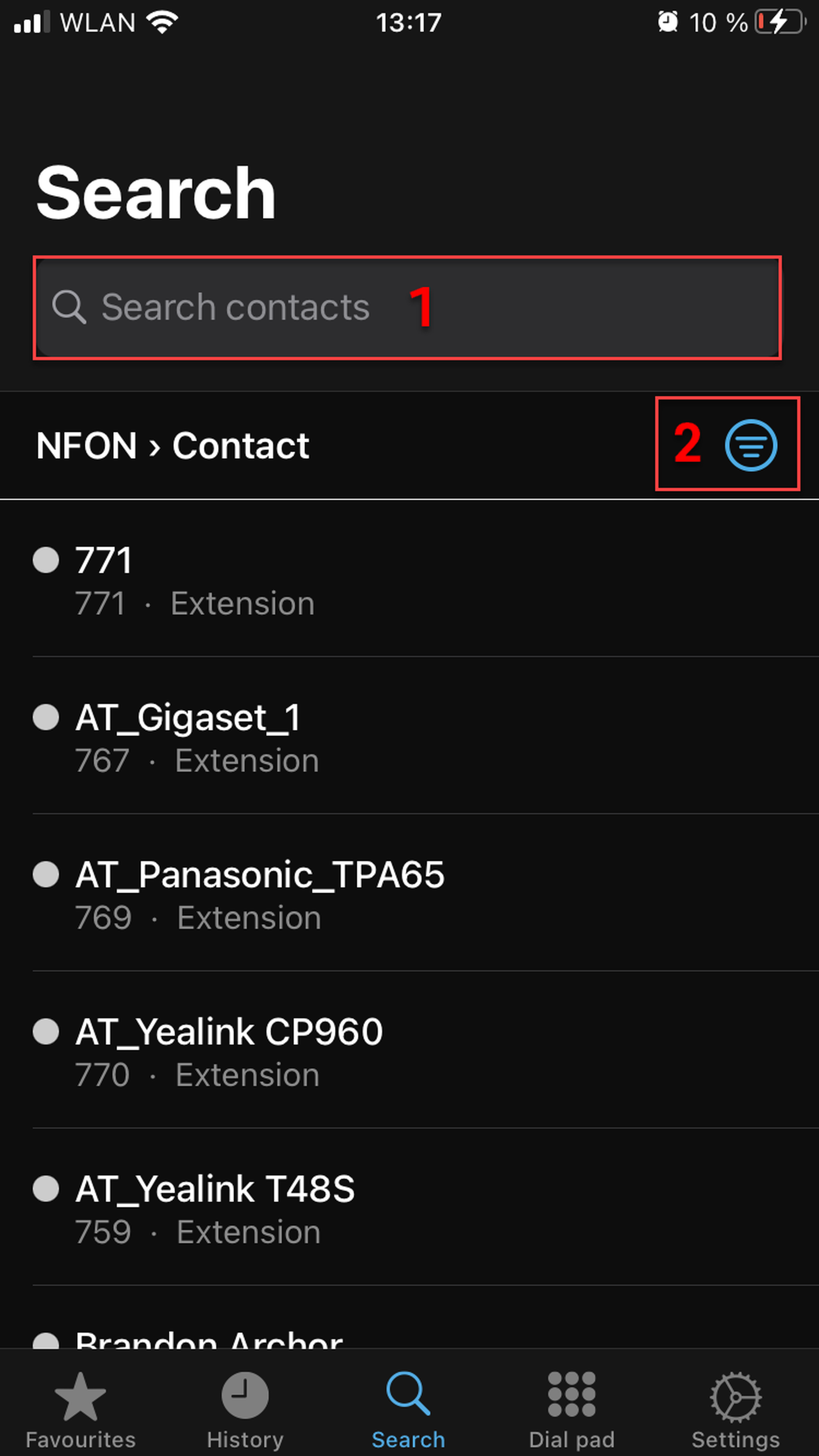 In the Search tab, you can search for dial targets from the PBX as well as your phones contacts.