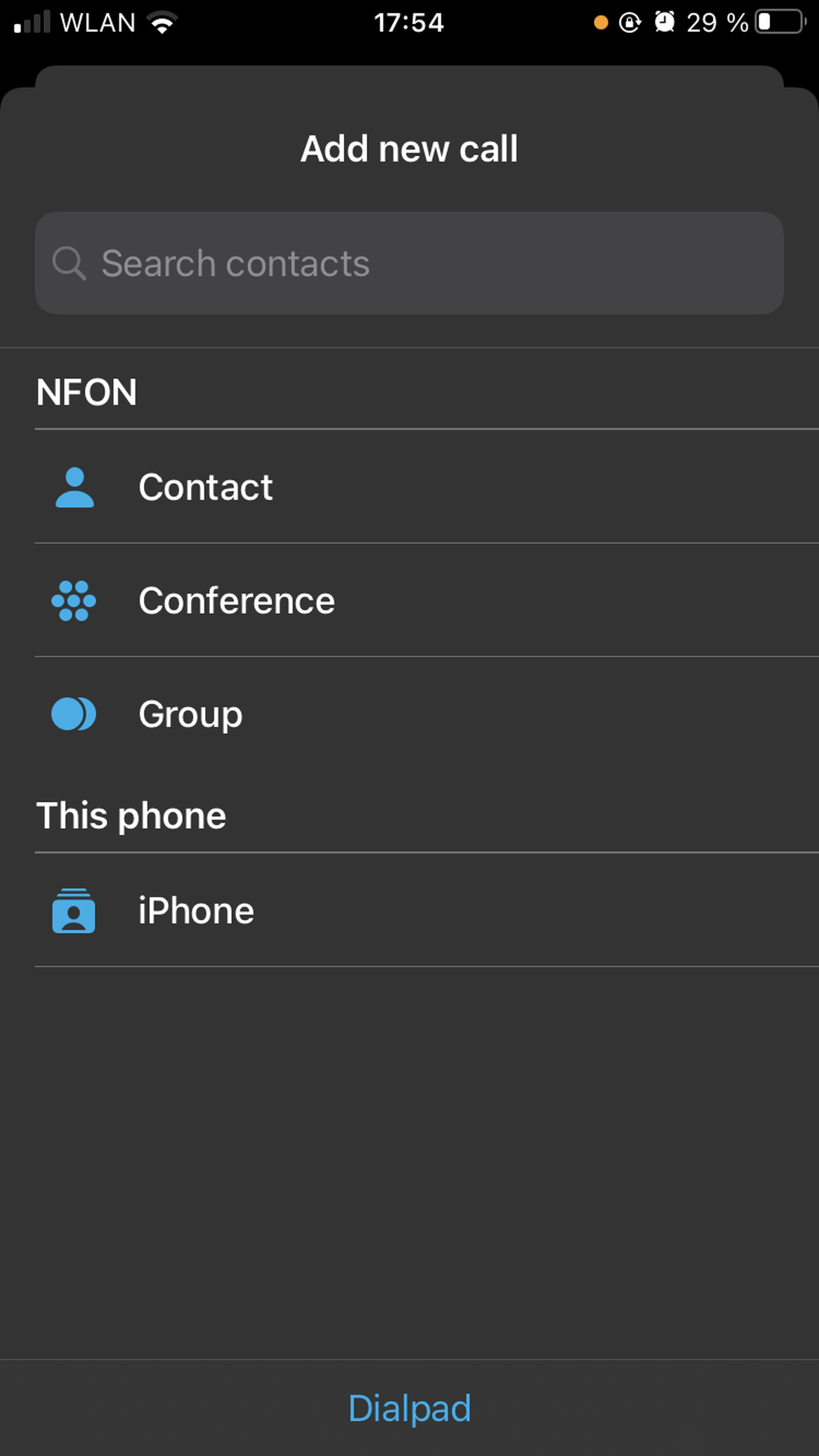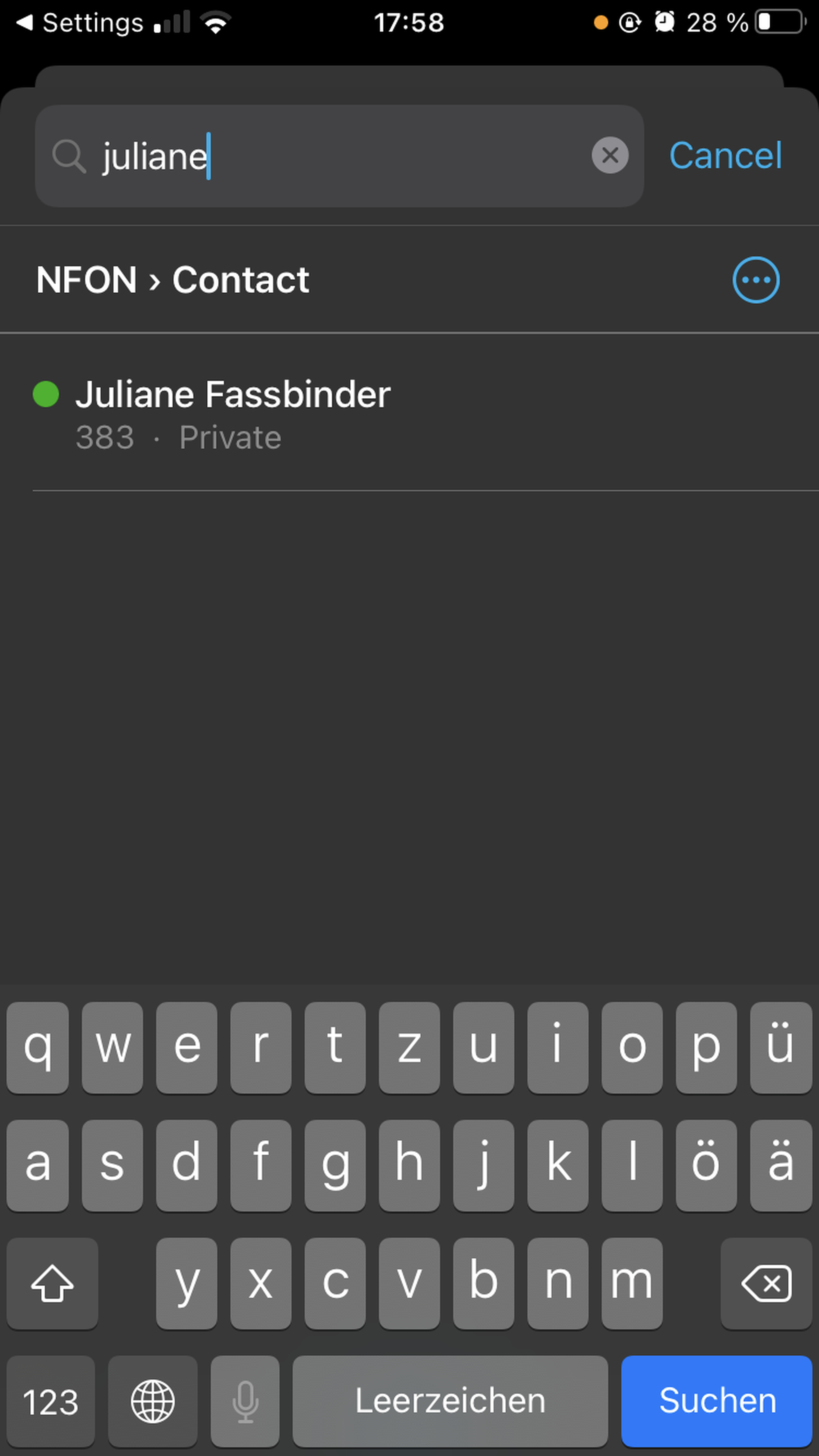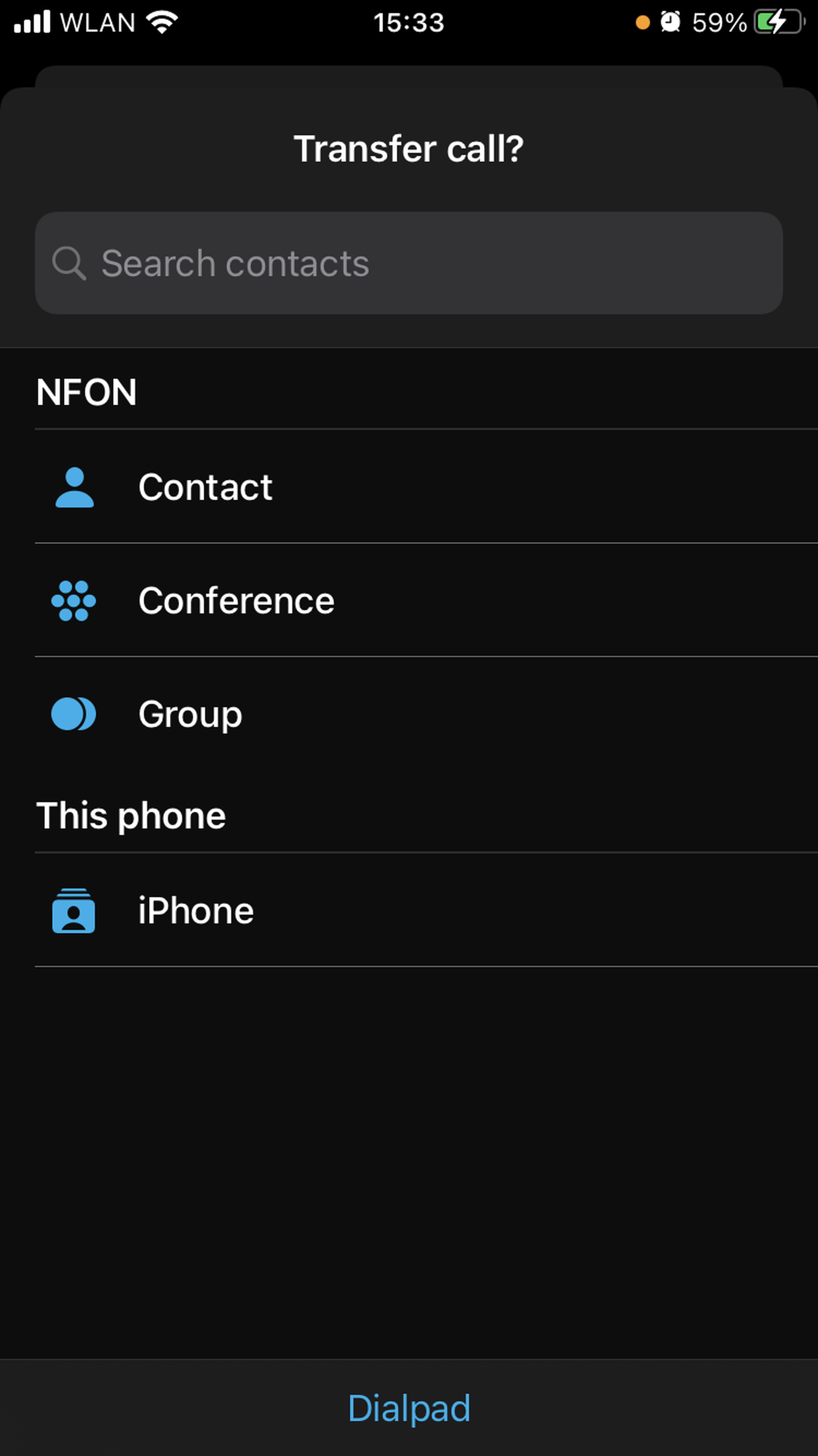 In the Search tab, you can search for dial targets from the PBX as well as your phones contacts.