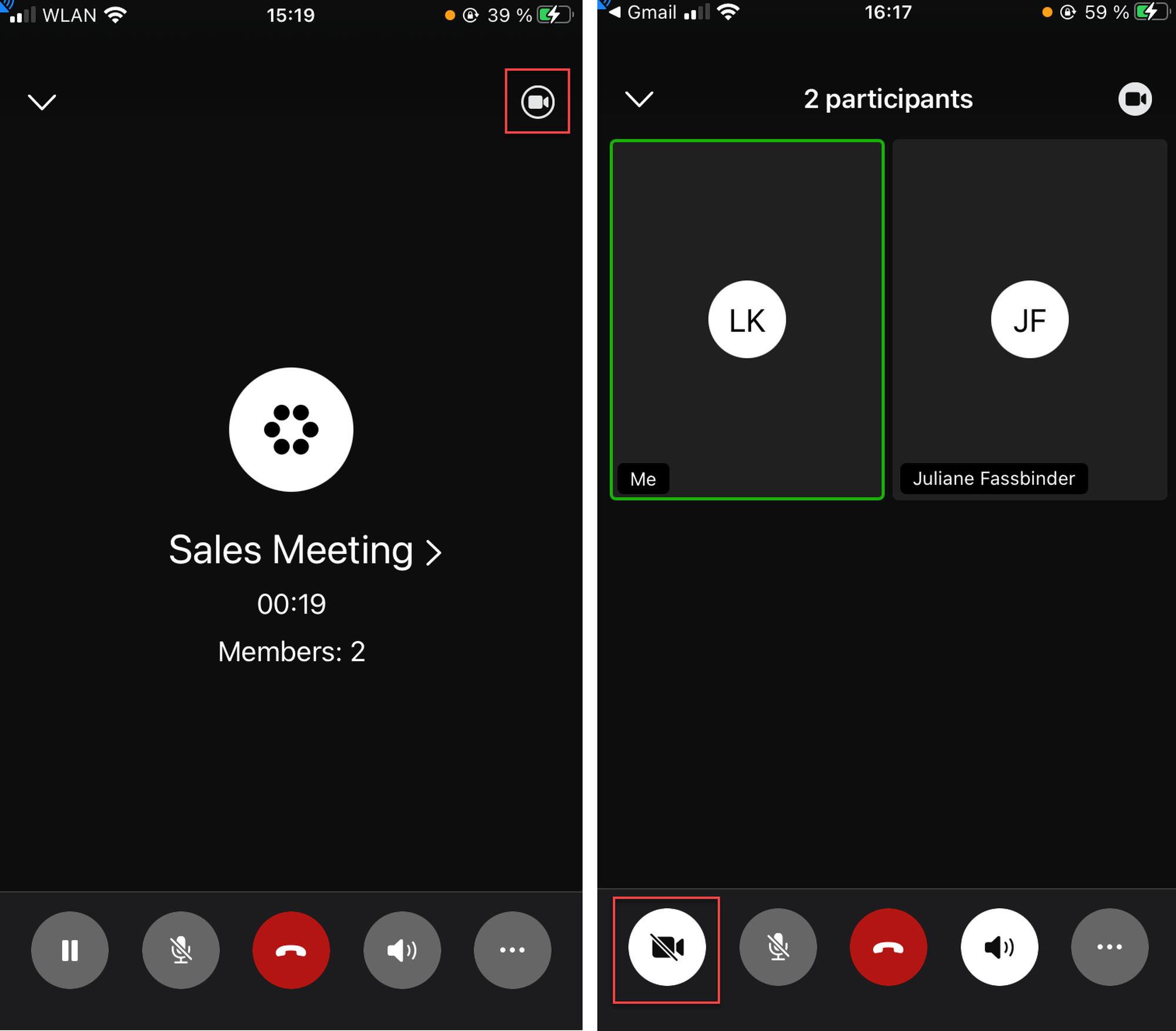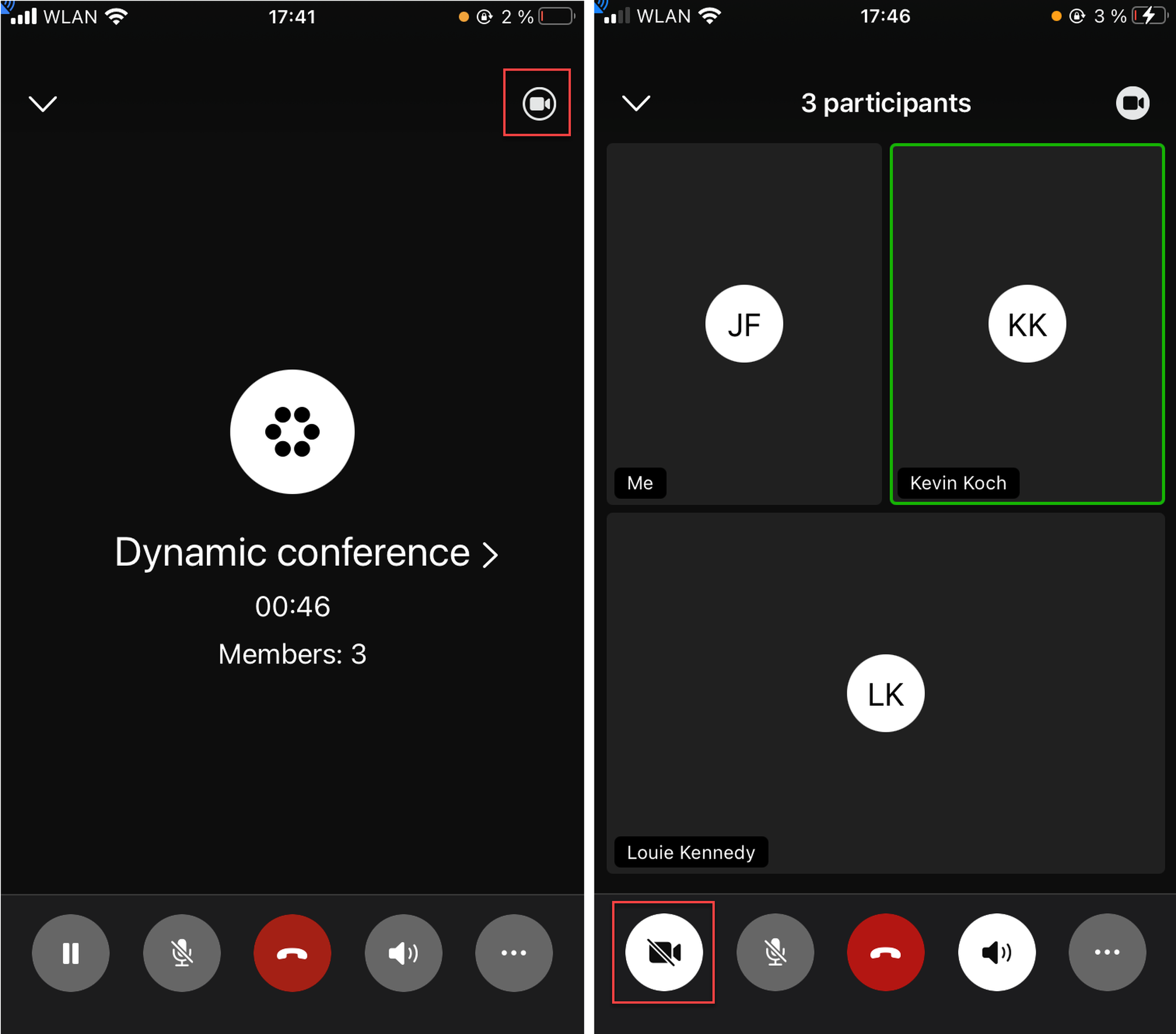 Put the conference on hold (cameras are switched off automatically and the conference goes to the audio mode; press unhold to resume the meeting; to switch back to the video mode, tap on the top-right camera and then the camera in the bottom bar)