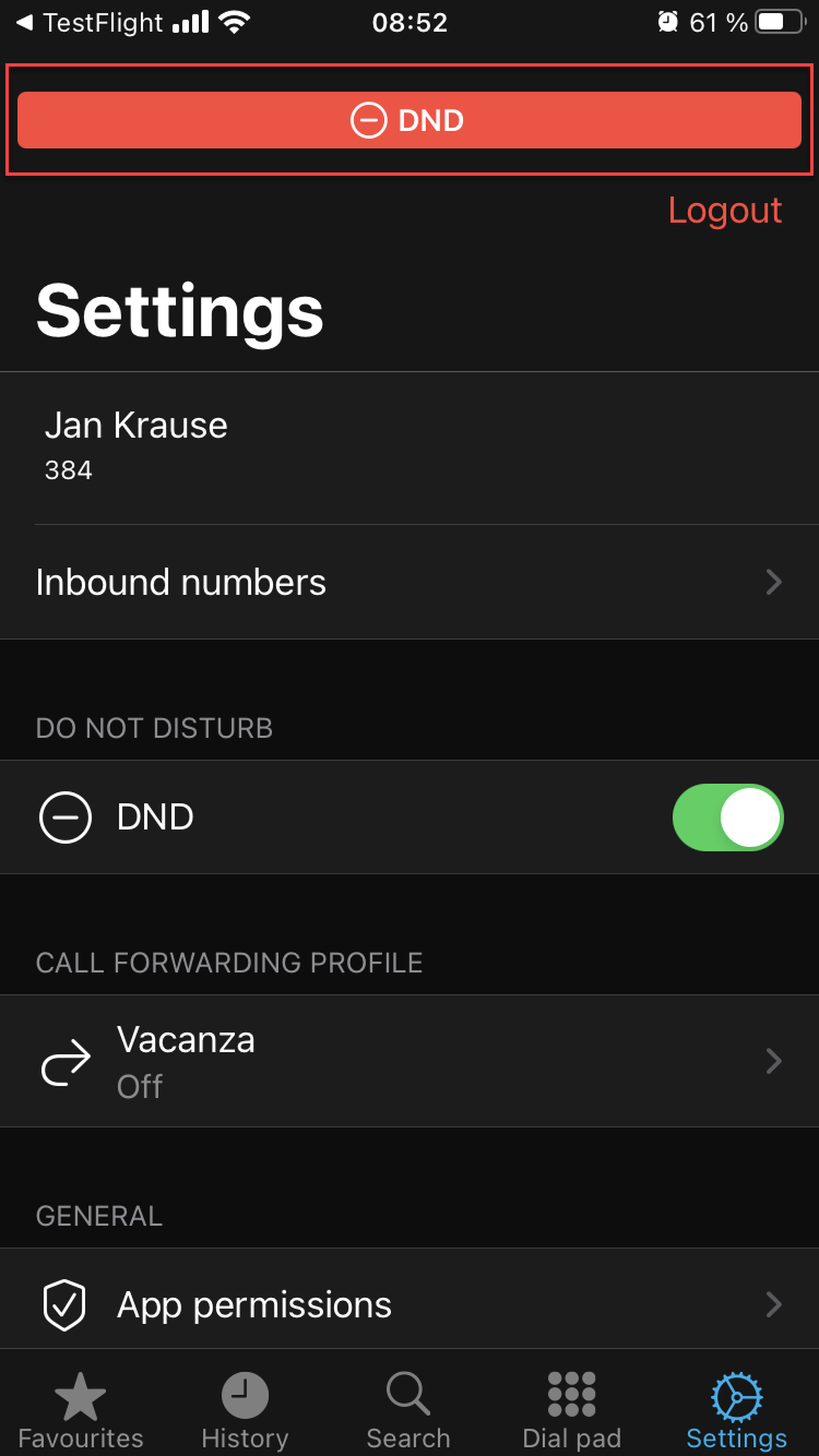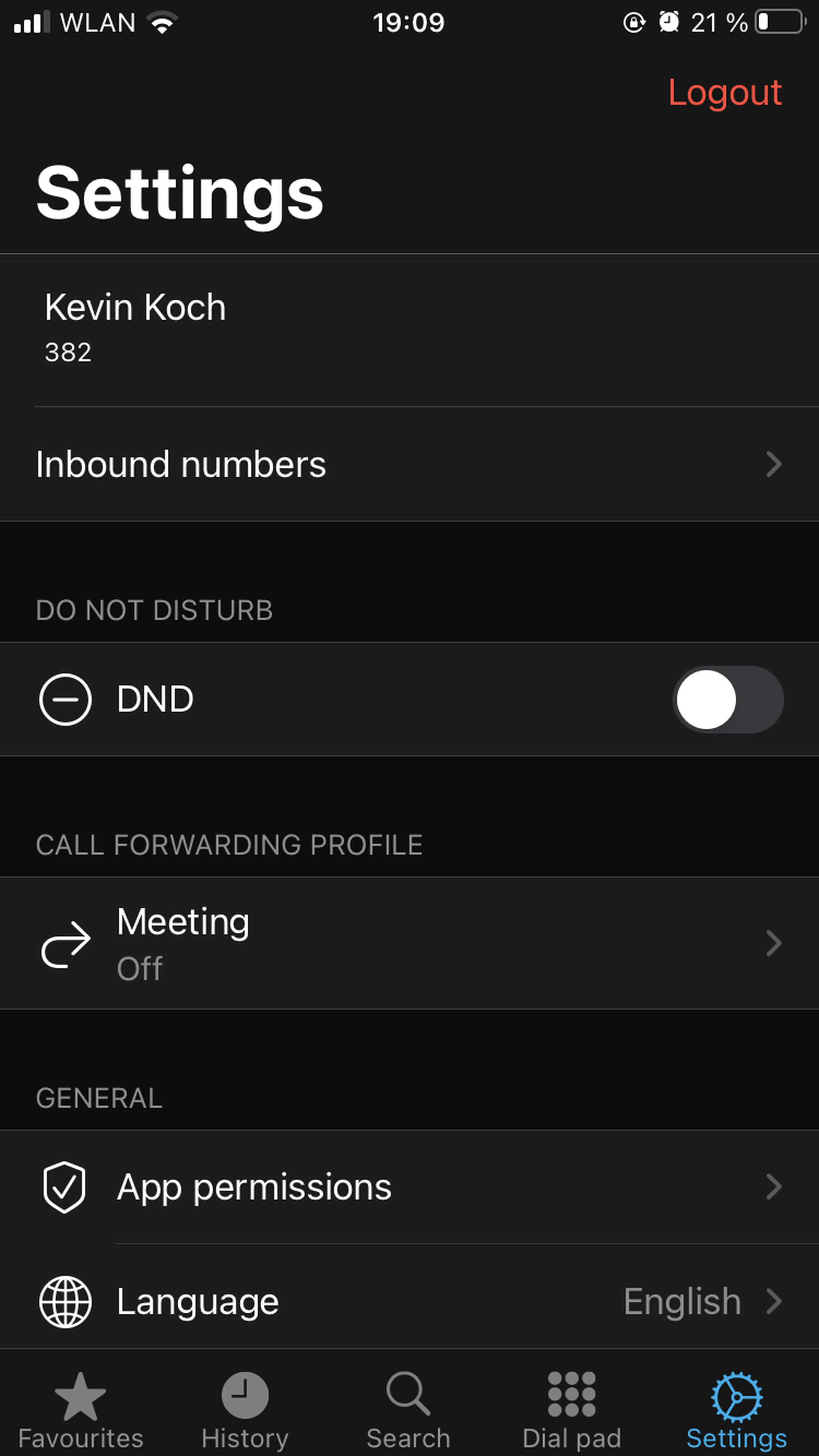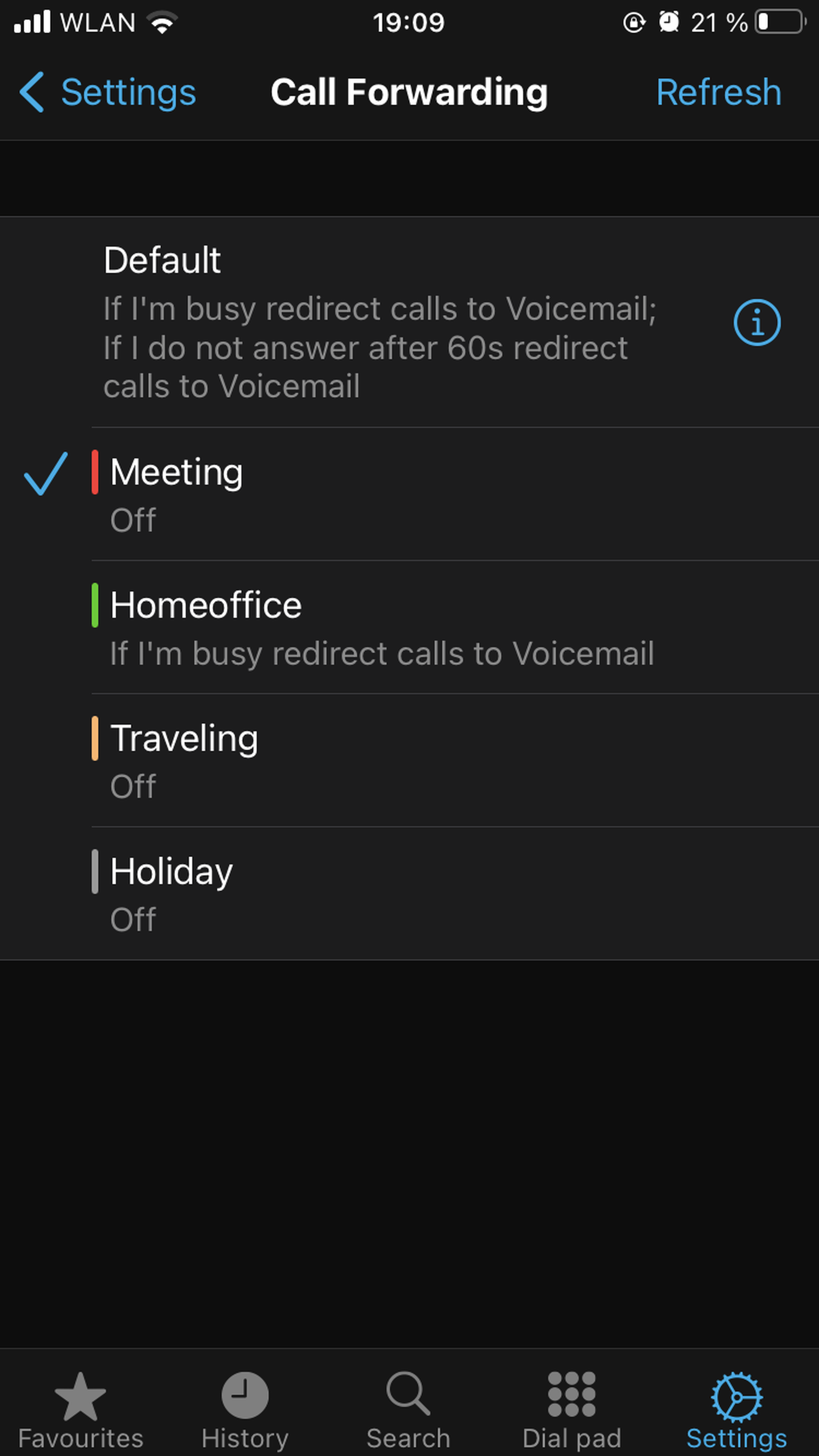 In the Phone Up Web App, you can create your personalised profiles for certain scenarios, for example, Meeting, Home office, Holiday, assign a colour to them and set a target phone number to which the call can be forwarded to. In the mobile app, you can select between the call forwarding profiles.