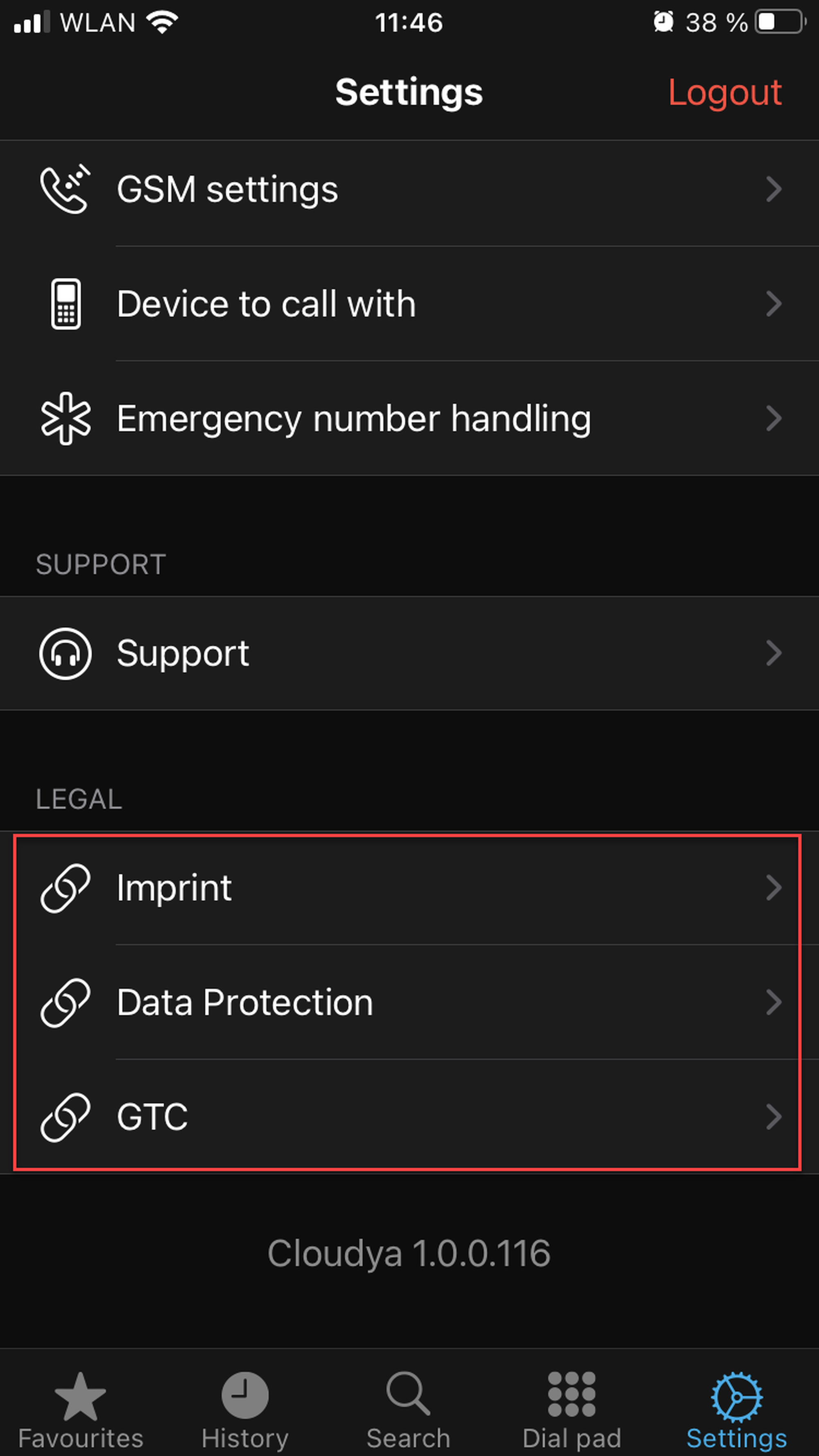 Tapping on Imprint, Data Protection or GTC will take you to a website where you need to select your contracting party to receive the respective documents.