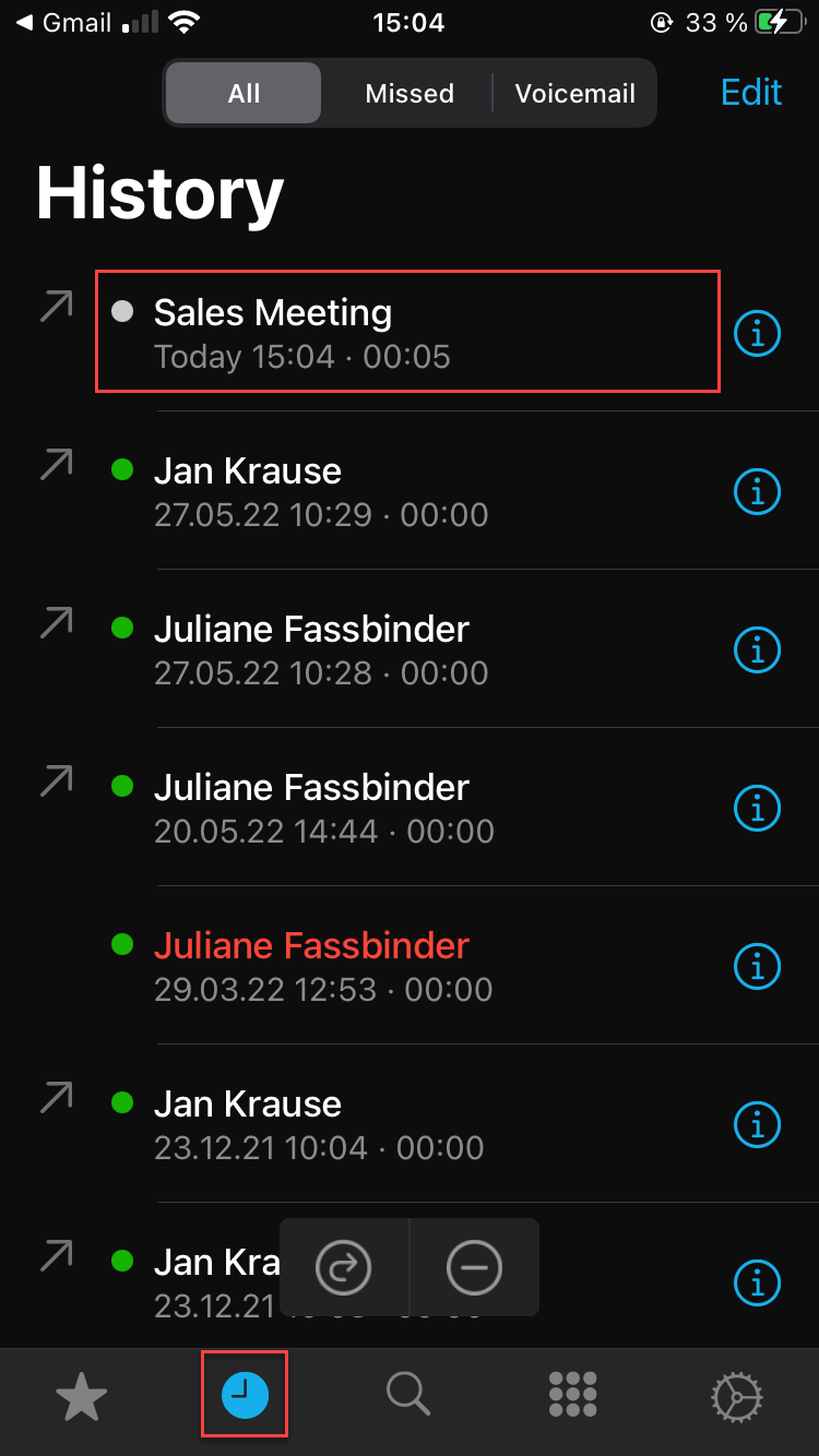 The History tab shows a list of recent calls. The call history is updated automatically; however, you can manually update it by swiping from top to bottom.