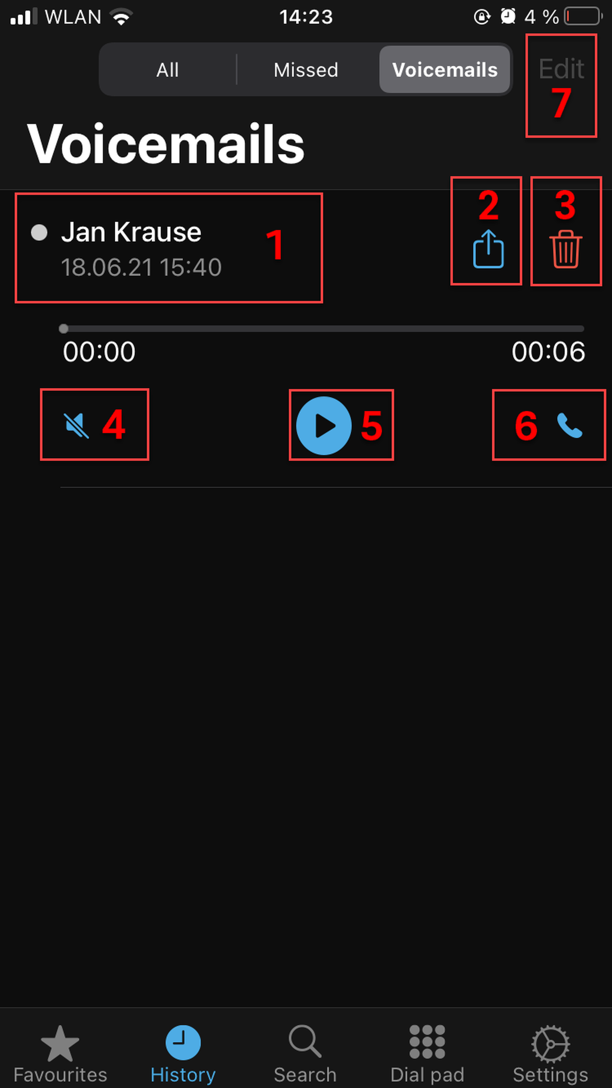 Edit the calls (delete all or select some calls and then delete them). You can also delete a specific call by swiping across the call entry from right to left. It is also possible to delete a call entry if you click on the info button or the arrow symbol on the right; the Delete entry option is shown then.
