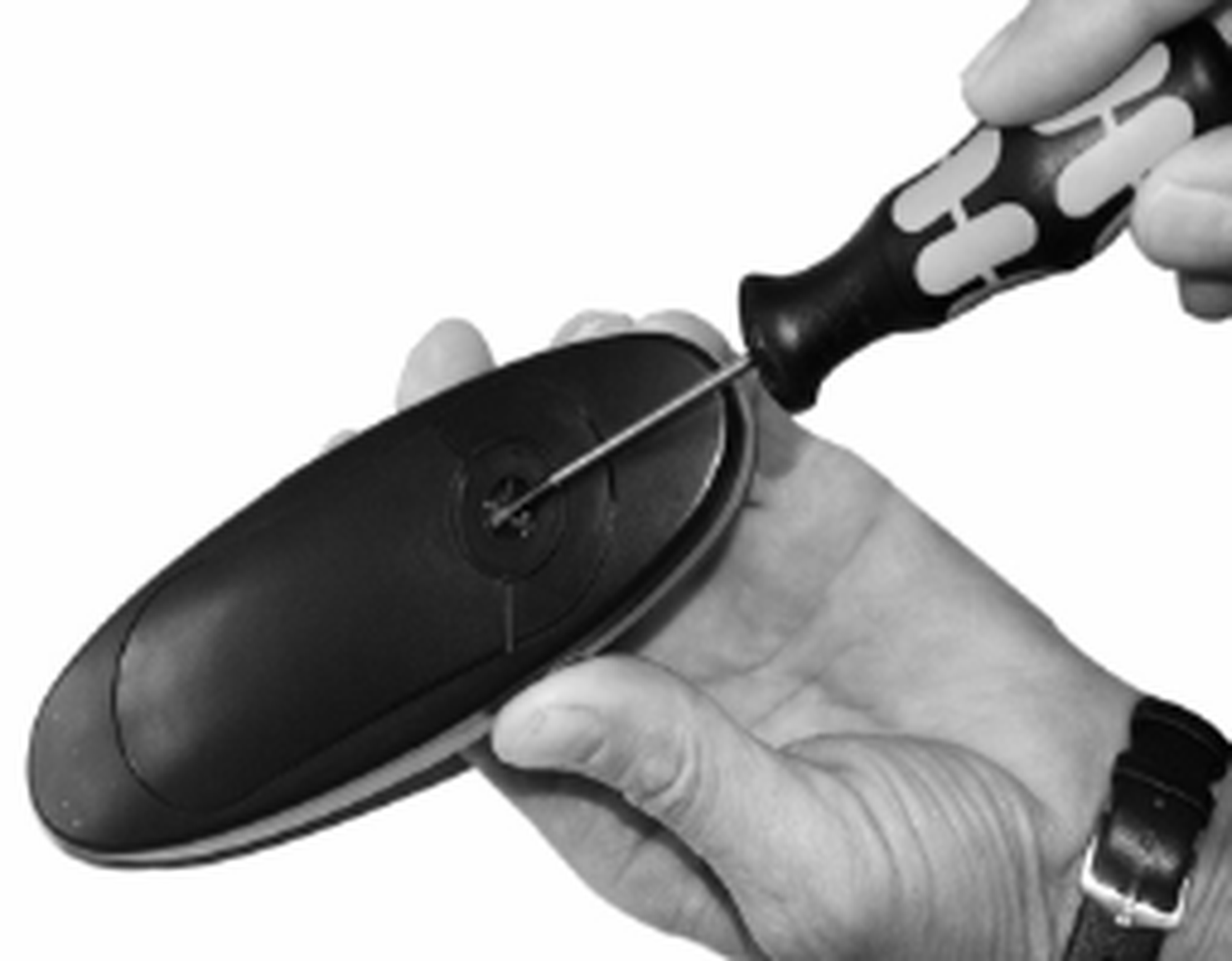 Also use the screwdriver to remove the battery cover. Insert the screwdriver into the small hole under the screw cover and use the screwdriver to push the battery cover upward (see image).