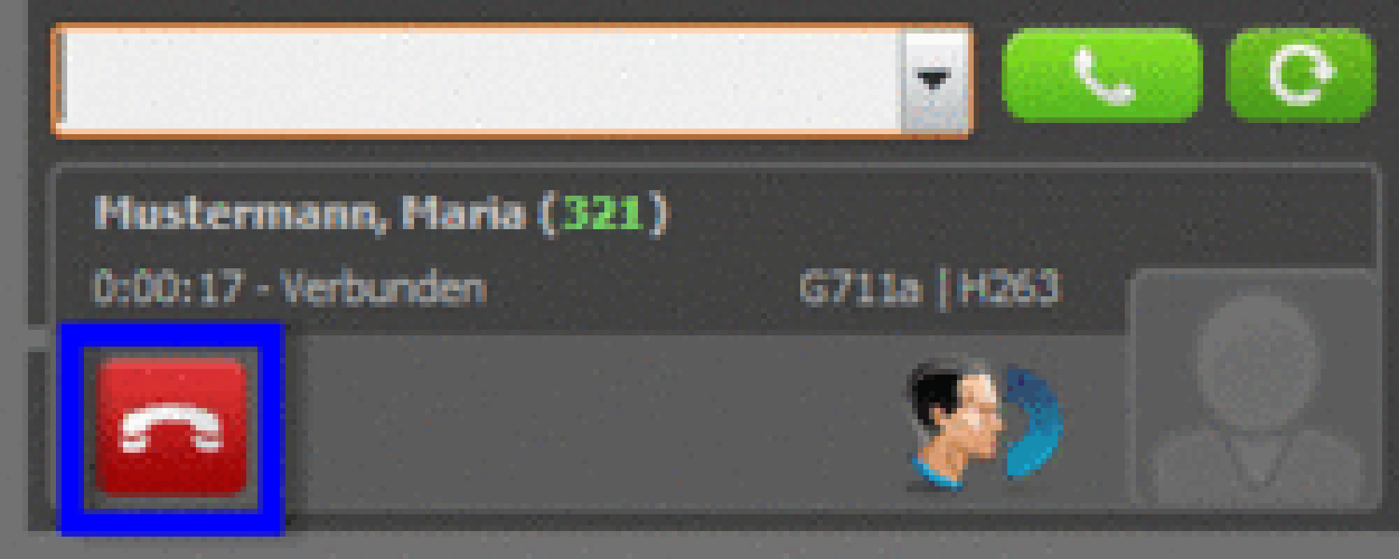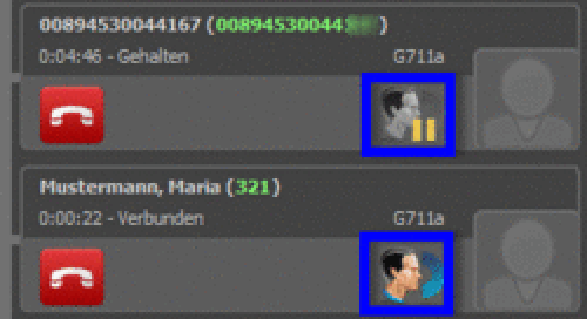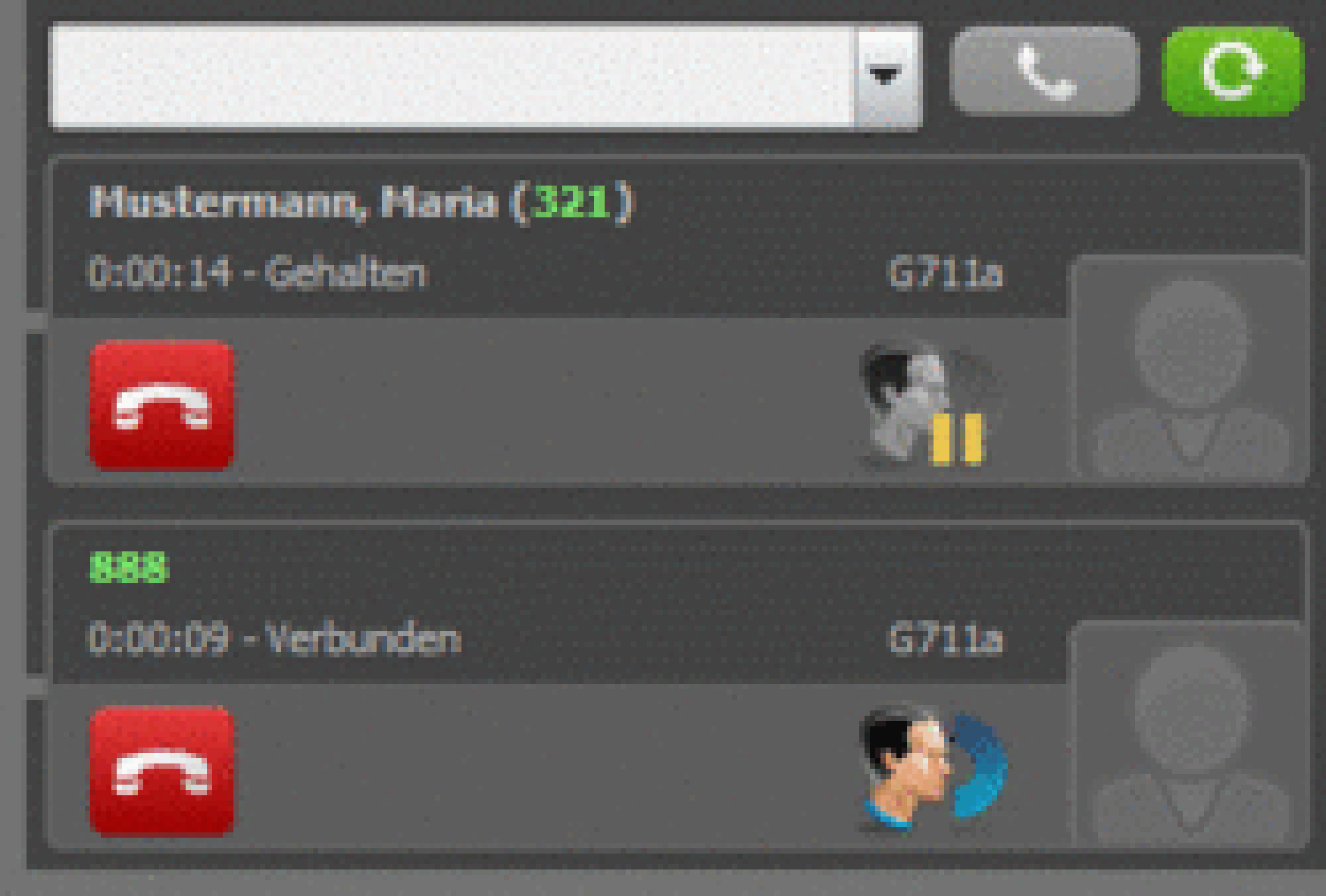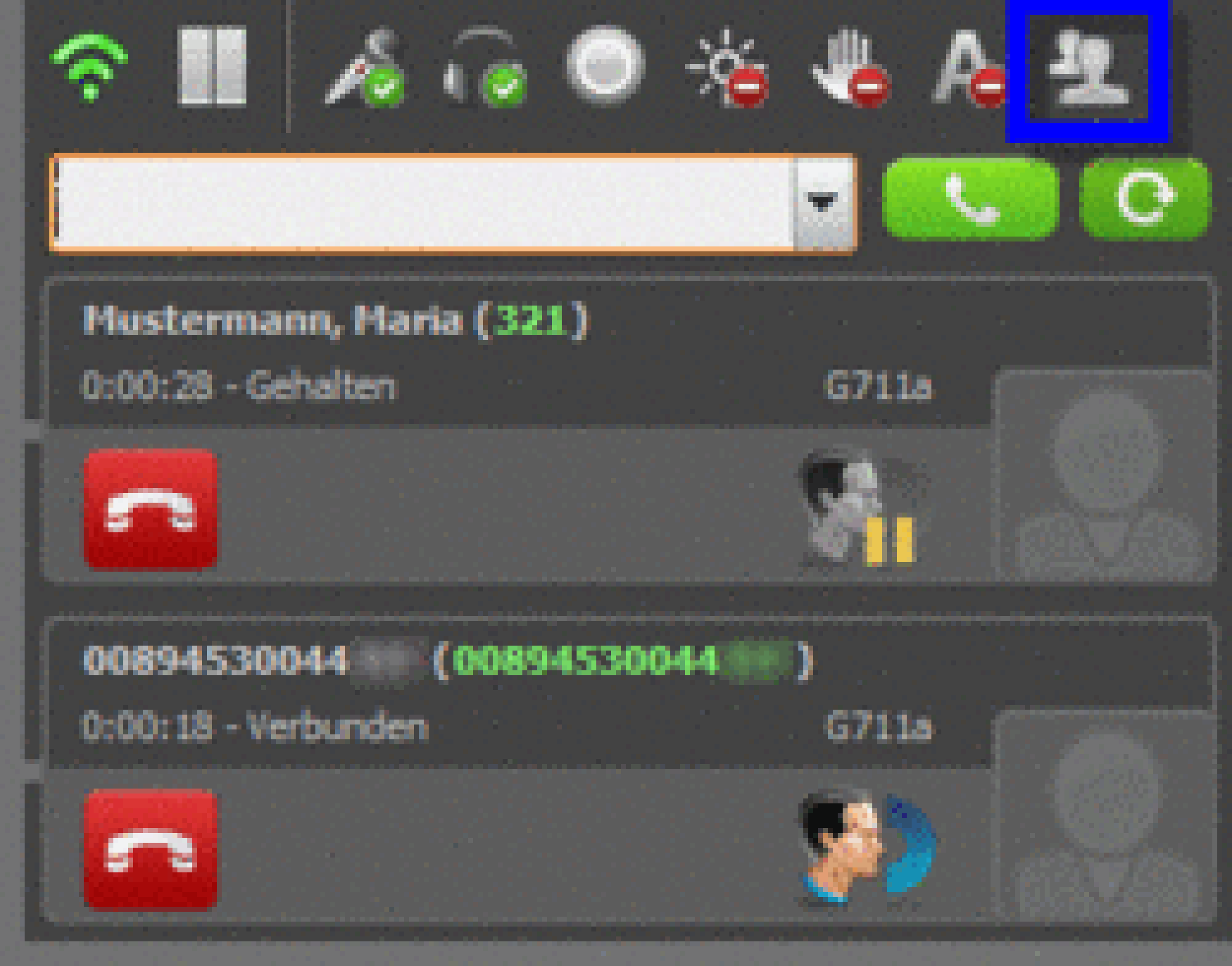 | Active conversation; by clicking this symbol, caller is placed on hold | |