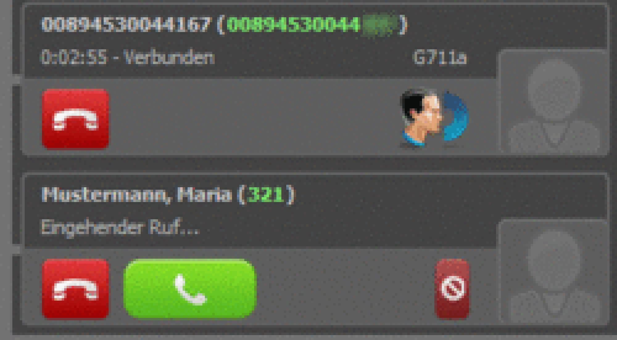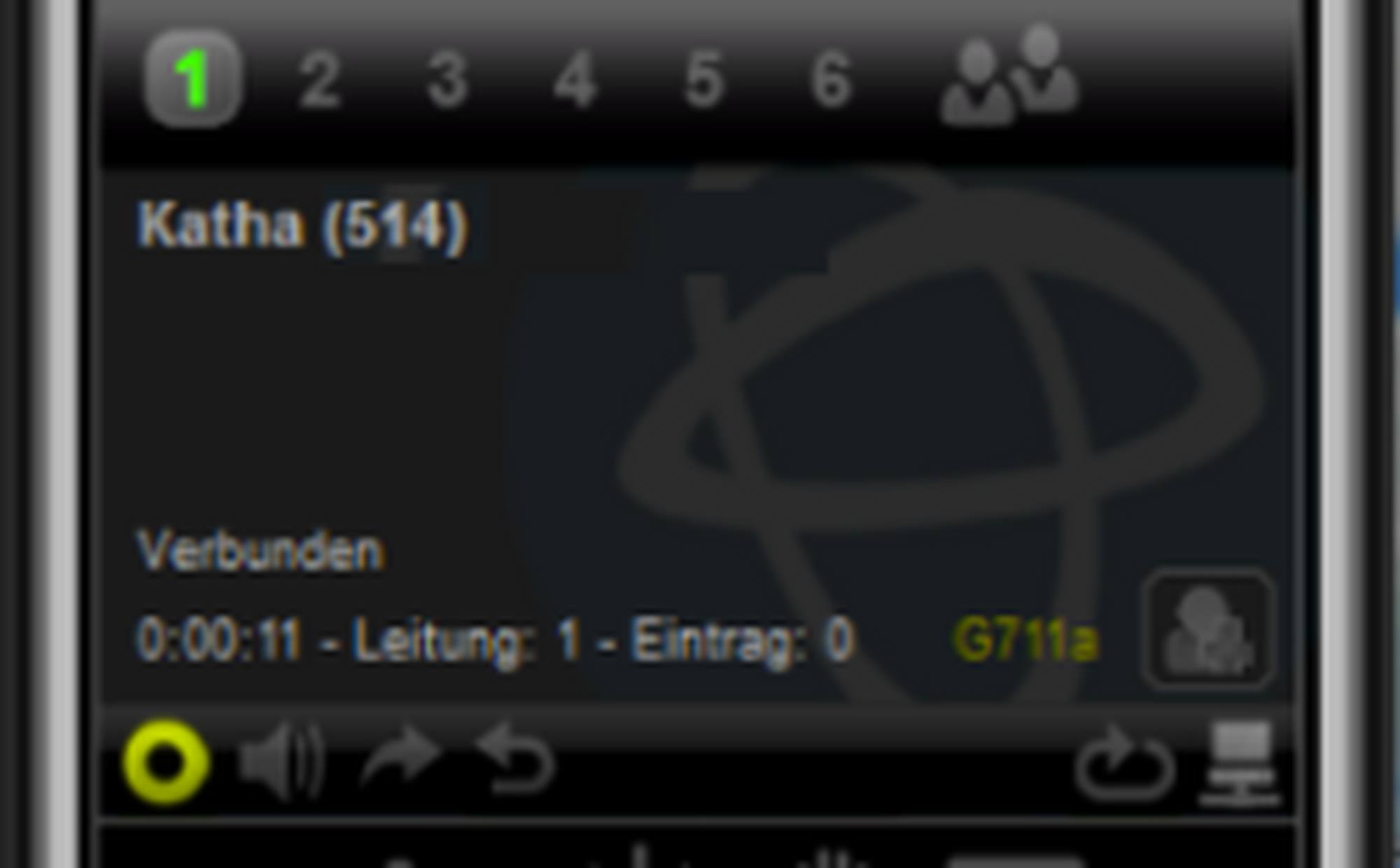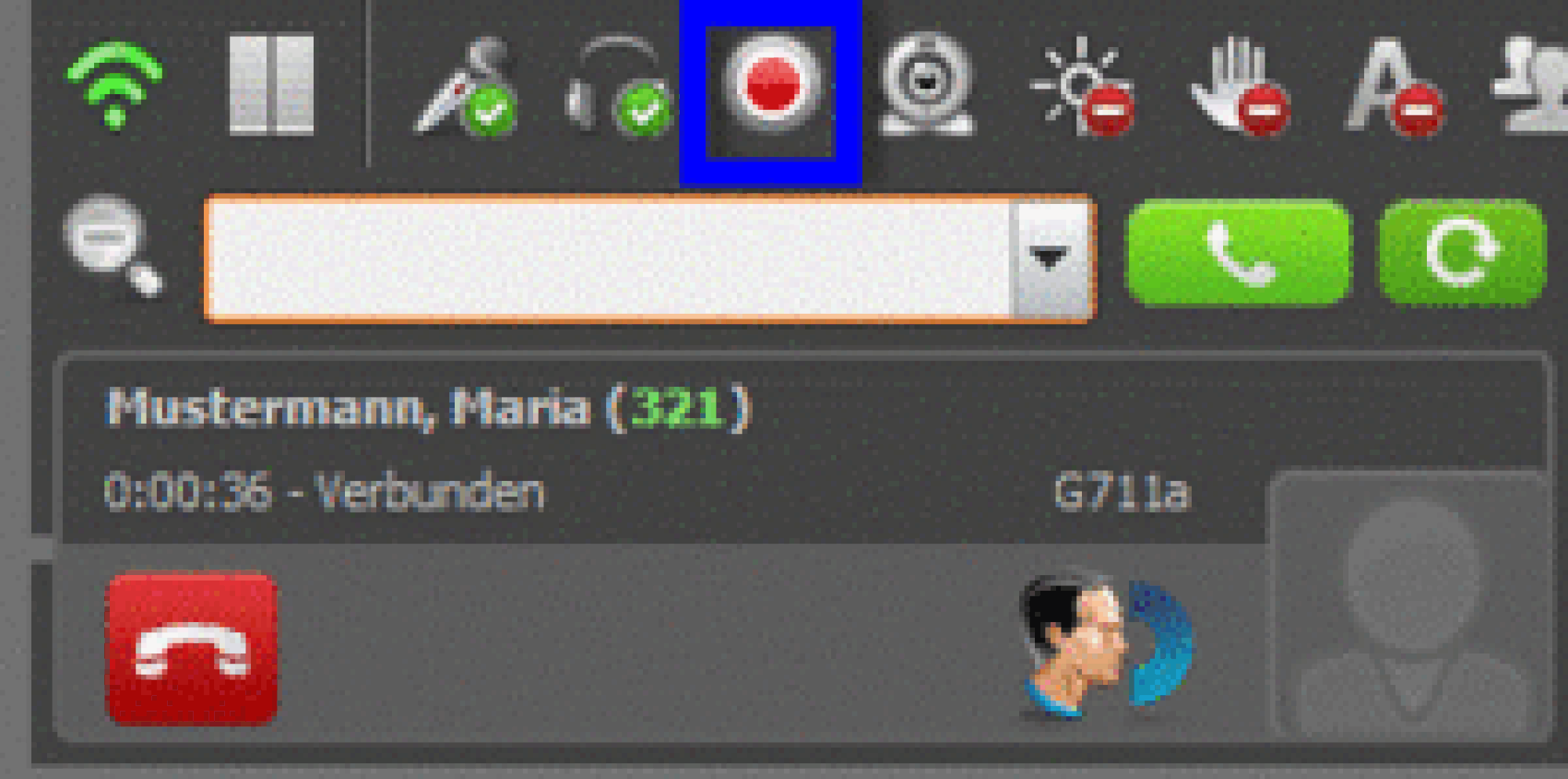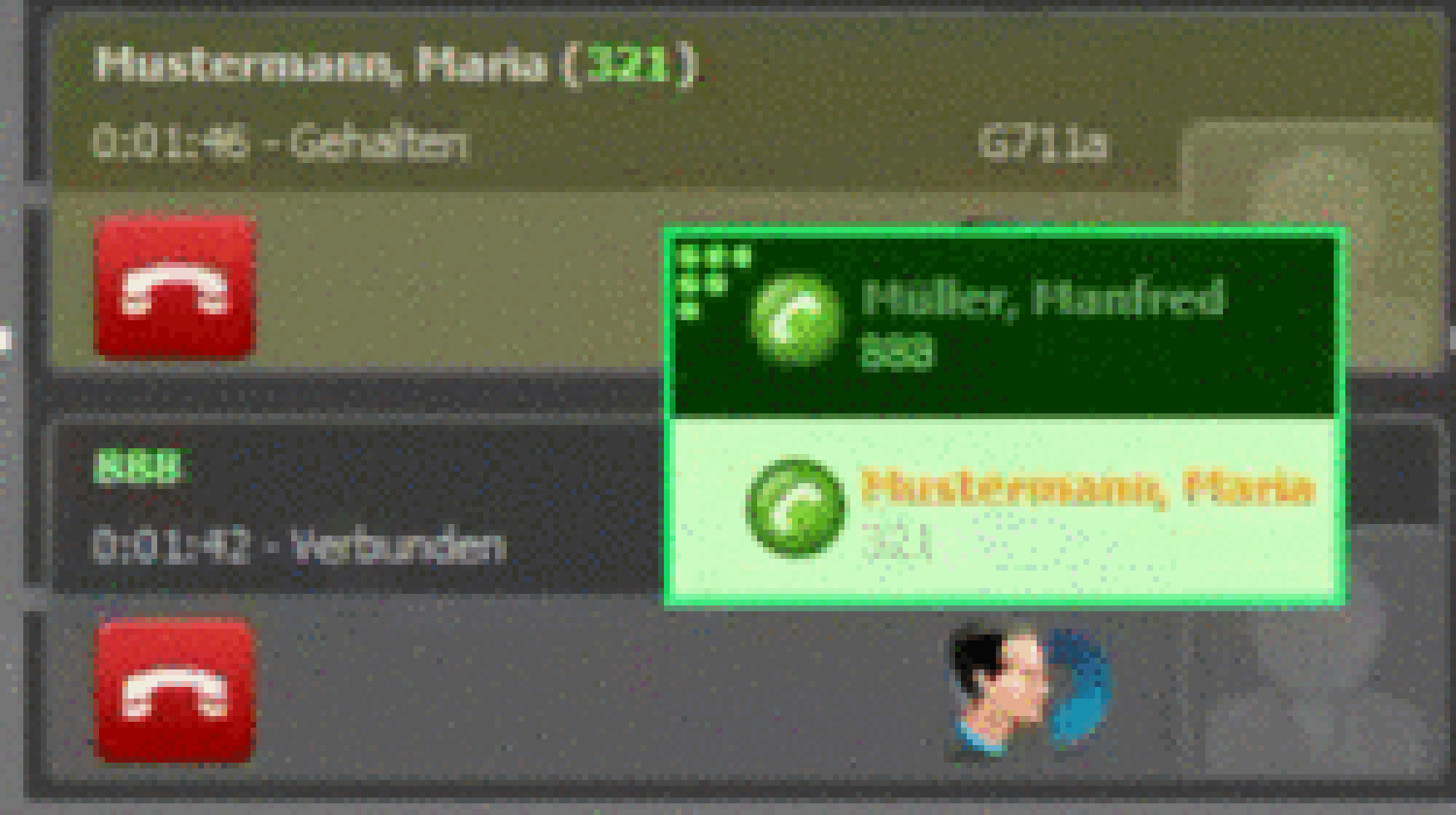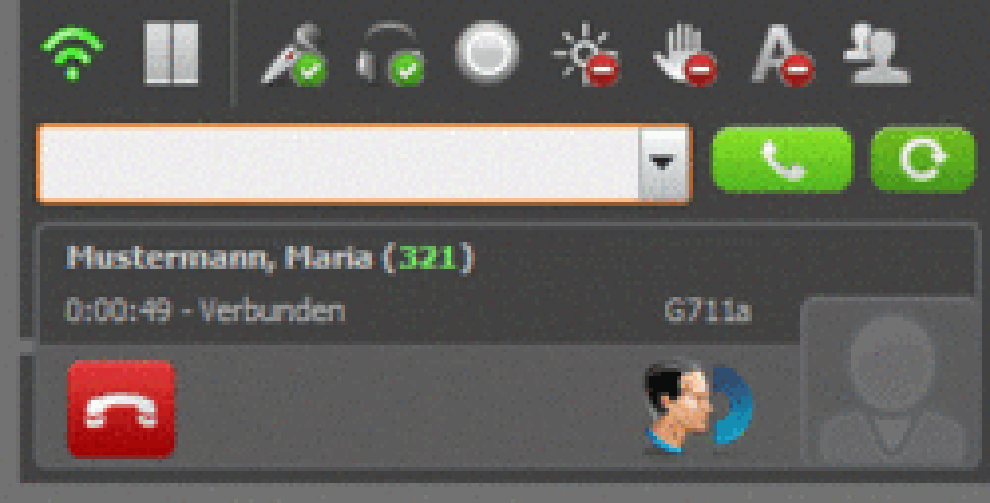 | Active conversation; by clicking this symbol, caller is placed on hold | |