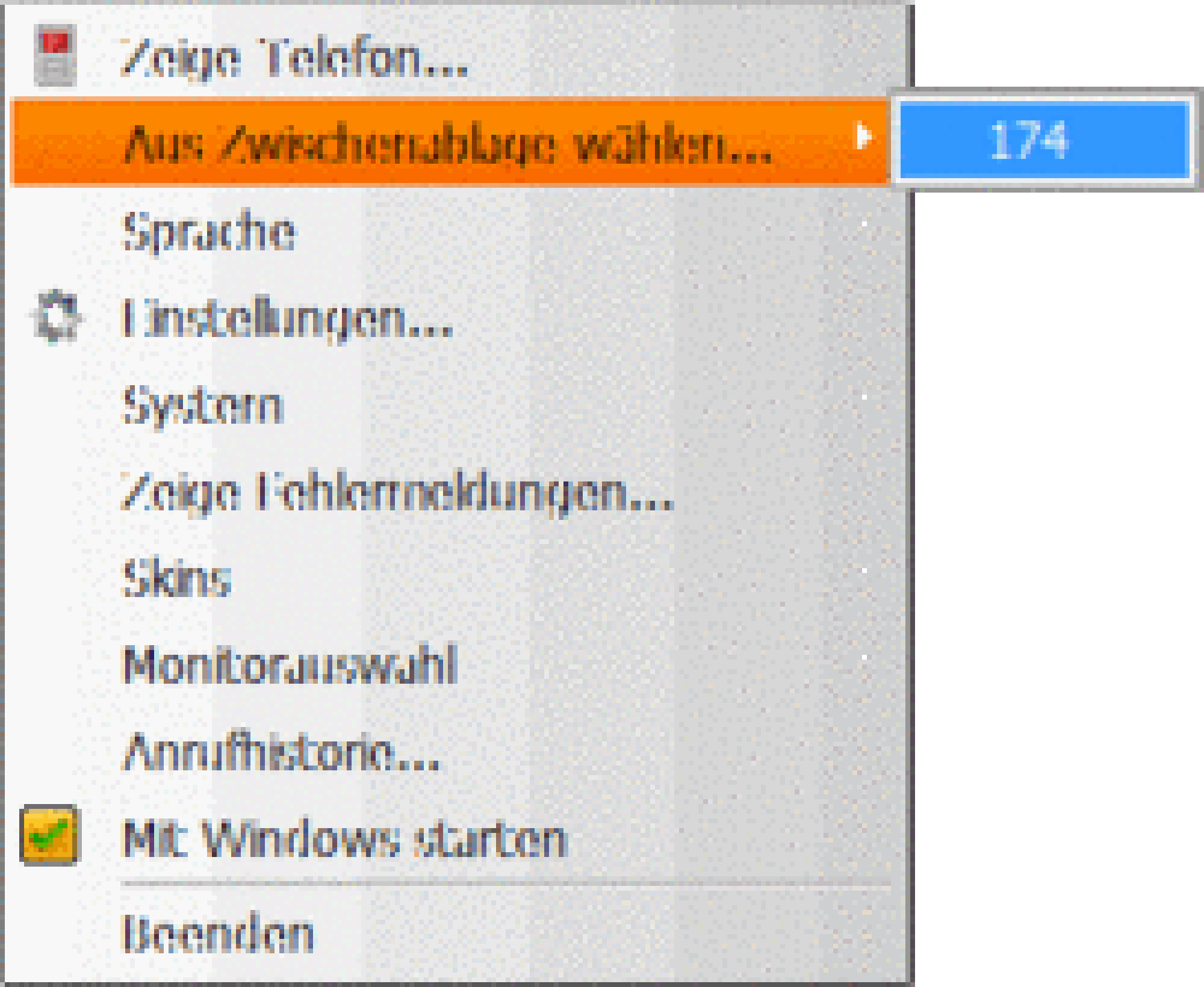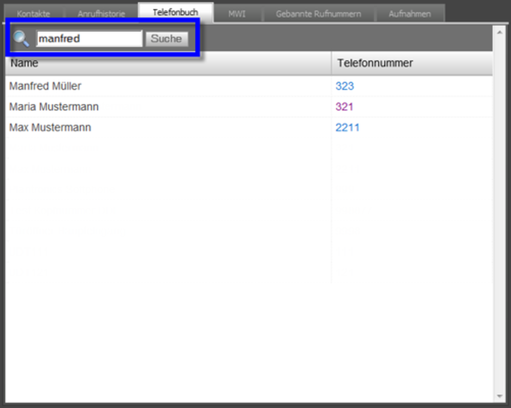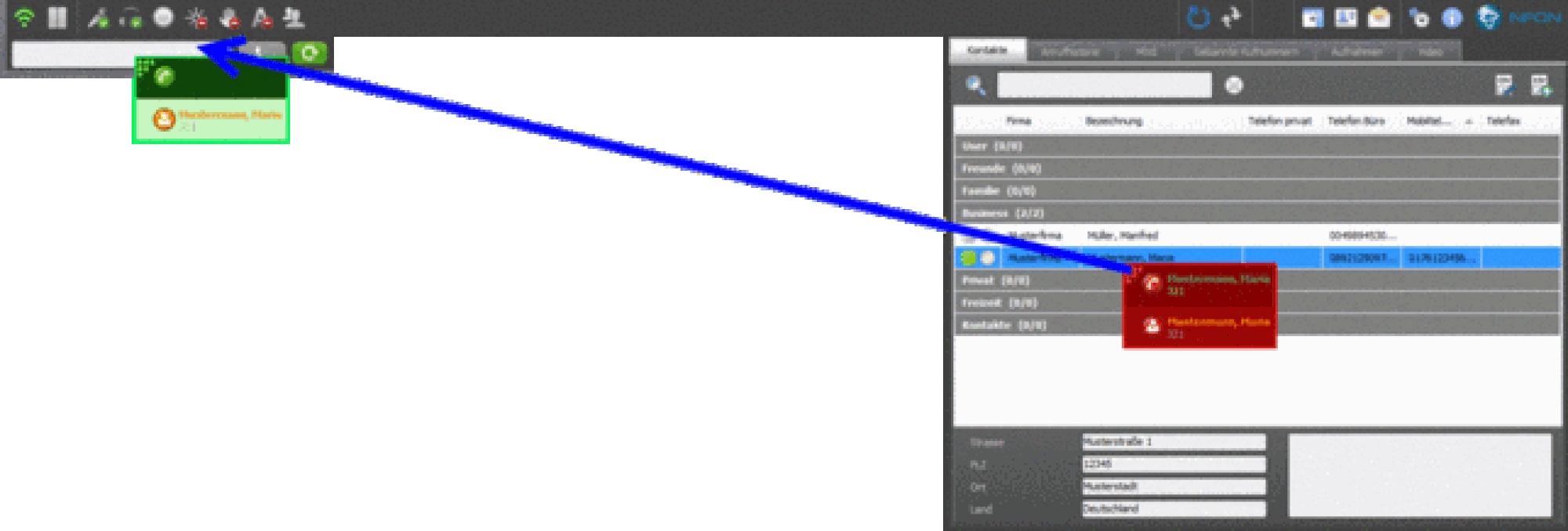 | If a contact is marked you will see the telephone numbers for the contact in a drop-down. Simply click the respective number and the call will be connected. | |
