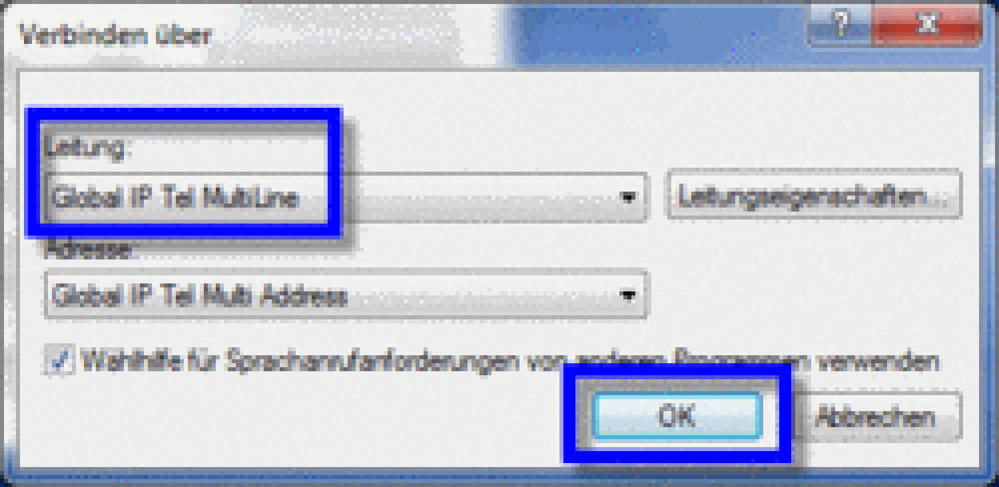 The "Connect Using" window opens. Please choose "Global IP Tel MultiLine" as line and confirm your settings with "OK".