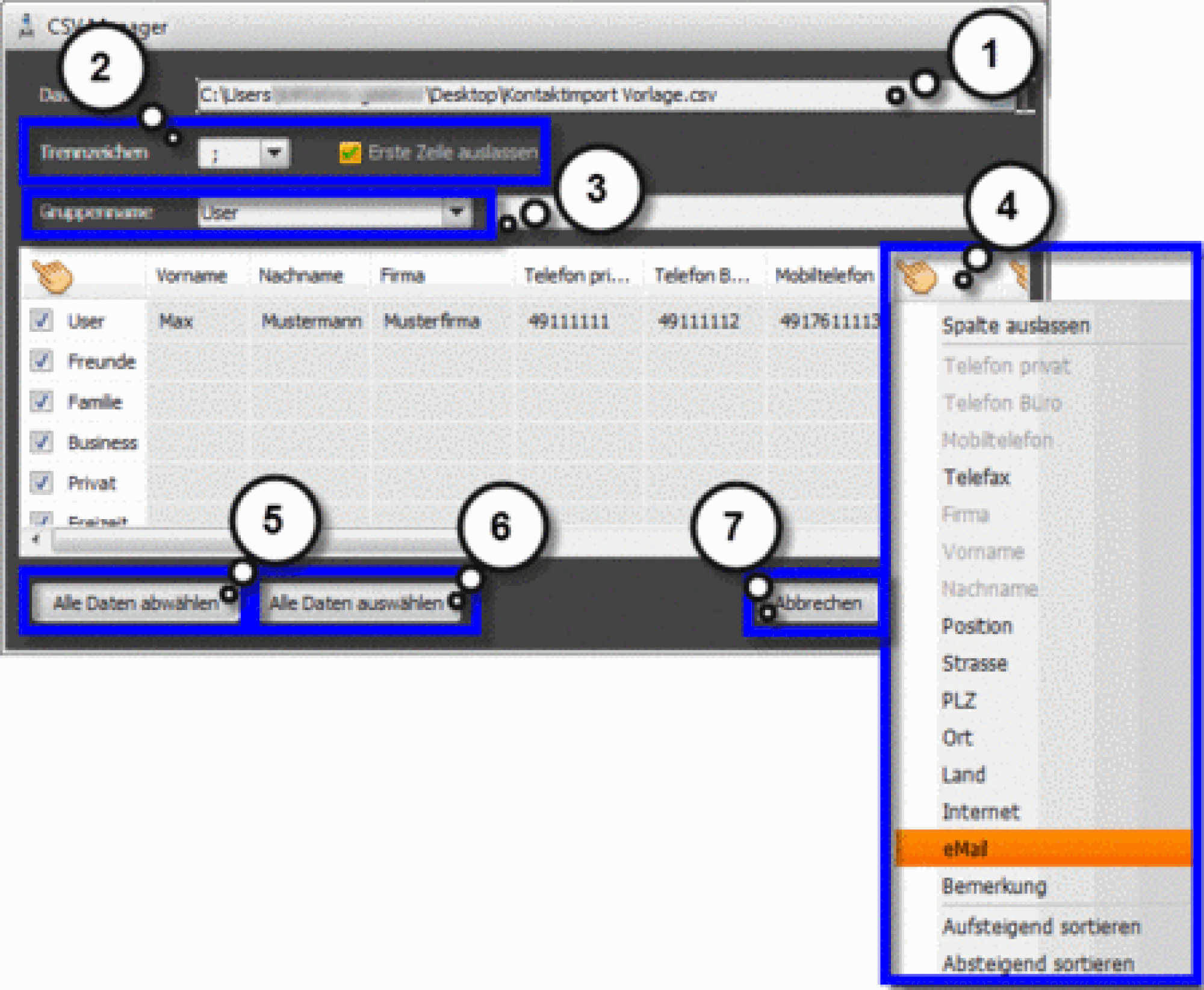 Export and import of contacts via CSV file