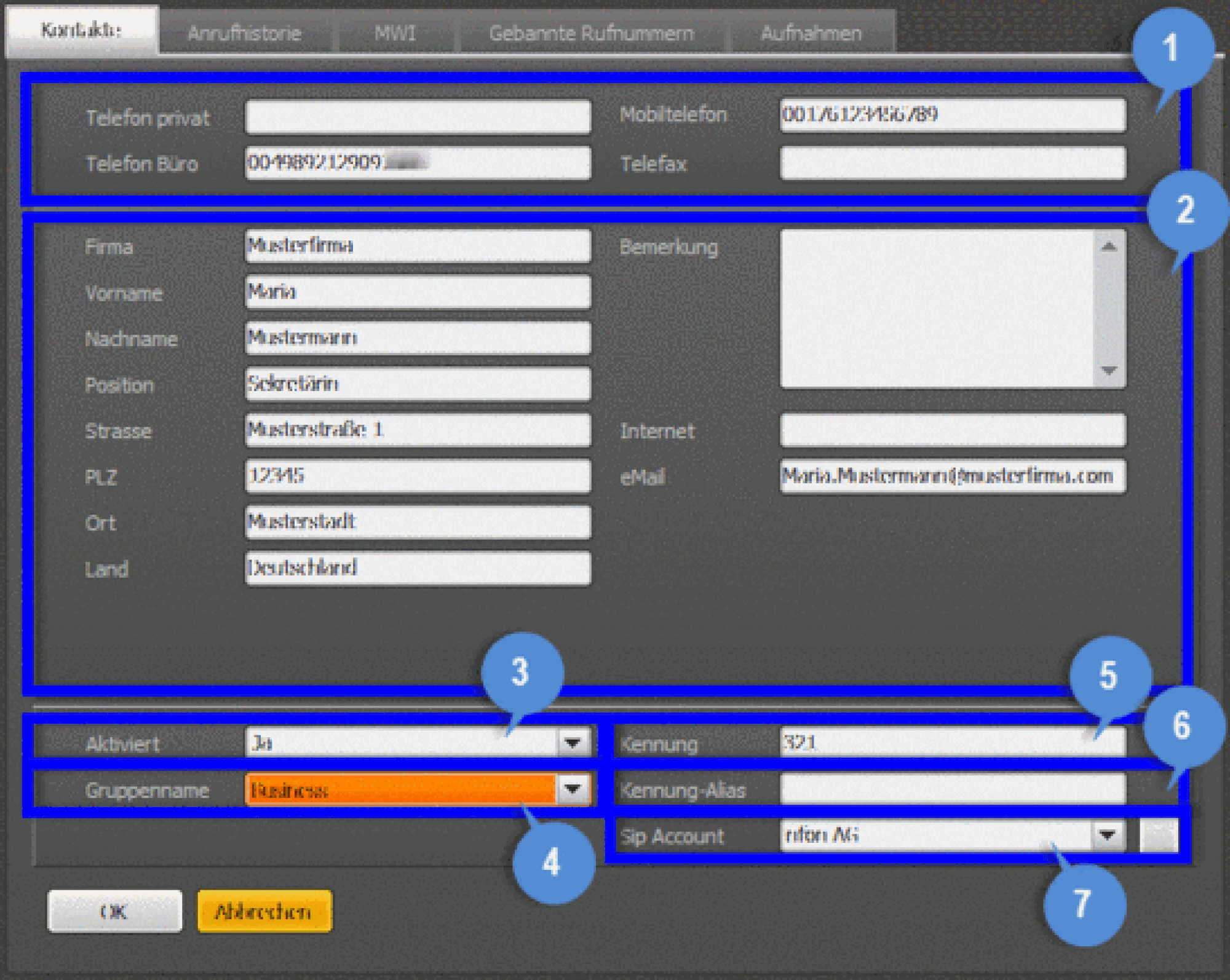 will open the respective Outlook contact for the caller. If there is no existing address book entry a blank contact form will be shown to add the new contact by clicking the phone number in the call monitor